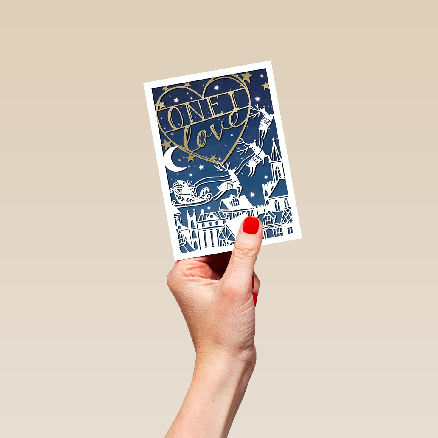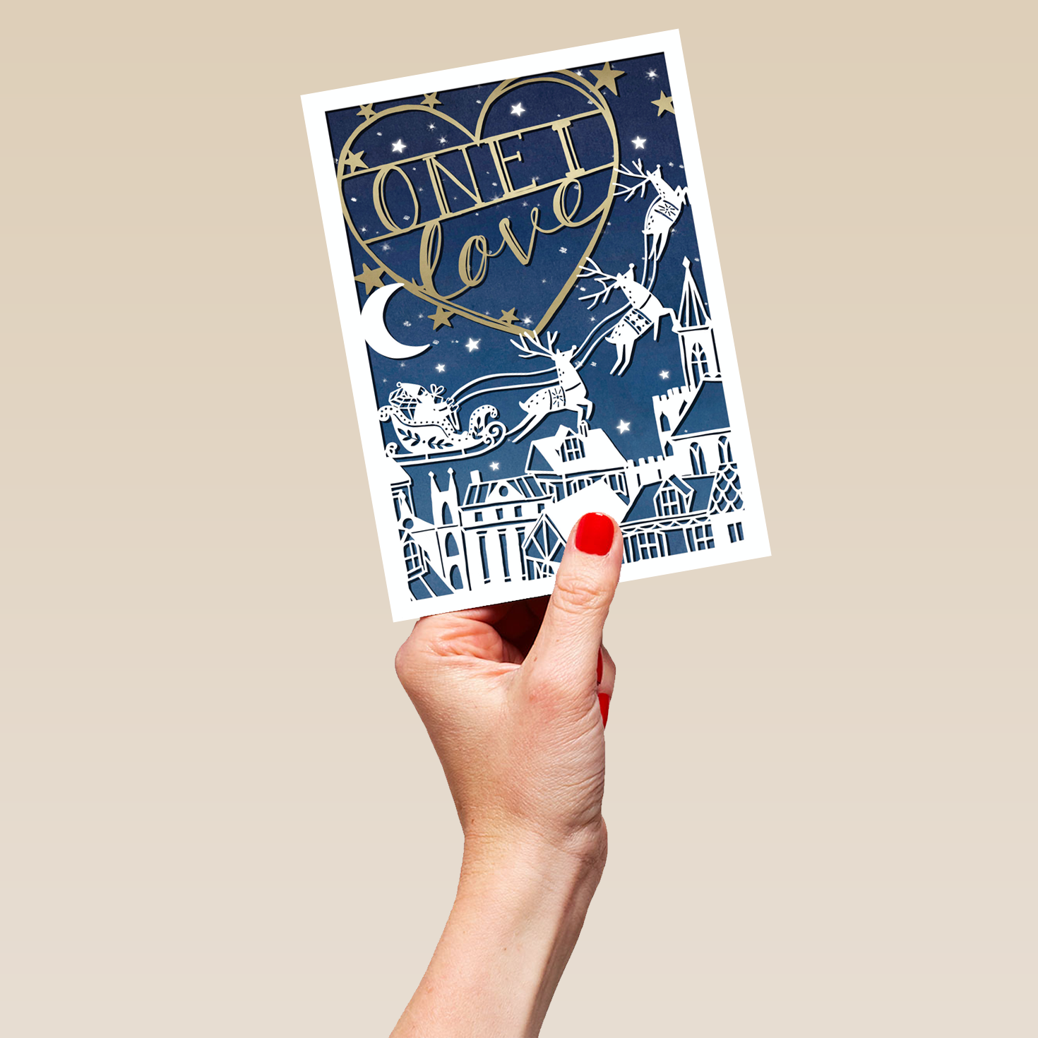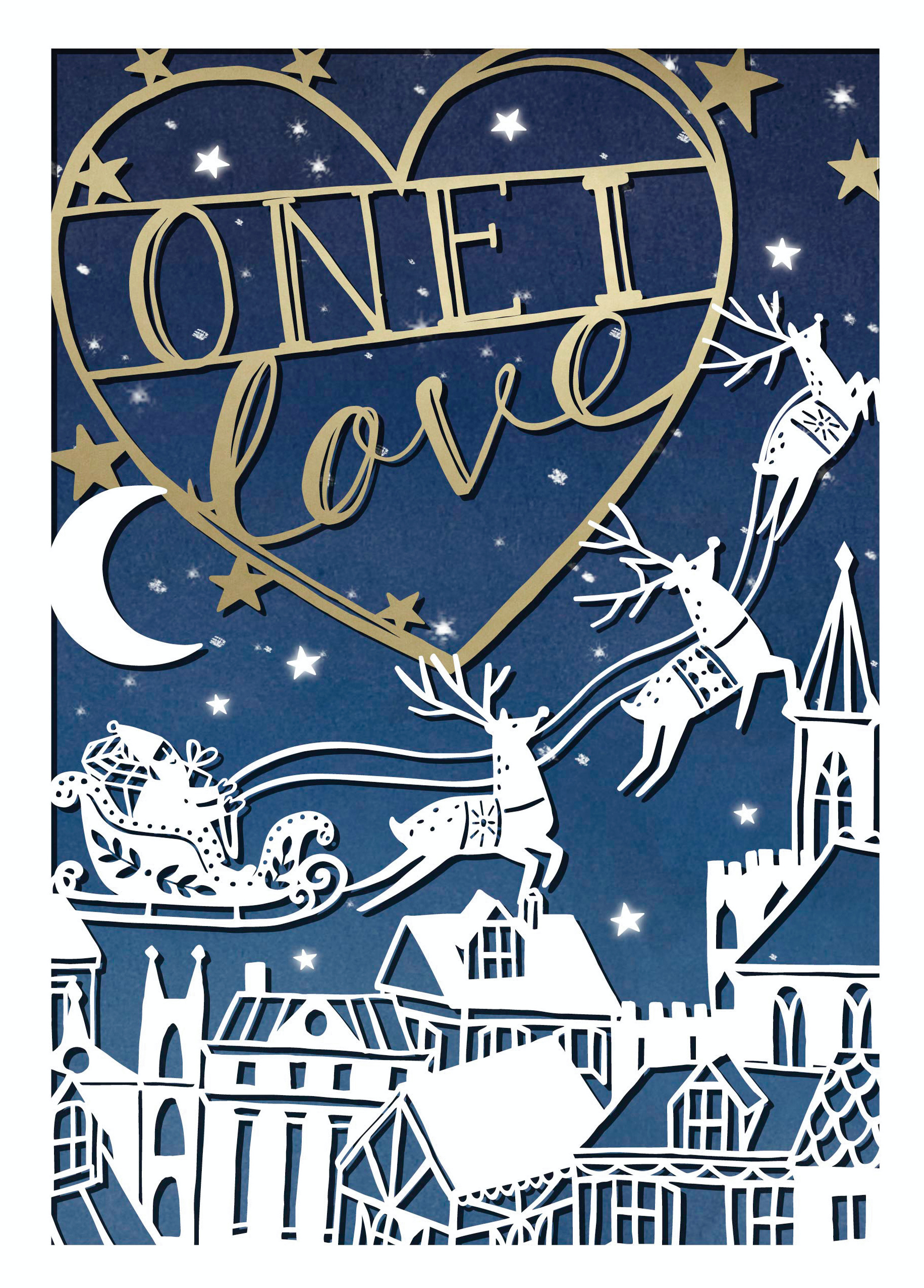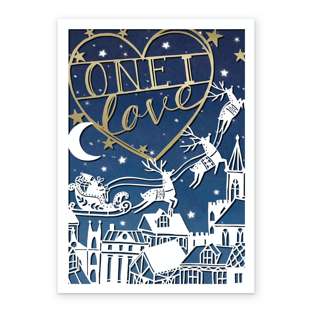 Show them you care with a personalised one I love Santa sleigh rooftops Christmas card from Hallmark. Our greetings cards are printed on premium quality, FSC®-certified card & delivered nationwide. This card is available as standard 12cm by 16.7cm and large 15.5cm by 21.6cm.