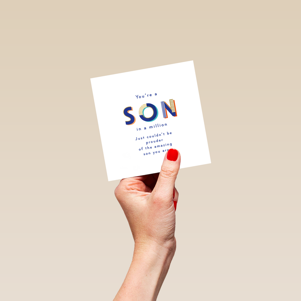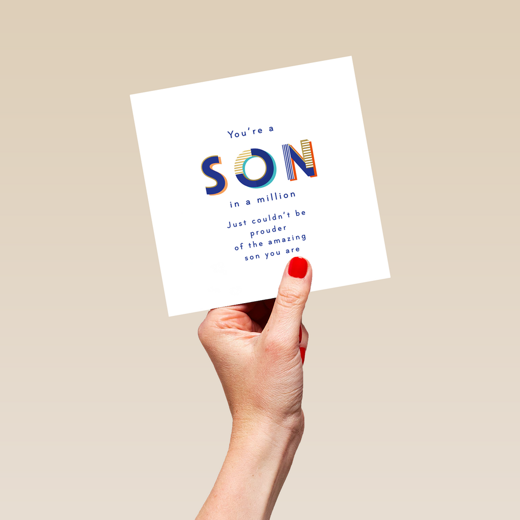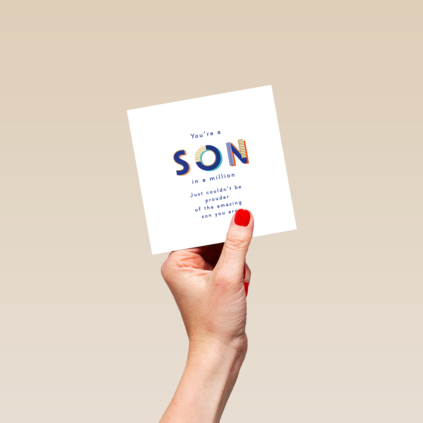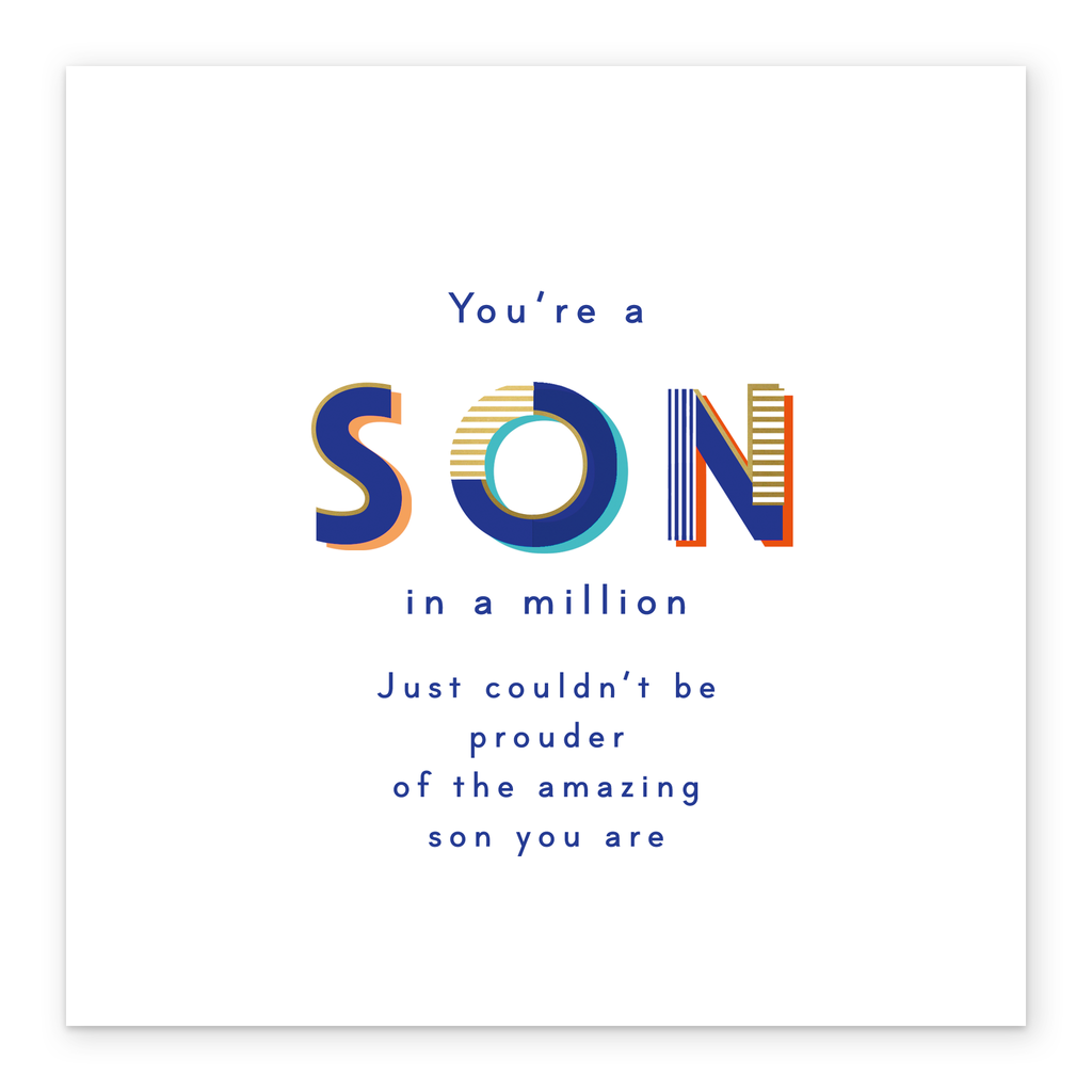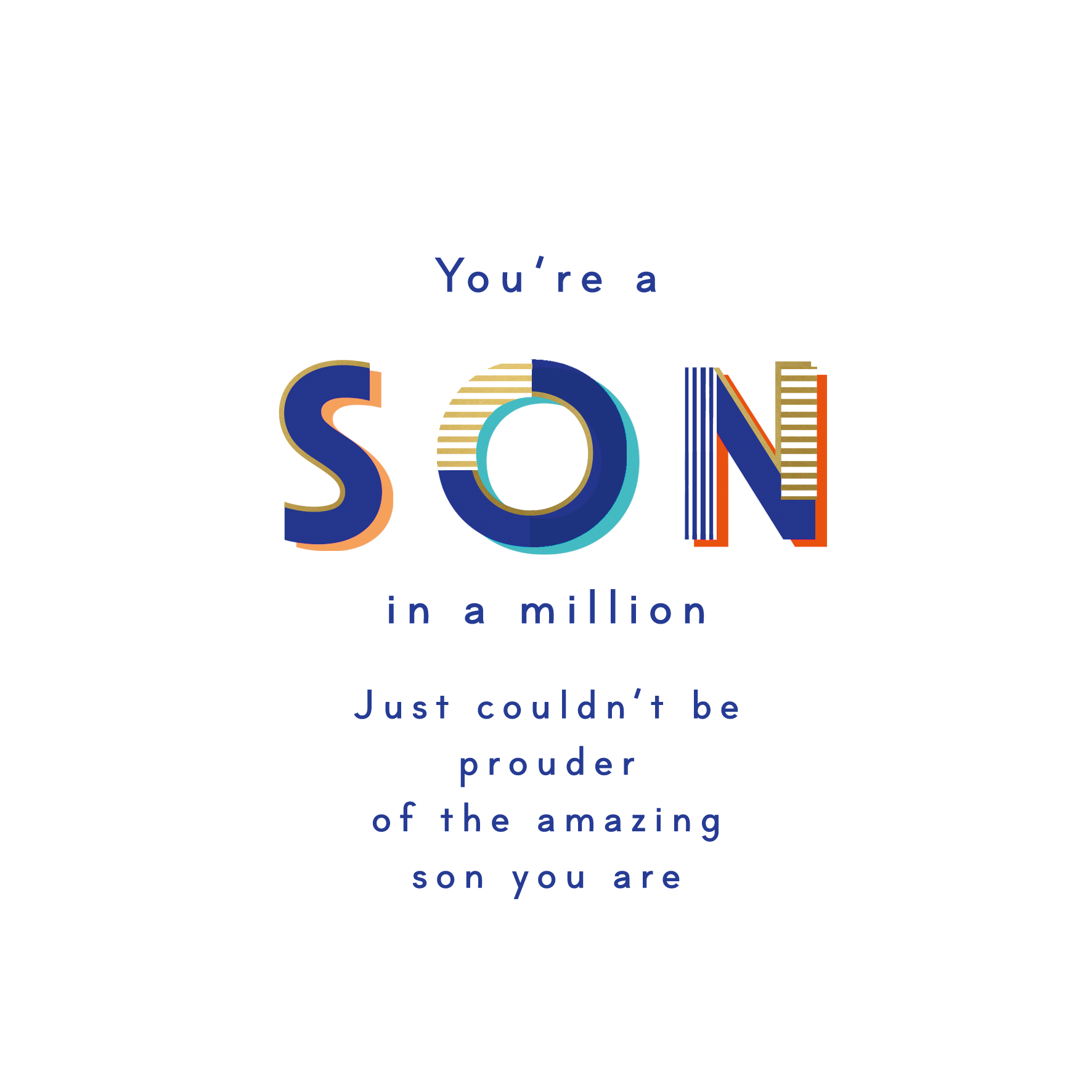 Printed on premium-quality board, this card features fun typography design, with the message 'You're A Son In A Million Just Couldn't Be Prouder Of The Amazing Son You Are.', and comes complete with a co-ordinating white envelope.