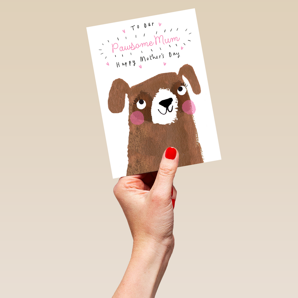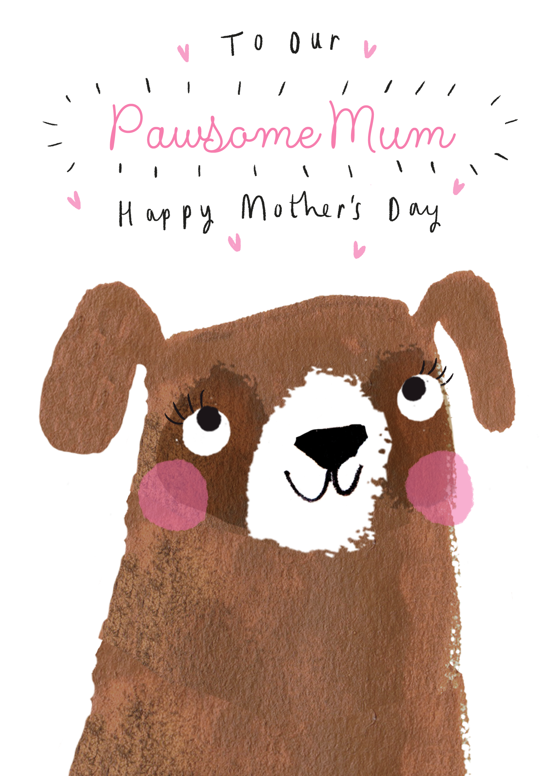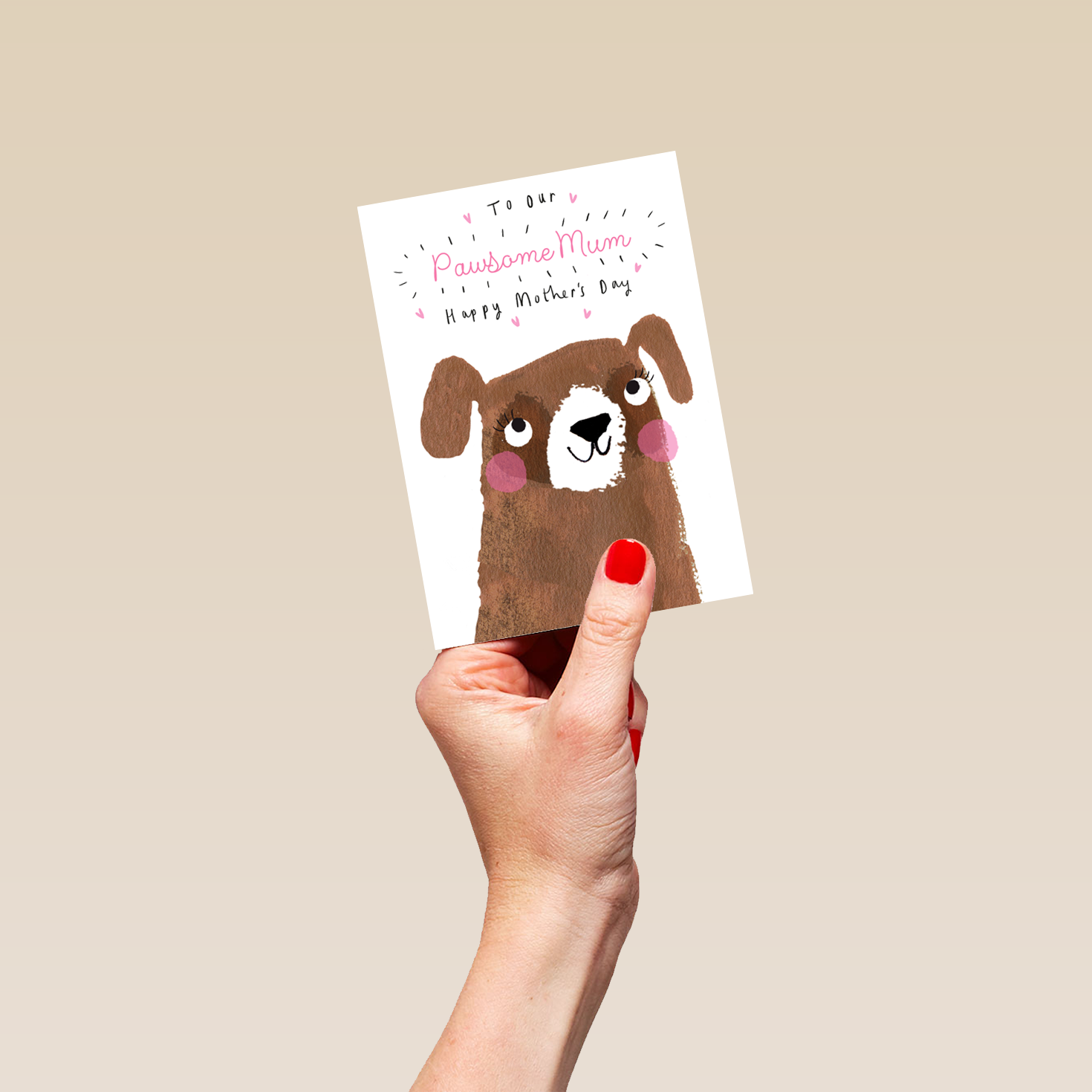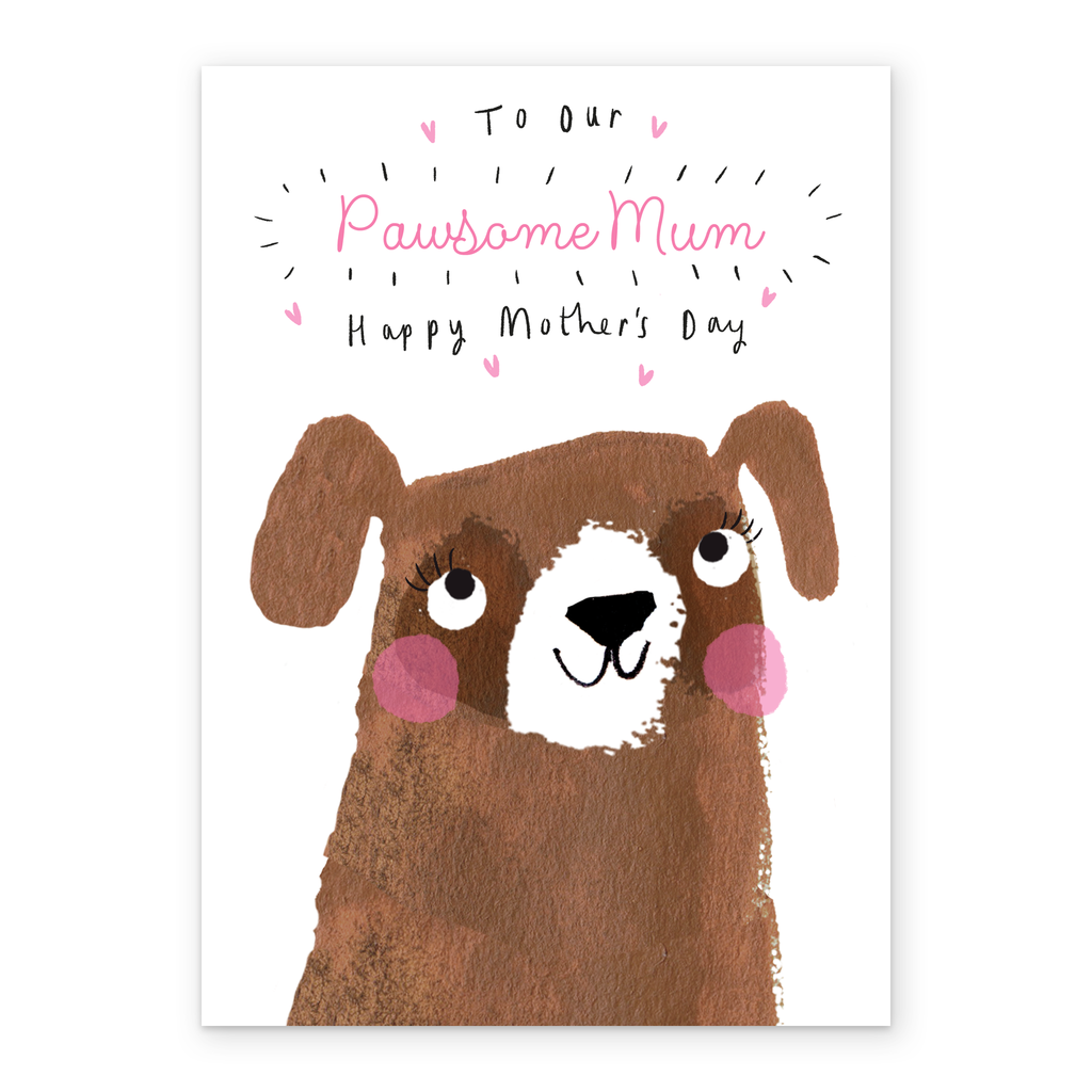 Printed on premium-quality board, this card features a cute illustrated puppy, on a white background, with the message 'To our pawsome Mum Happy Mother's Day', space to personalise a name, and comes complete with a co-ordinating white envelope.