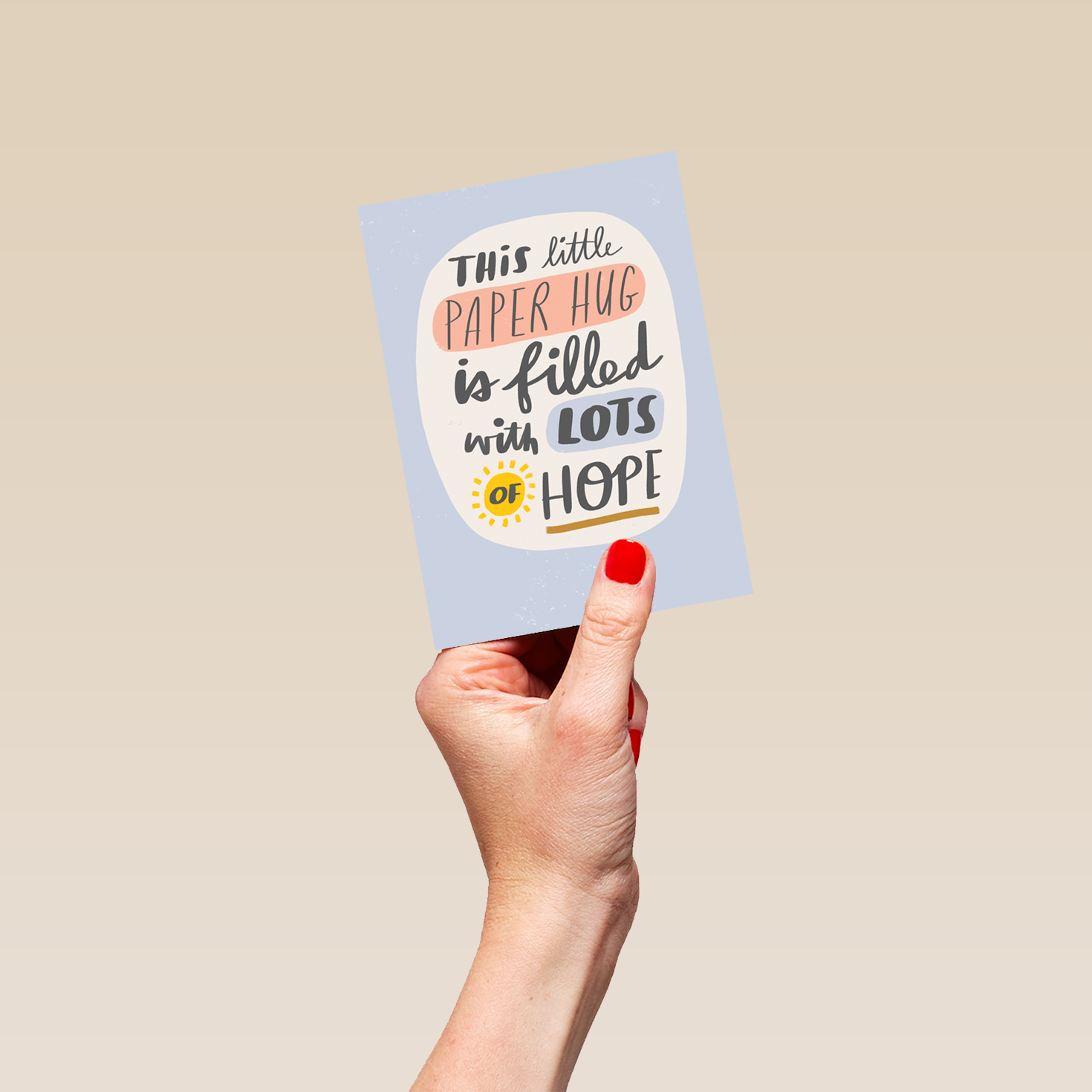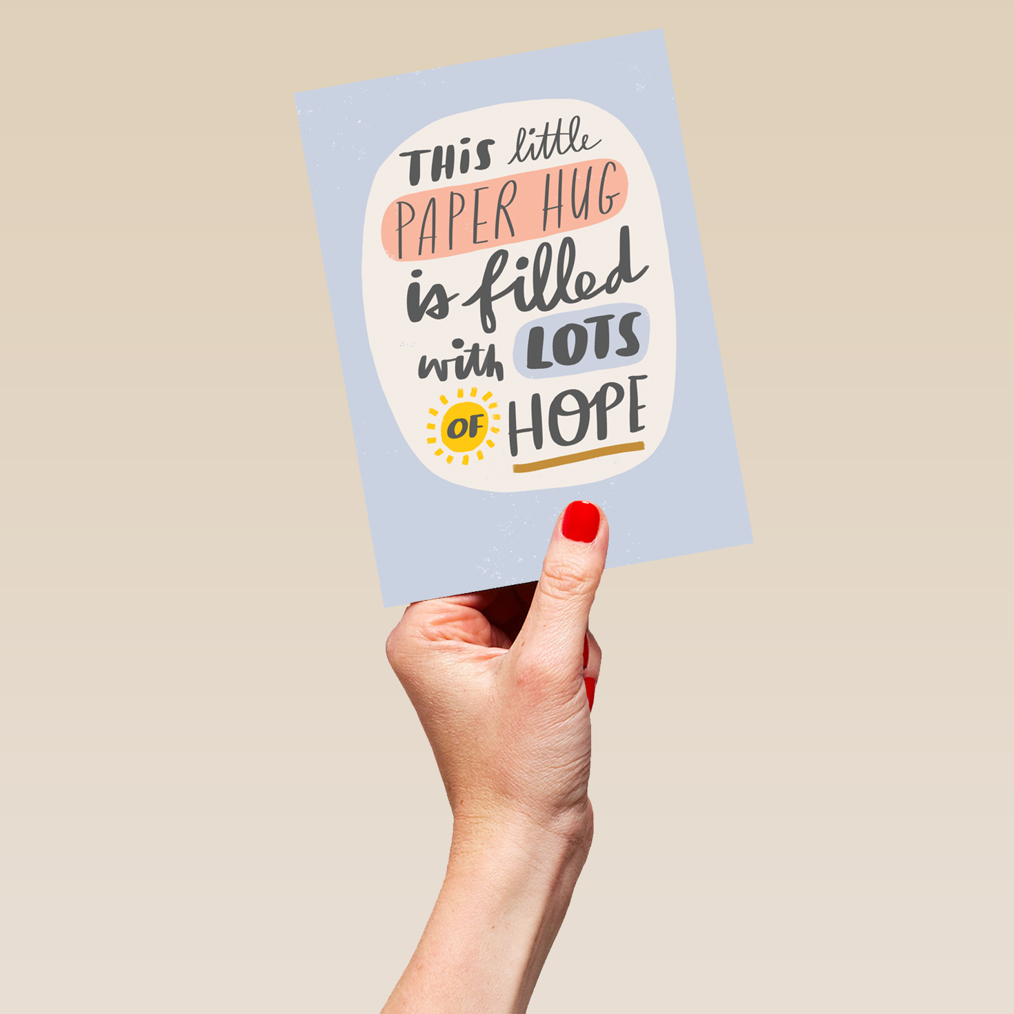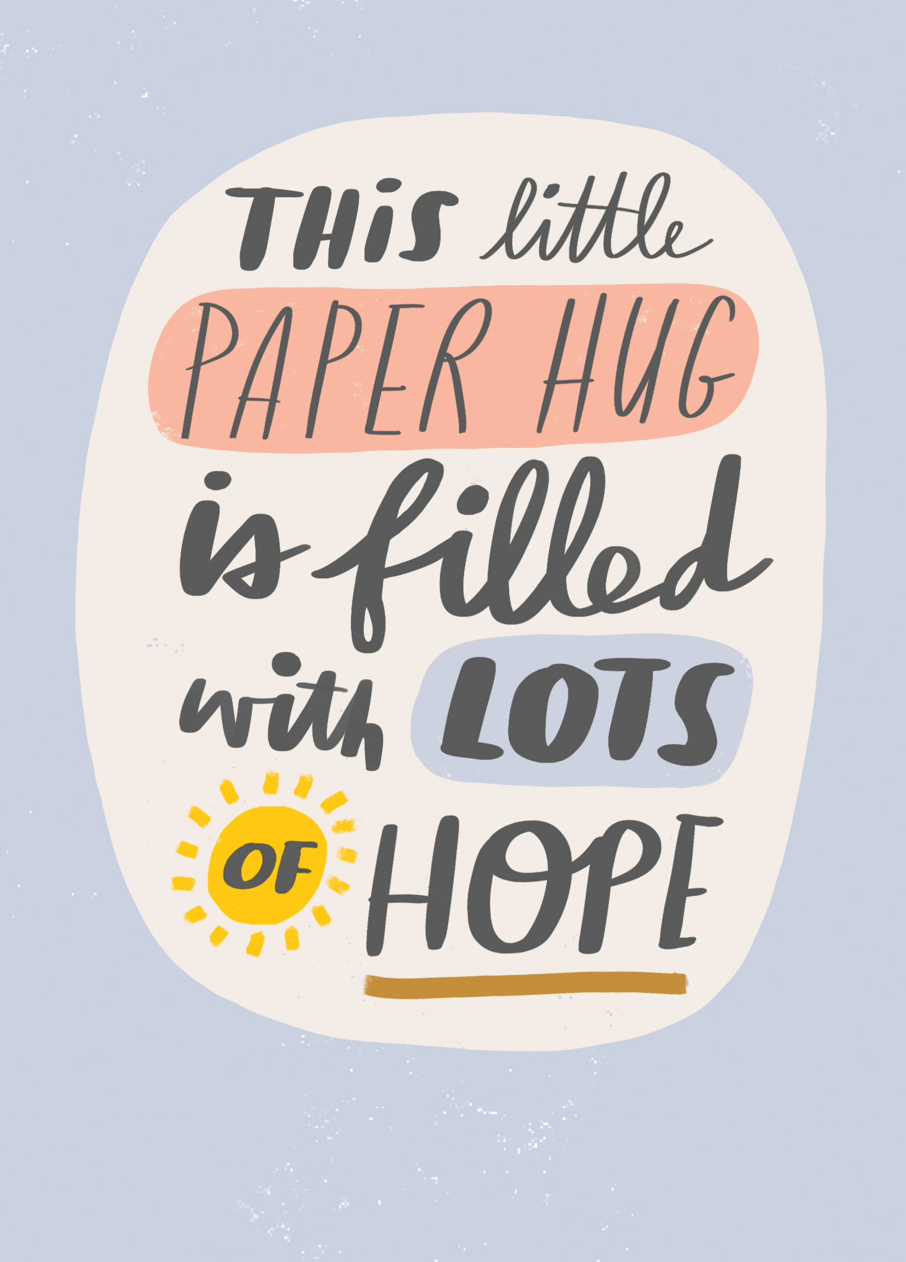 Printed on premium-quality board, this card features a blue background with hand-writing styled typography and a sun, with the message 'This little paper hug is filled with lots of hope', and comes complete with a co-ordinating white envelope.