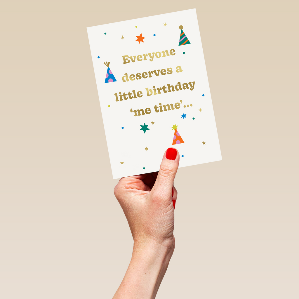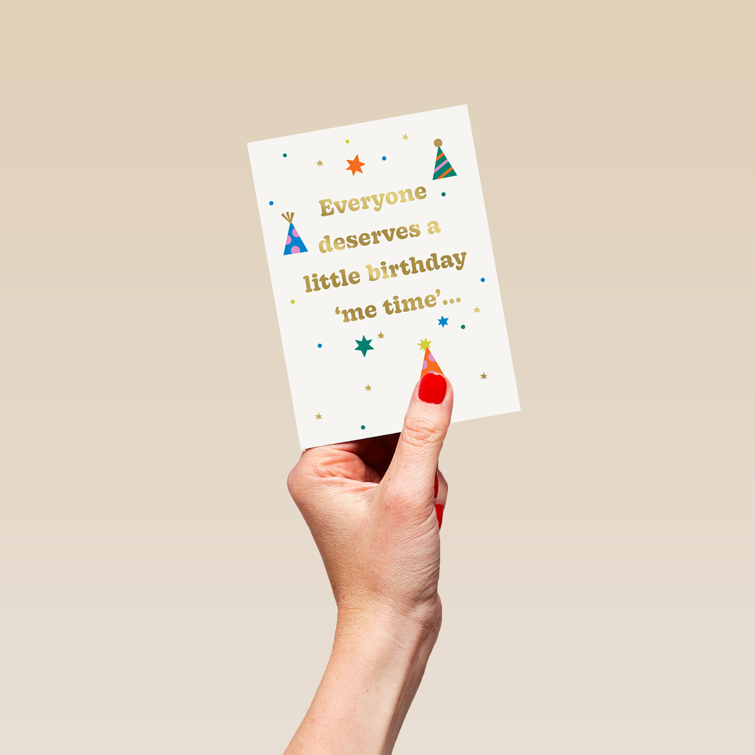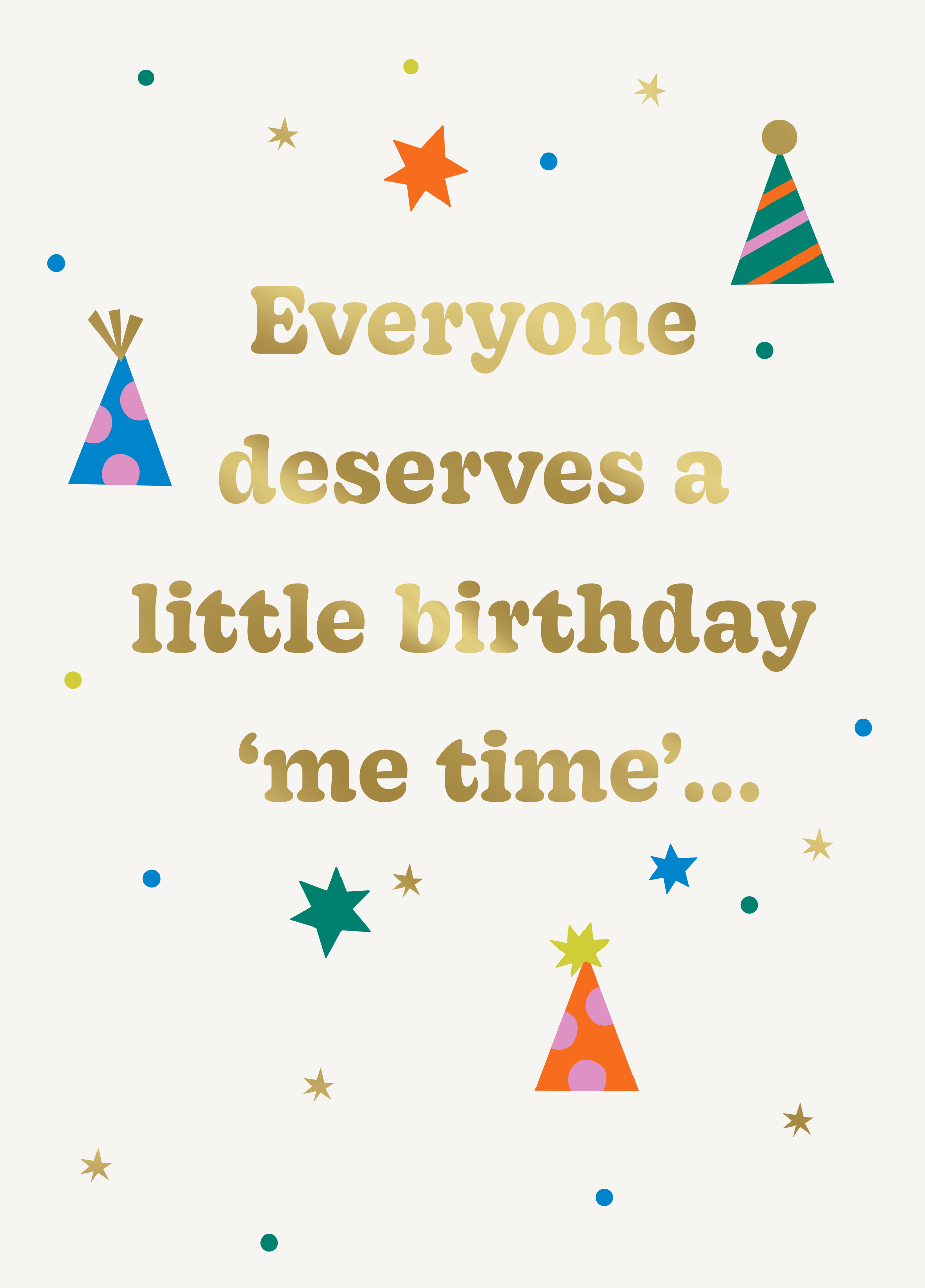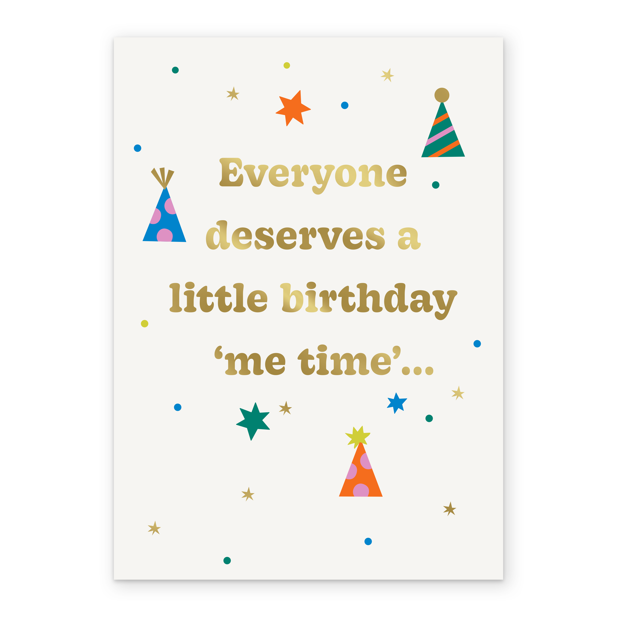 Printed on premium-quality board, this card features a white background with party hats and stars, with the message 'Everyone deserves a little birthday 'me time'…', and comes complete with a co-ordinating white envelope.