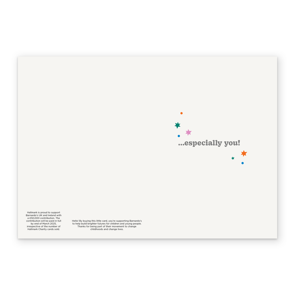 Hello! By buying this little card, you're supporting Barnardo's to help build brighter futures for children and young people. Thanks for being part of their movement to change childhoods and change lives.