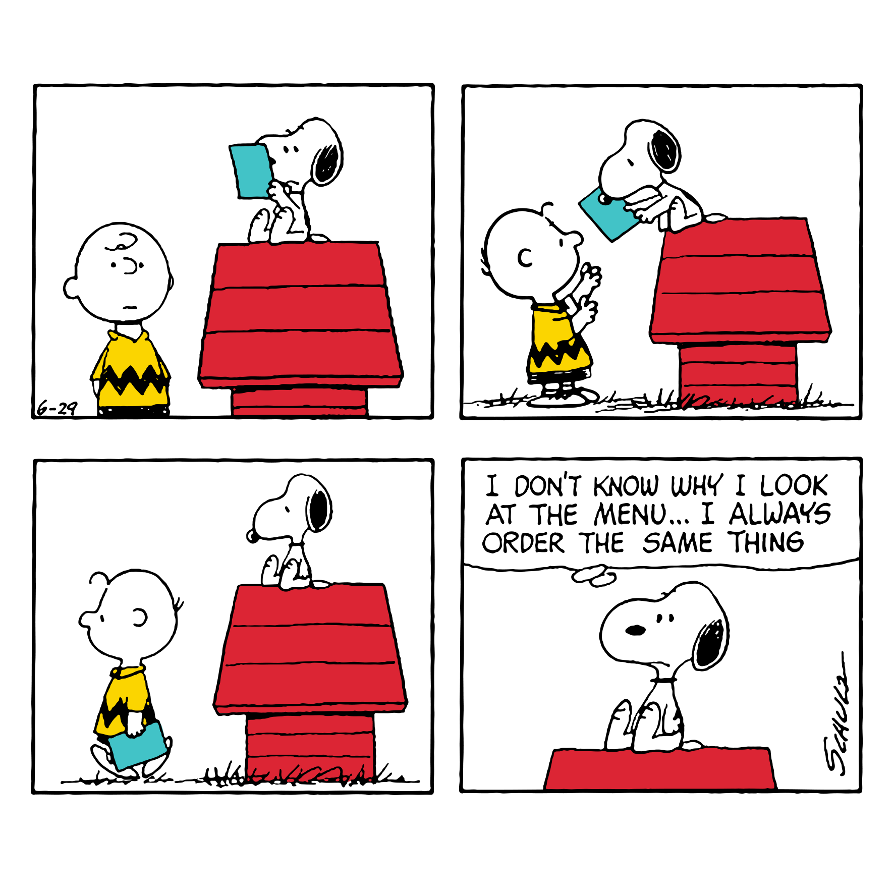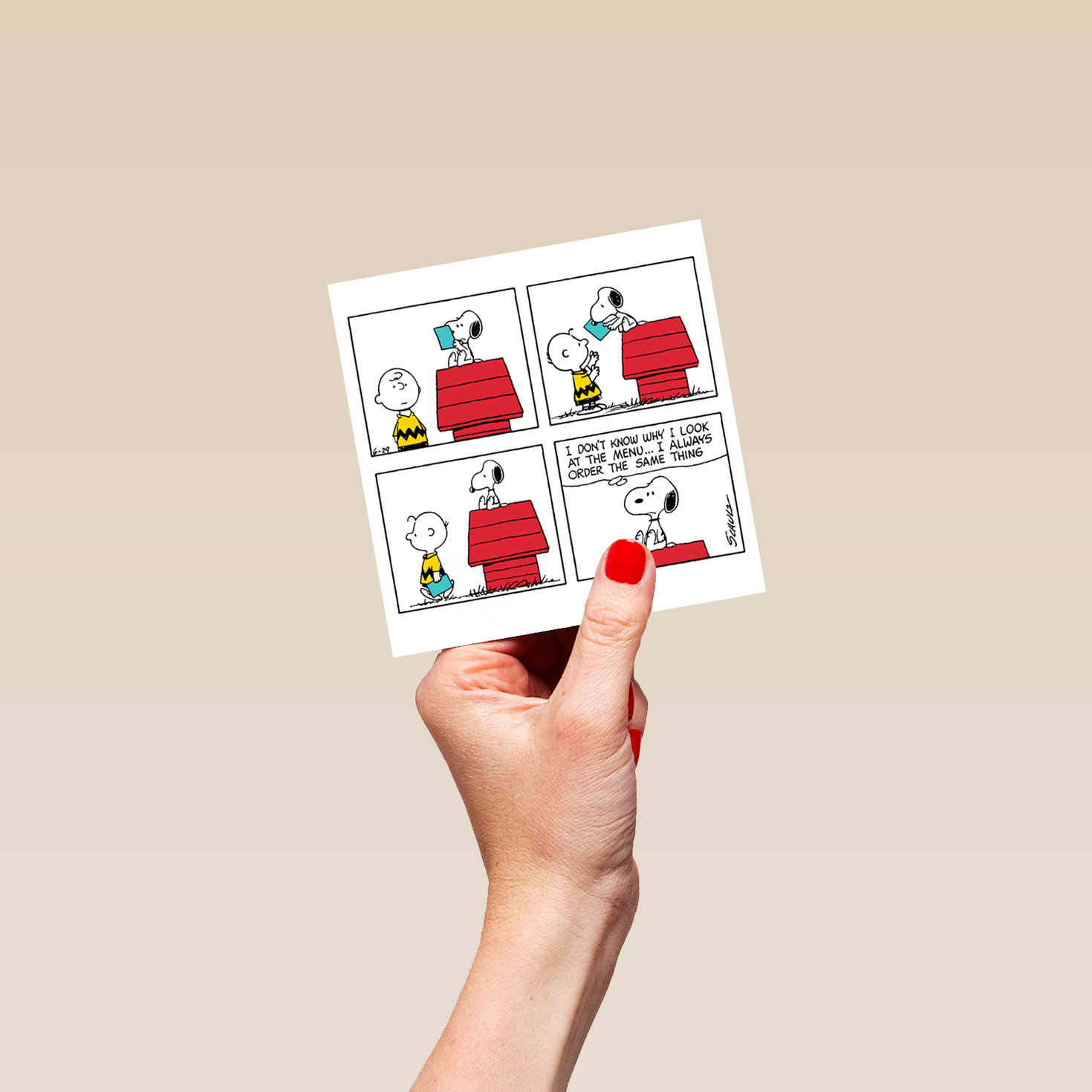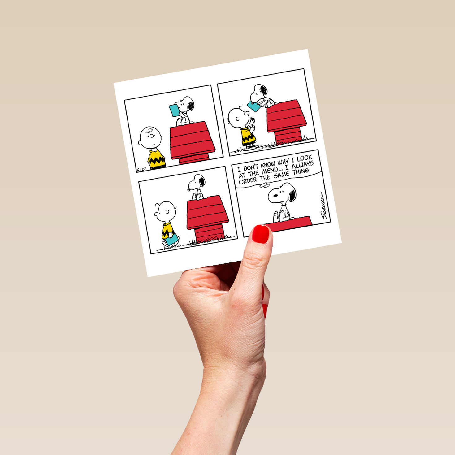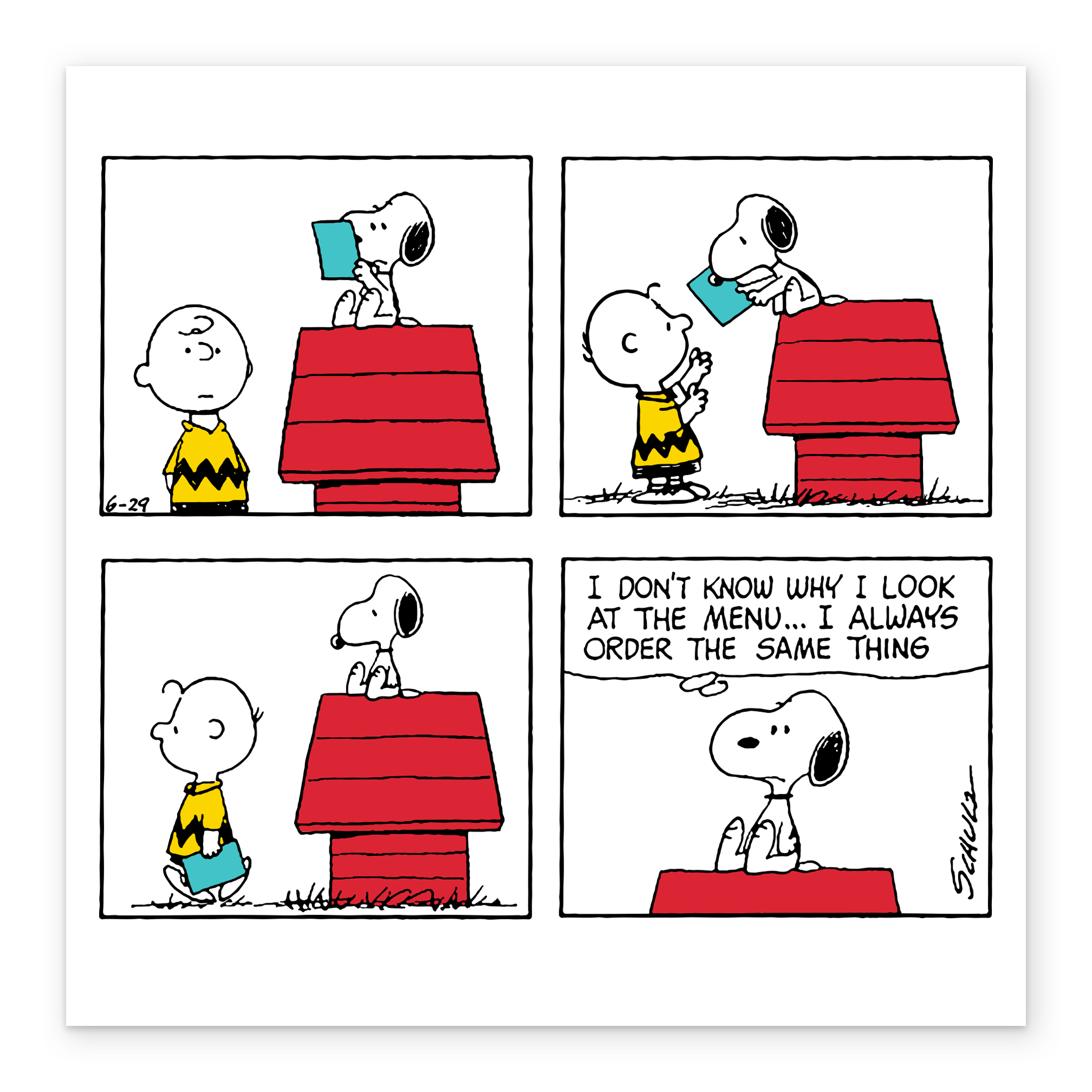Printed on premium-quality board, this card features a four panel cartoon showing Charlie Brown and SNOOPY, with SNOOPY reading something before handing it back to Charlie Brown, and a thought bubble in the final frame with black lettering , with the message 'I don't know why I look at the menu… I always order the same thing', and comes complete with a co-ordinating white envelope.