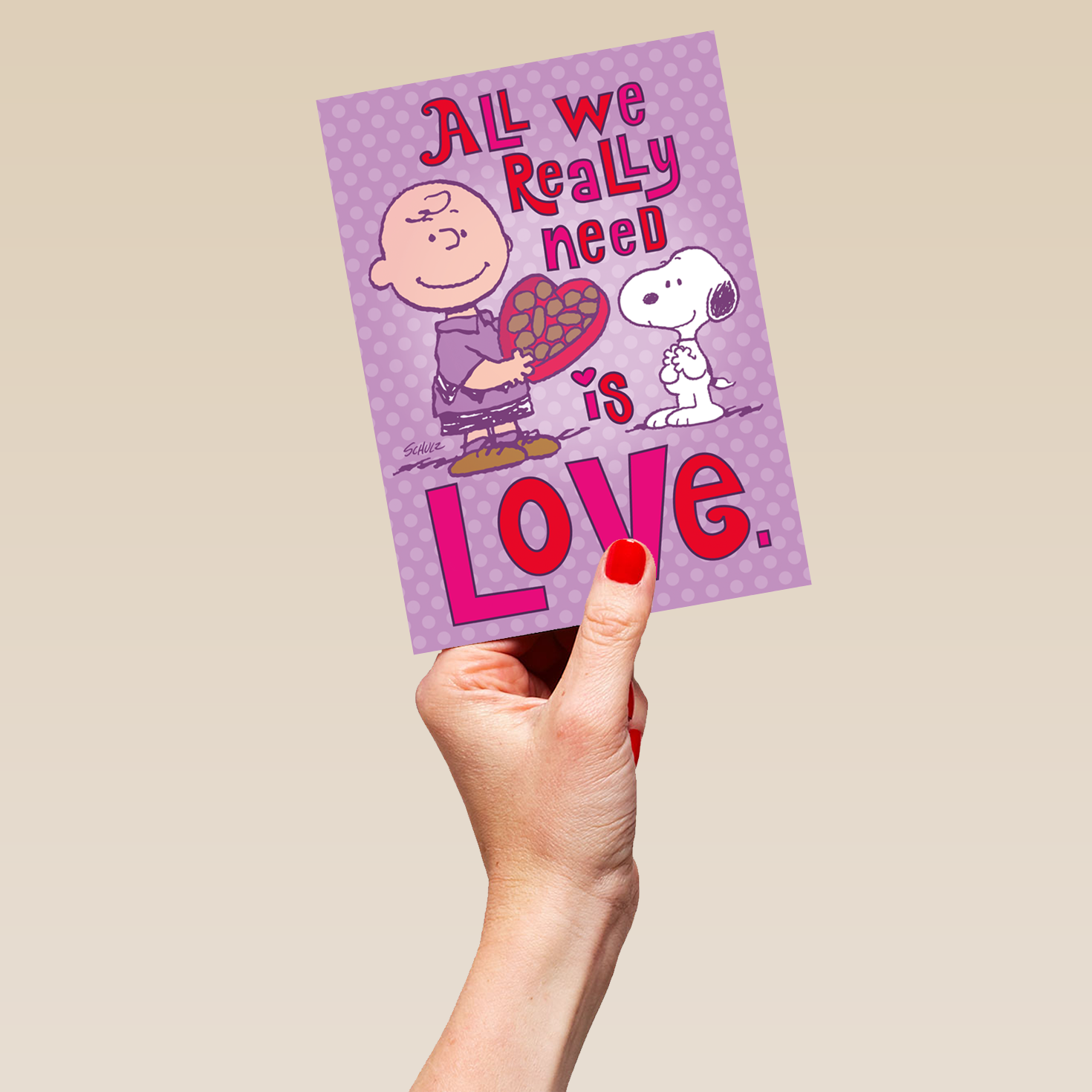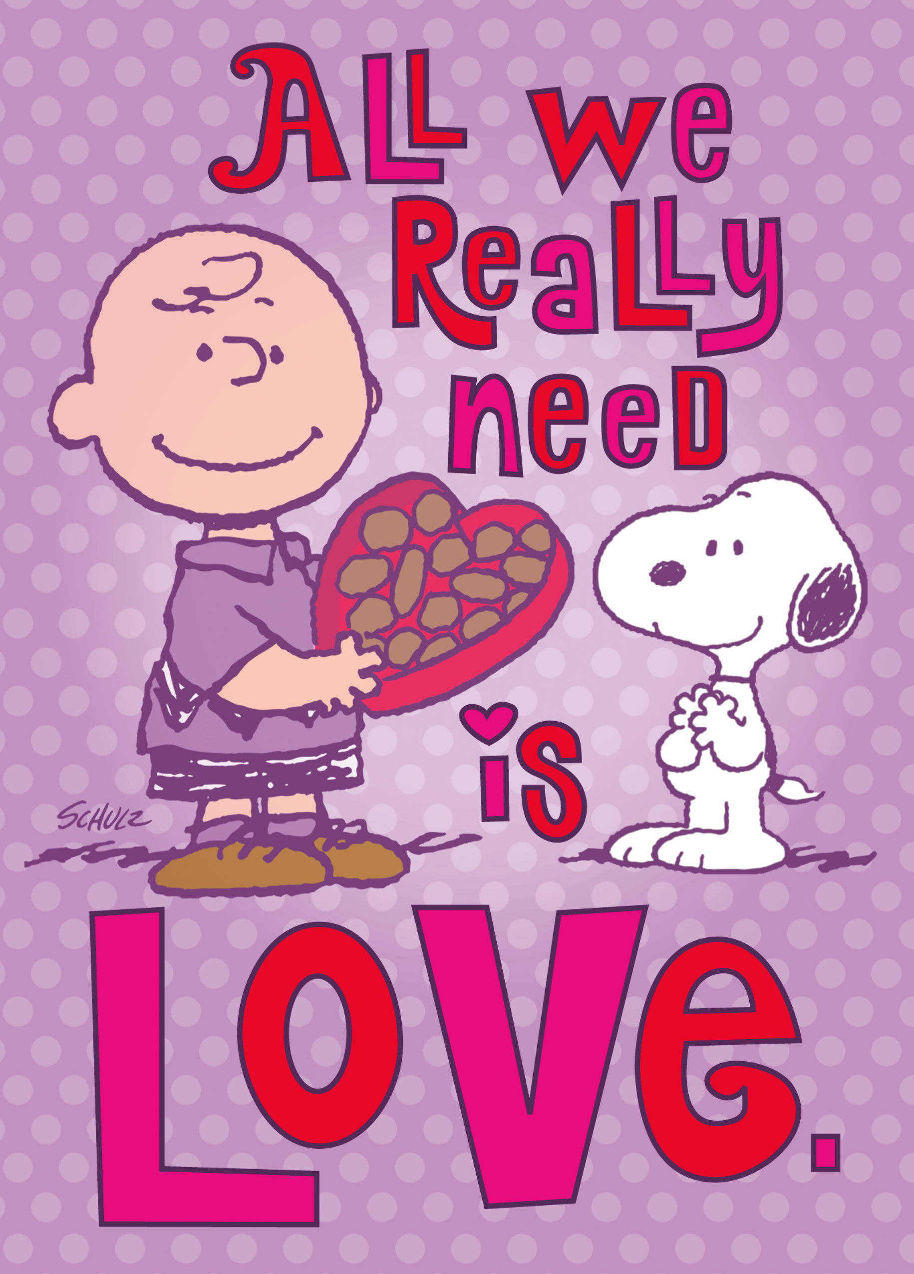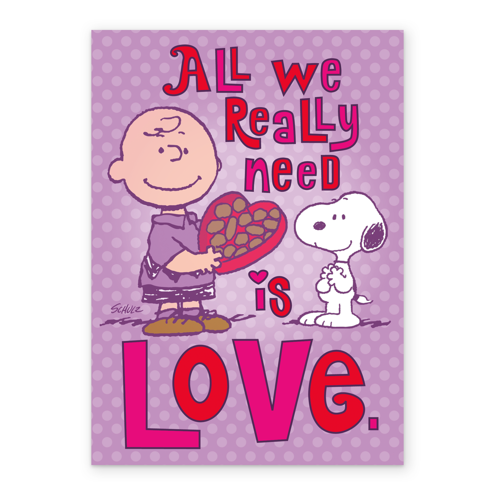 Printed on premium-quality board, this card features Charlie Brown and SNOOPY with a heart-shaped box of chocolates, set against a purple spotty background , in amongst retro style, pink and red ombre lettering, with the message 'All we really need is love.', and comes complete with a co-ordinating white envelope.