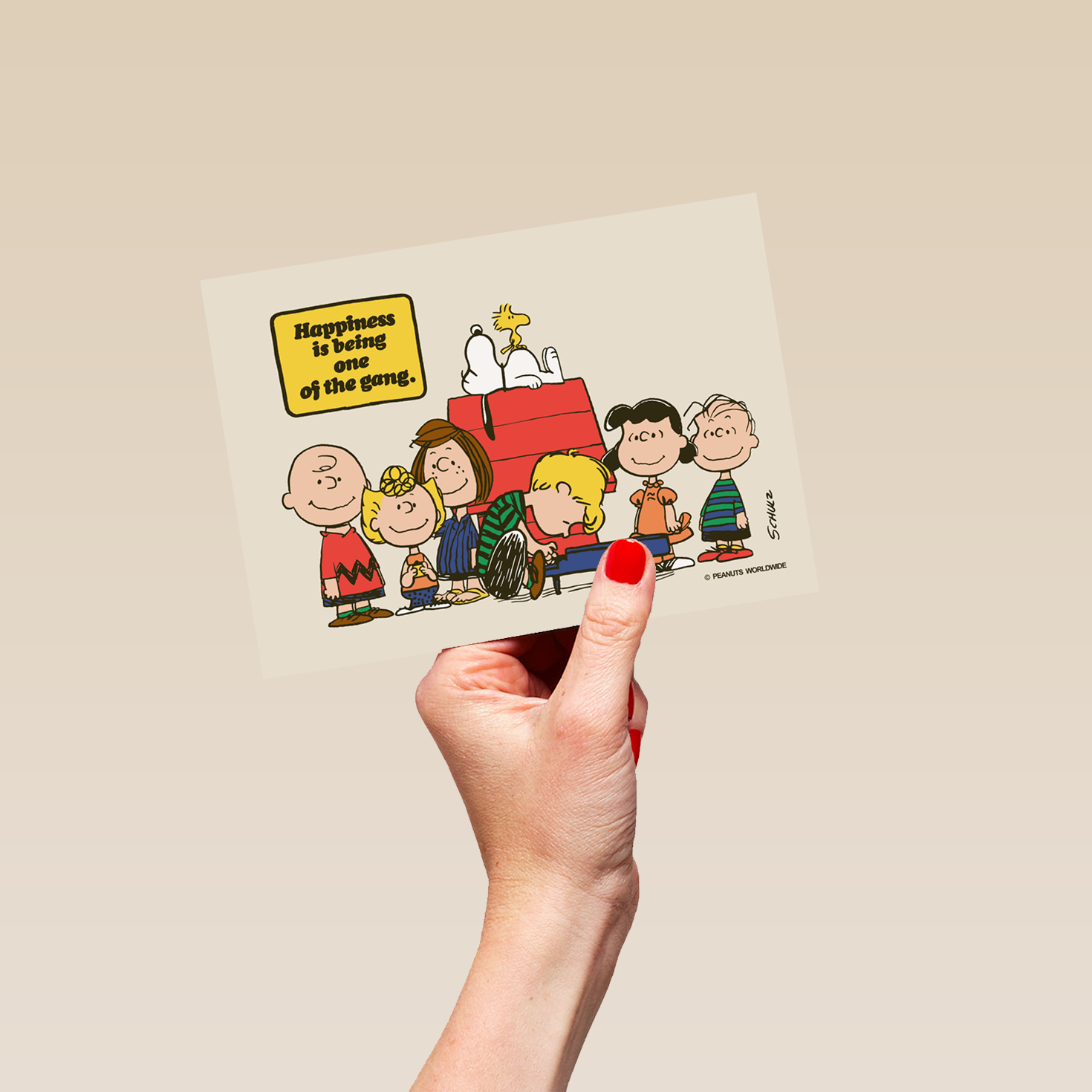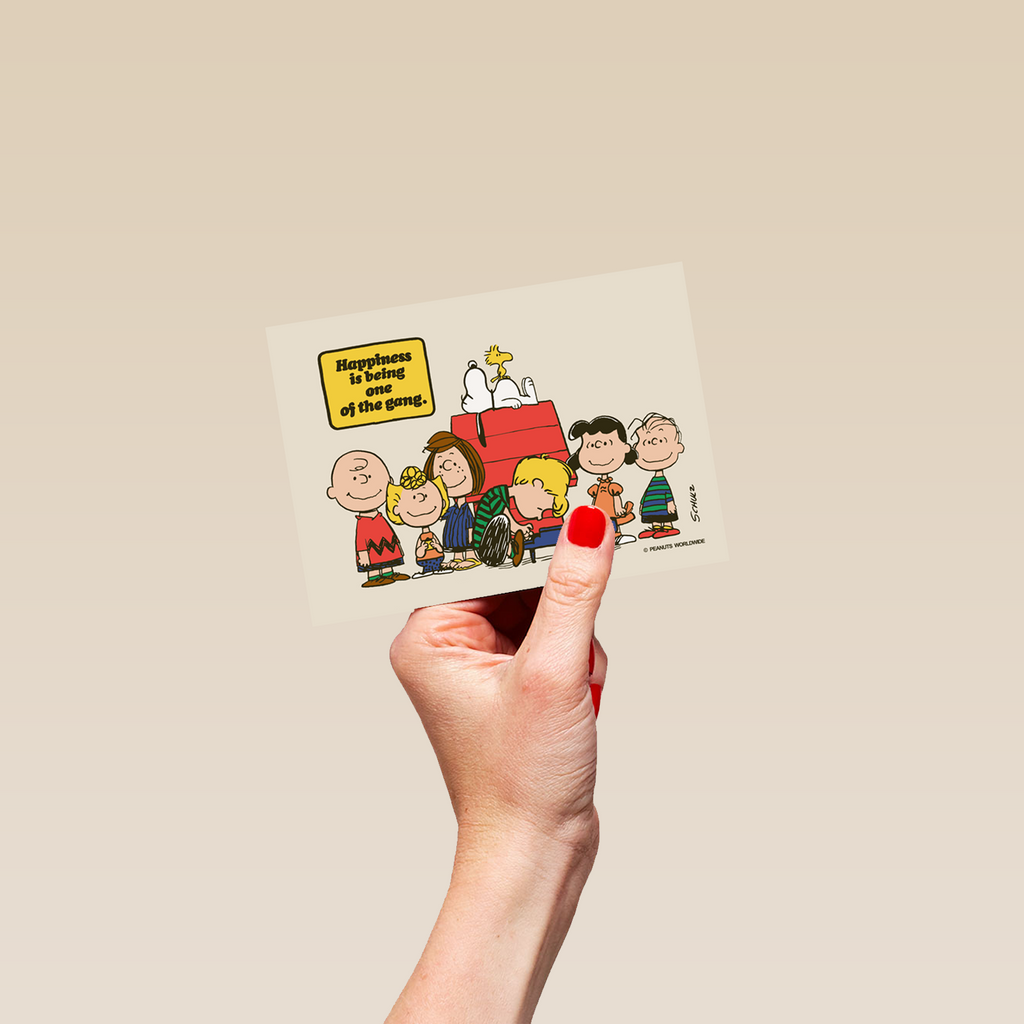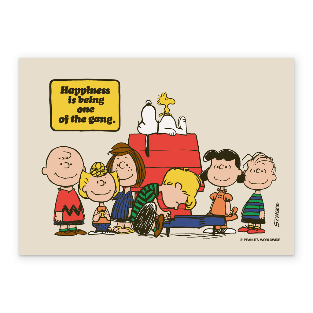 Printed on premium-quality board, this card features a colourful illustration of the PEANUTS™ gang gathered around Snoopy's dog house wearing large smiles as Snoopy lies on top of his kennel with Woodstock perched upon his tummy and a yellow caption box, with the message 'Happiness is being one of the gang.', and comes complete with a co-ordinating white envelope.