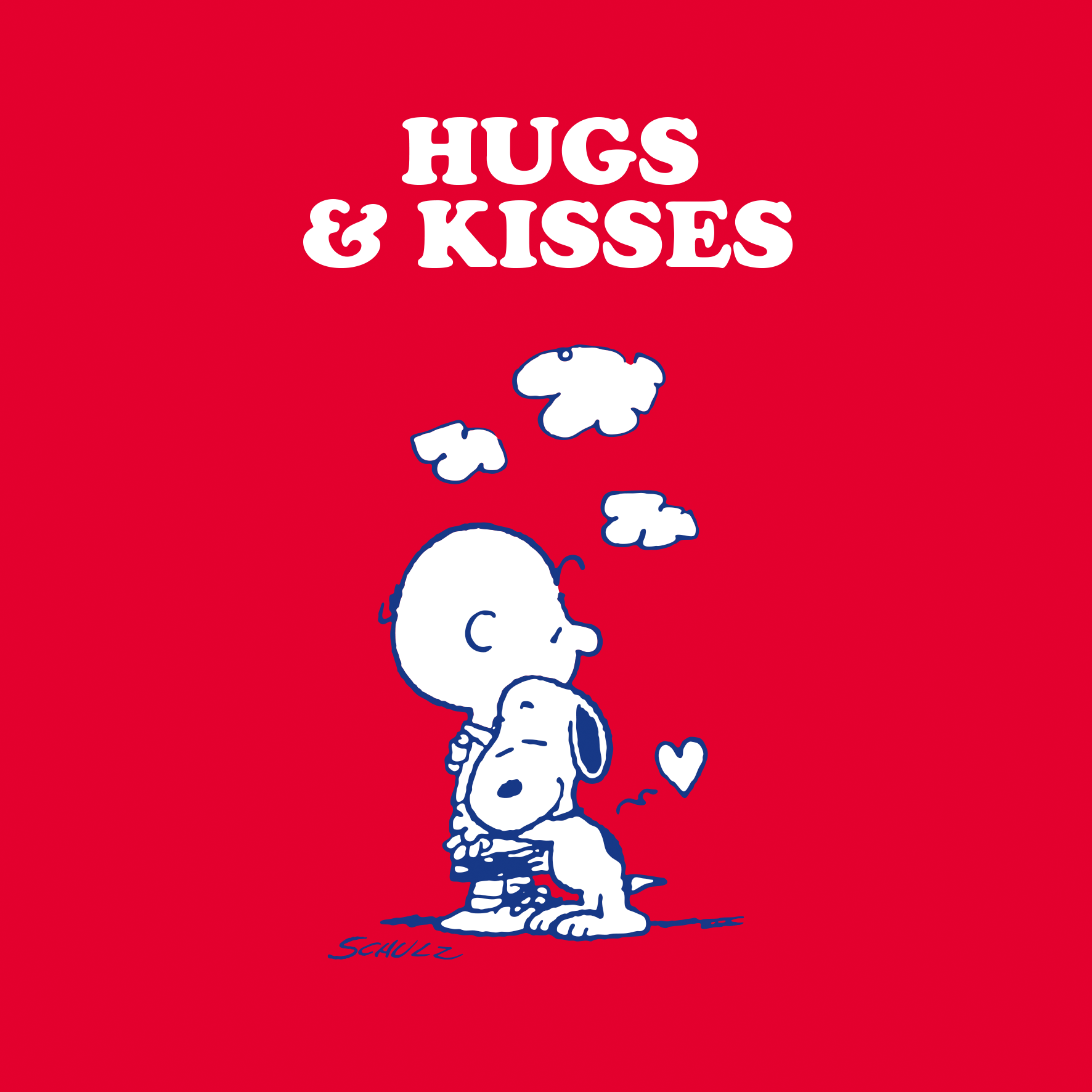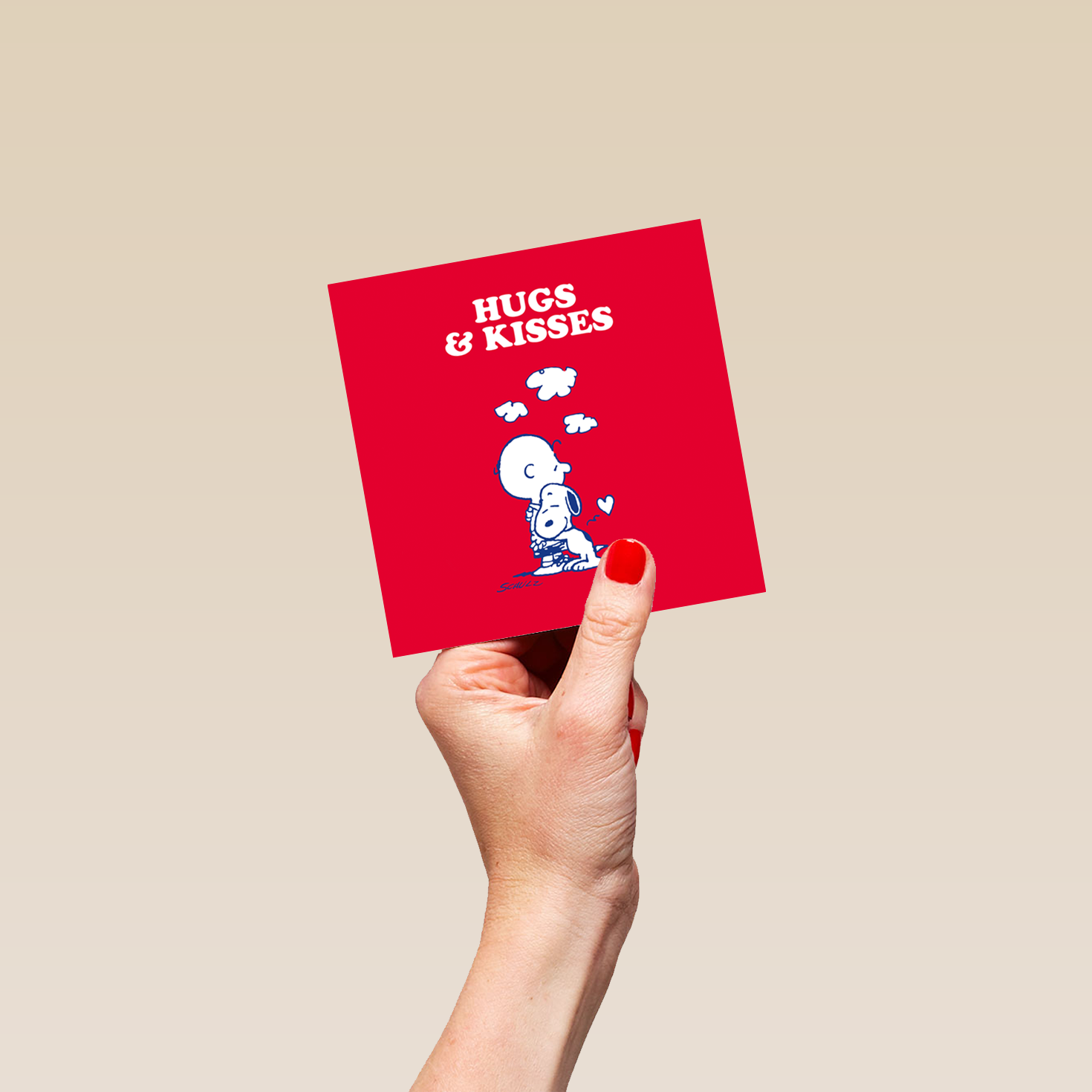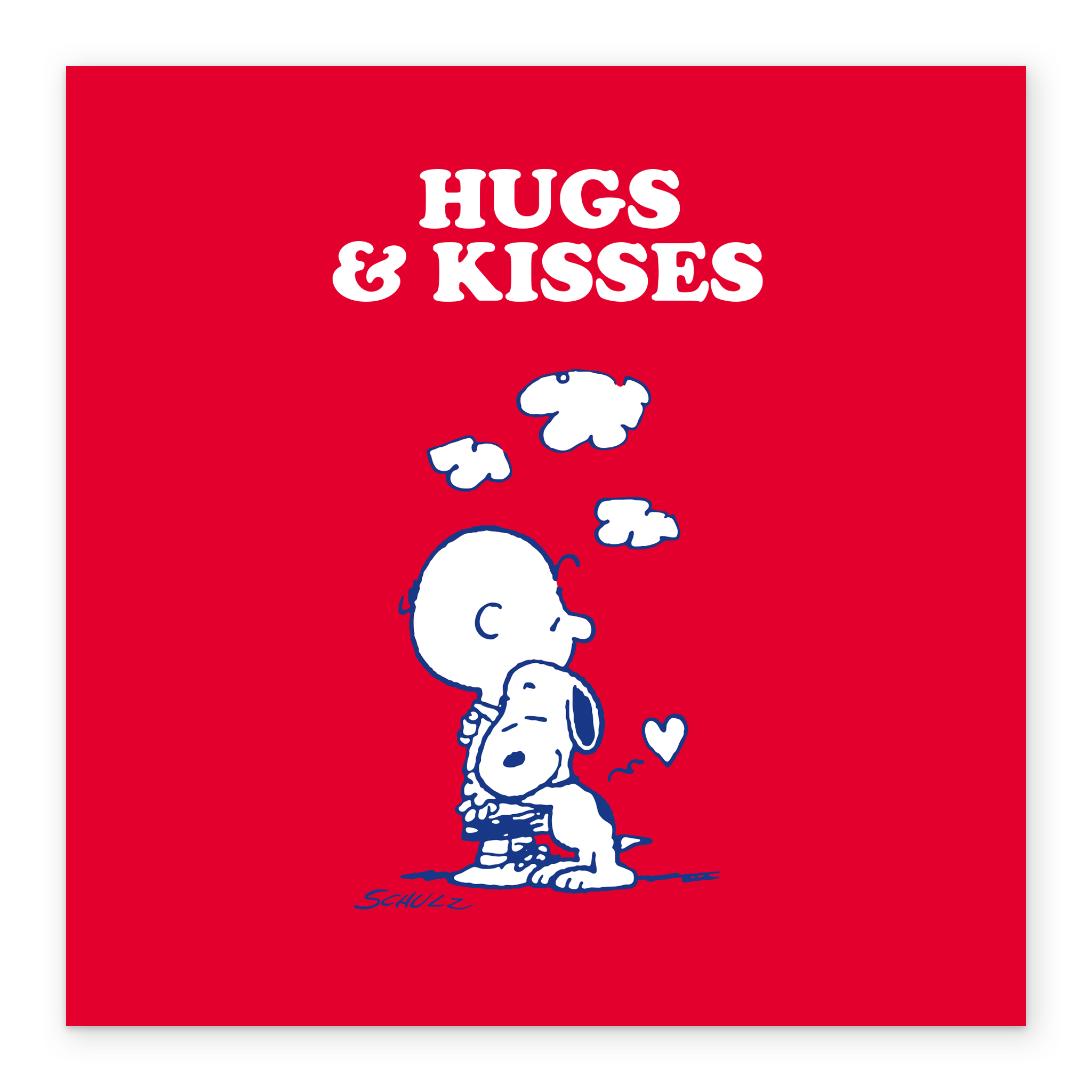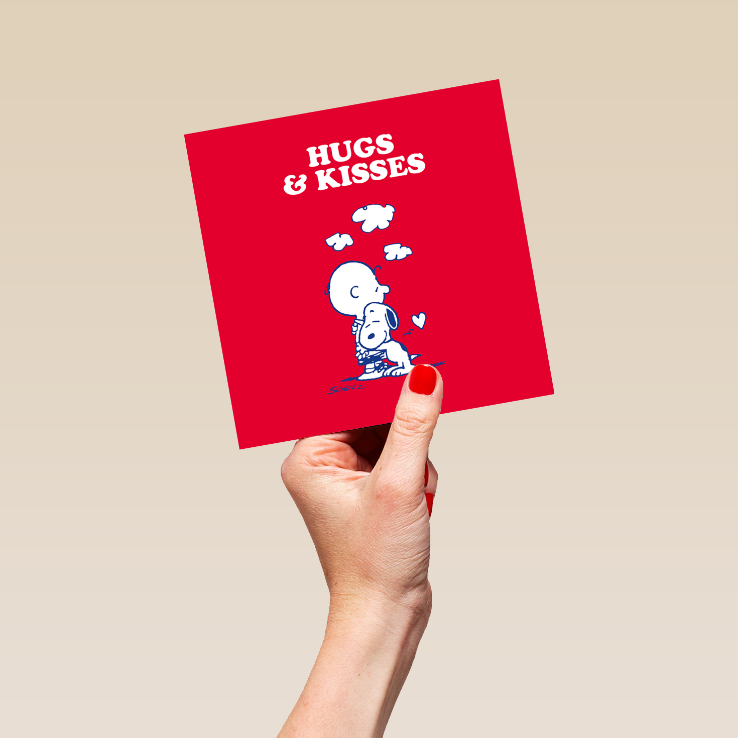 Printed on premium-quality board, this card features PEANUTS™ SNOOPY and Charlie Brown embraced in a hug, with the message 'Hugs & Kisses', and comes complete with a co-ordinating white envelope.