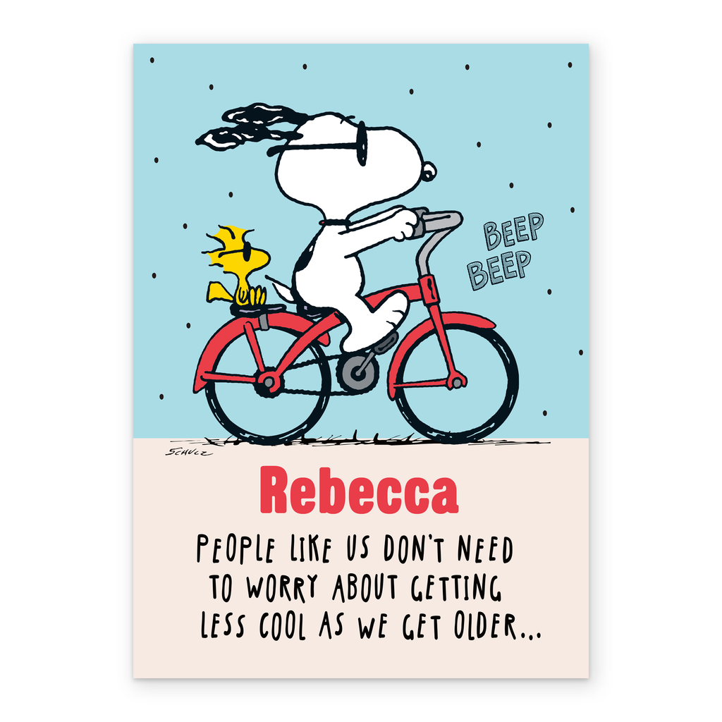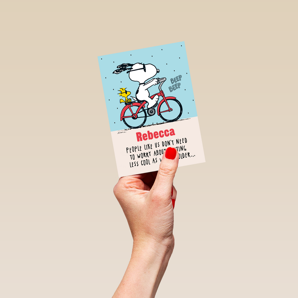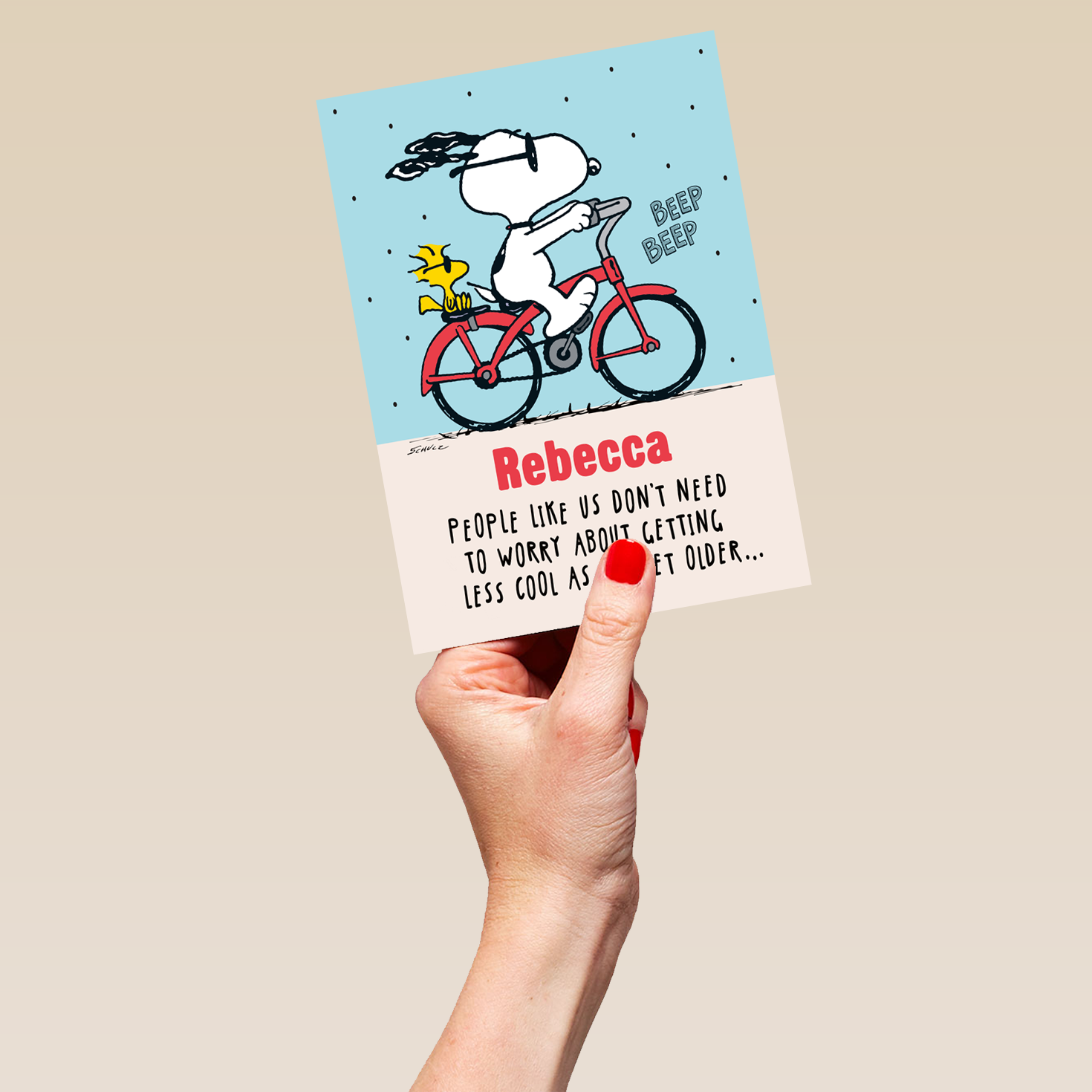 Printed on premium-quality board, this card features PEANUTS™ SNOOPY and WOODCHUCK looking cool in their sunglasses as they ride a red bicycle, with the message 'People like us don't need to worry about getting less cool as we get older…', space to personalise a name, and comes complete with a co-ordinating white envelope.