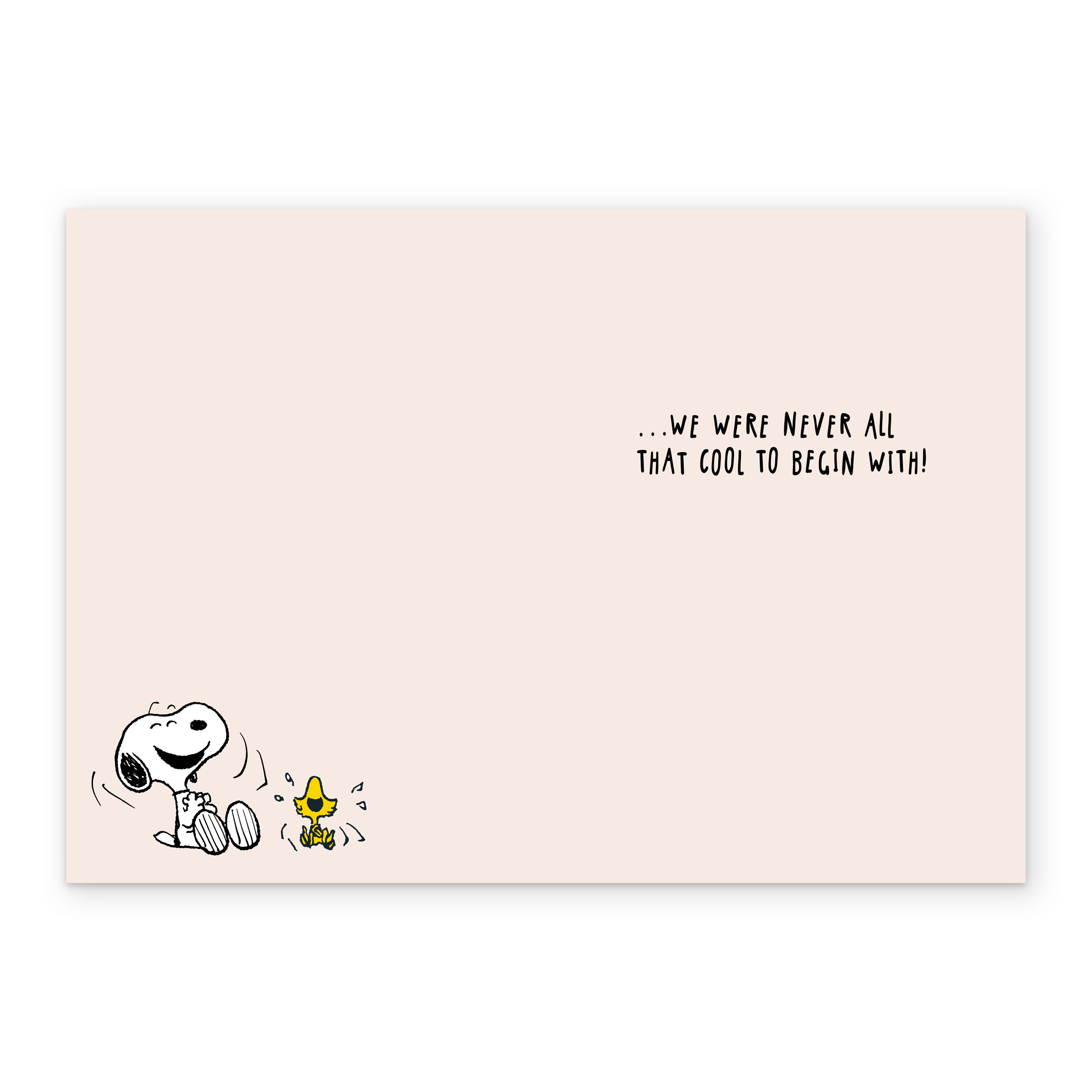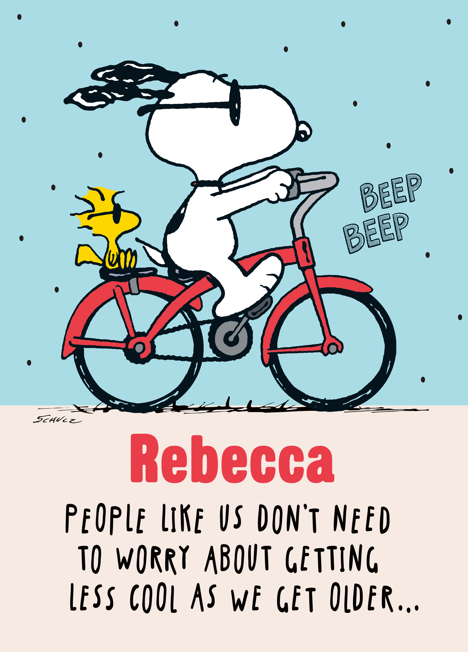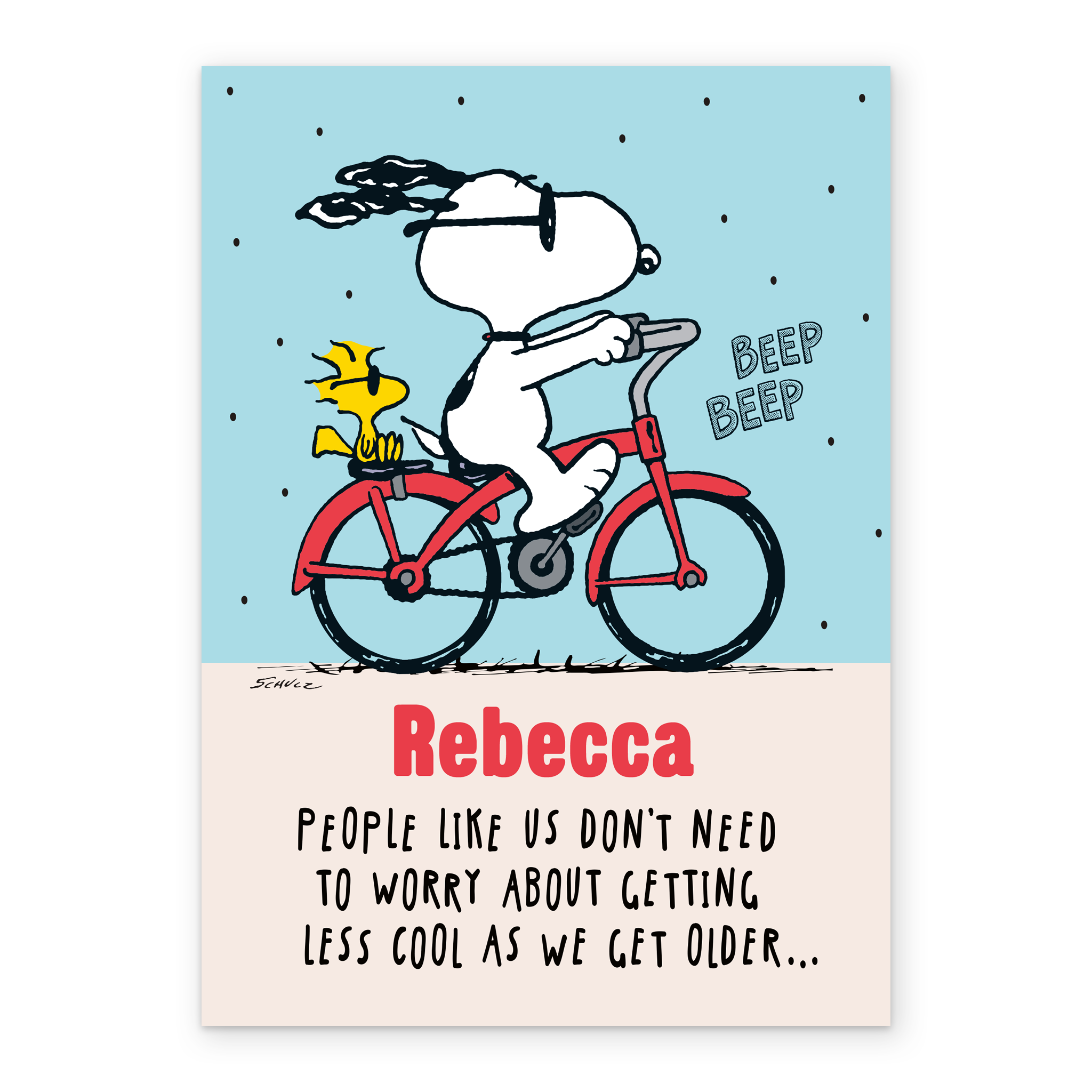 Printed on premium-quality board, this card features PEANUTS™ SNOOPY and WOODCHUCK looking cool in their sunglasses as they ride a red bicycle, with the message 'People like us don't need to worry about getting less cool as we get older…', space to personalise a name, and comes complete with a co-ordinating white envelope.