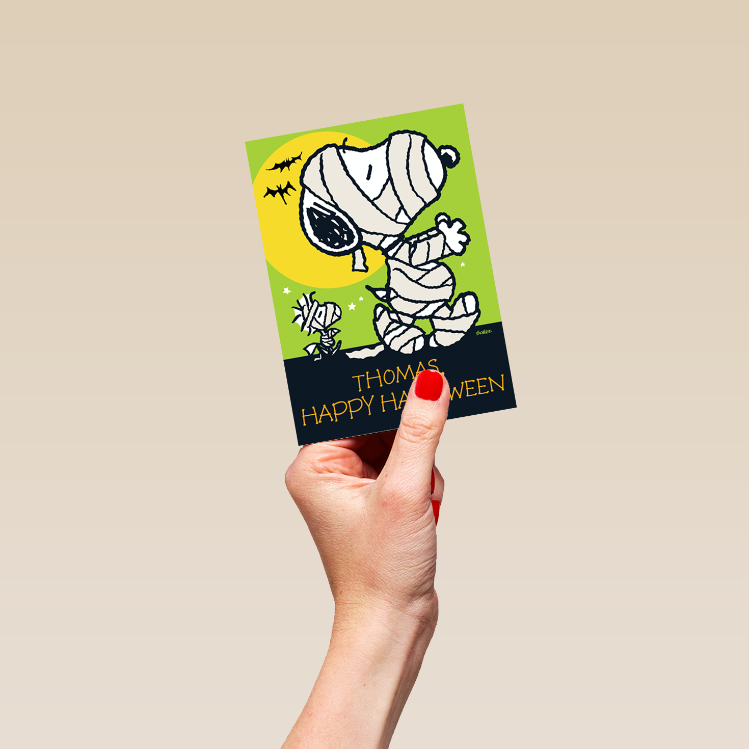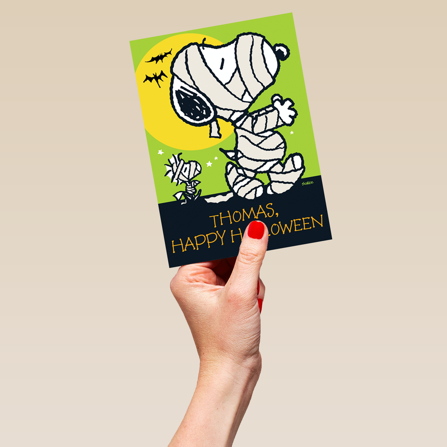 Let SNOOPY and WOODSTOCK lead you into the spookiest night of the year, and enjoy your time with those you love most with this adorable and personalisable Halloween card.