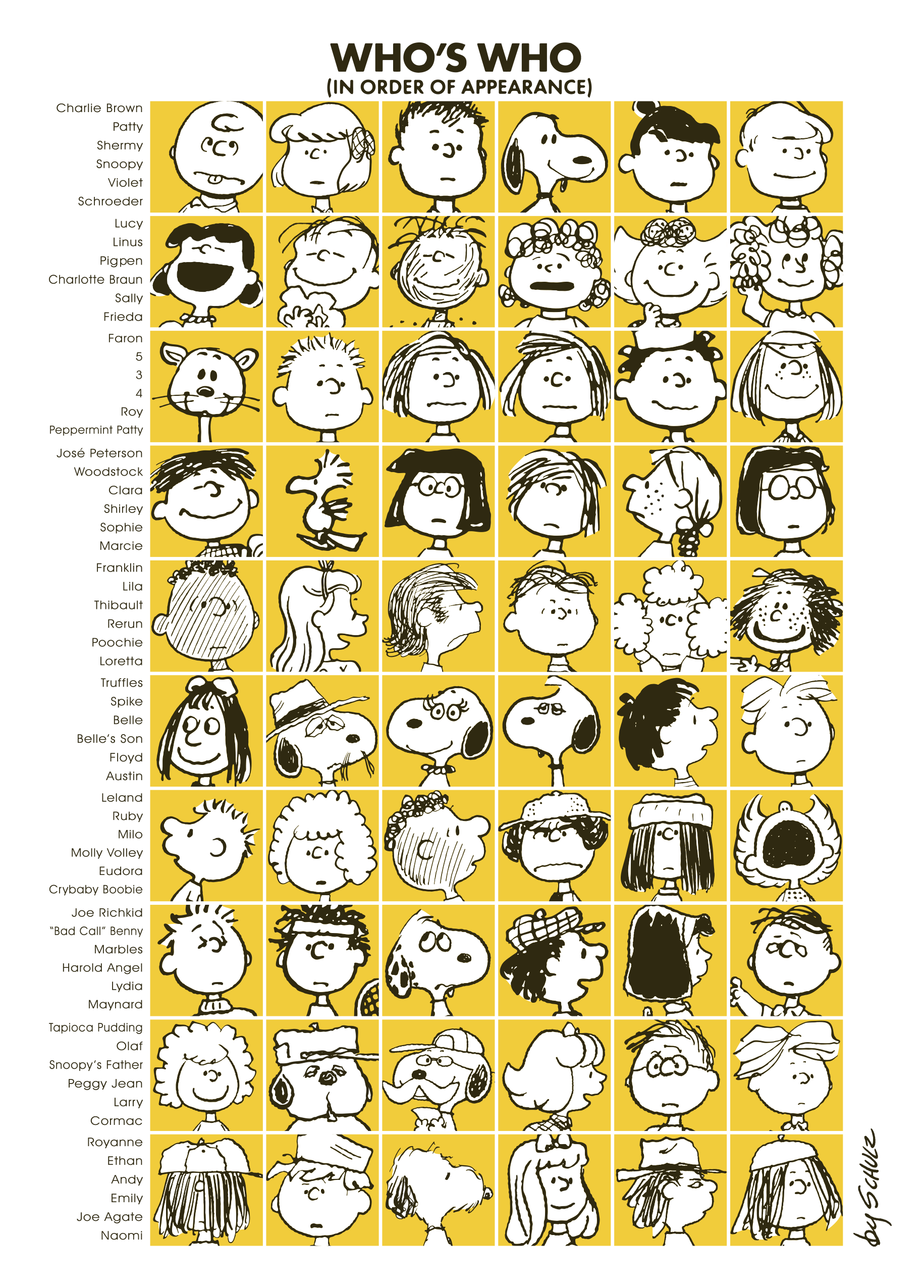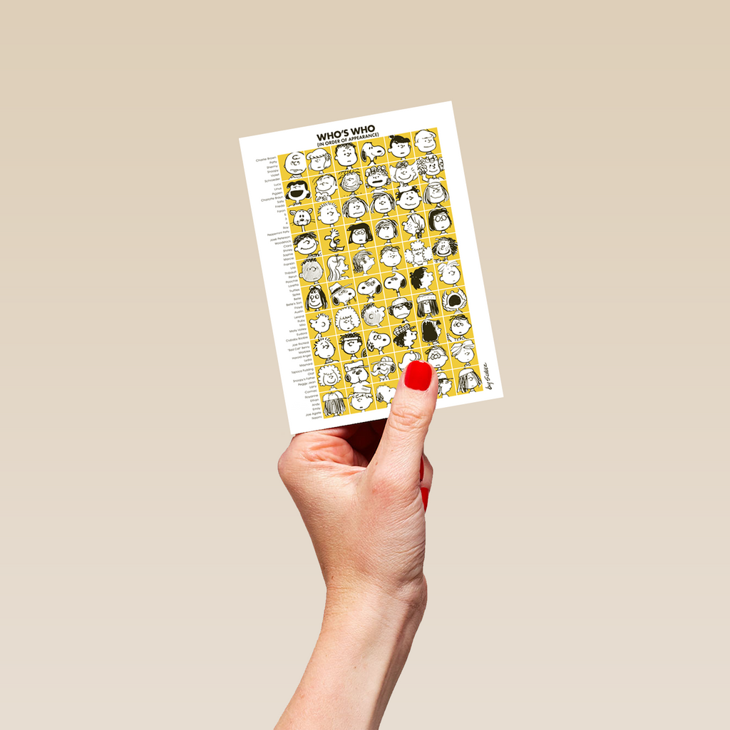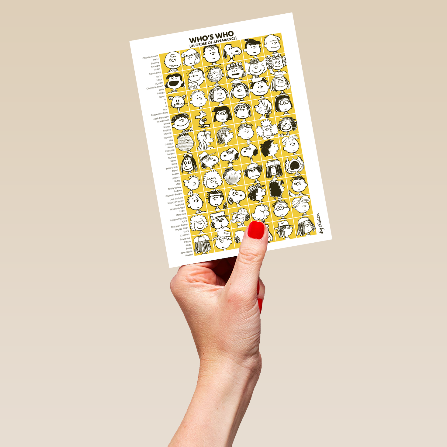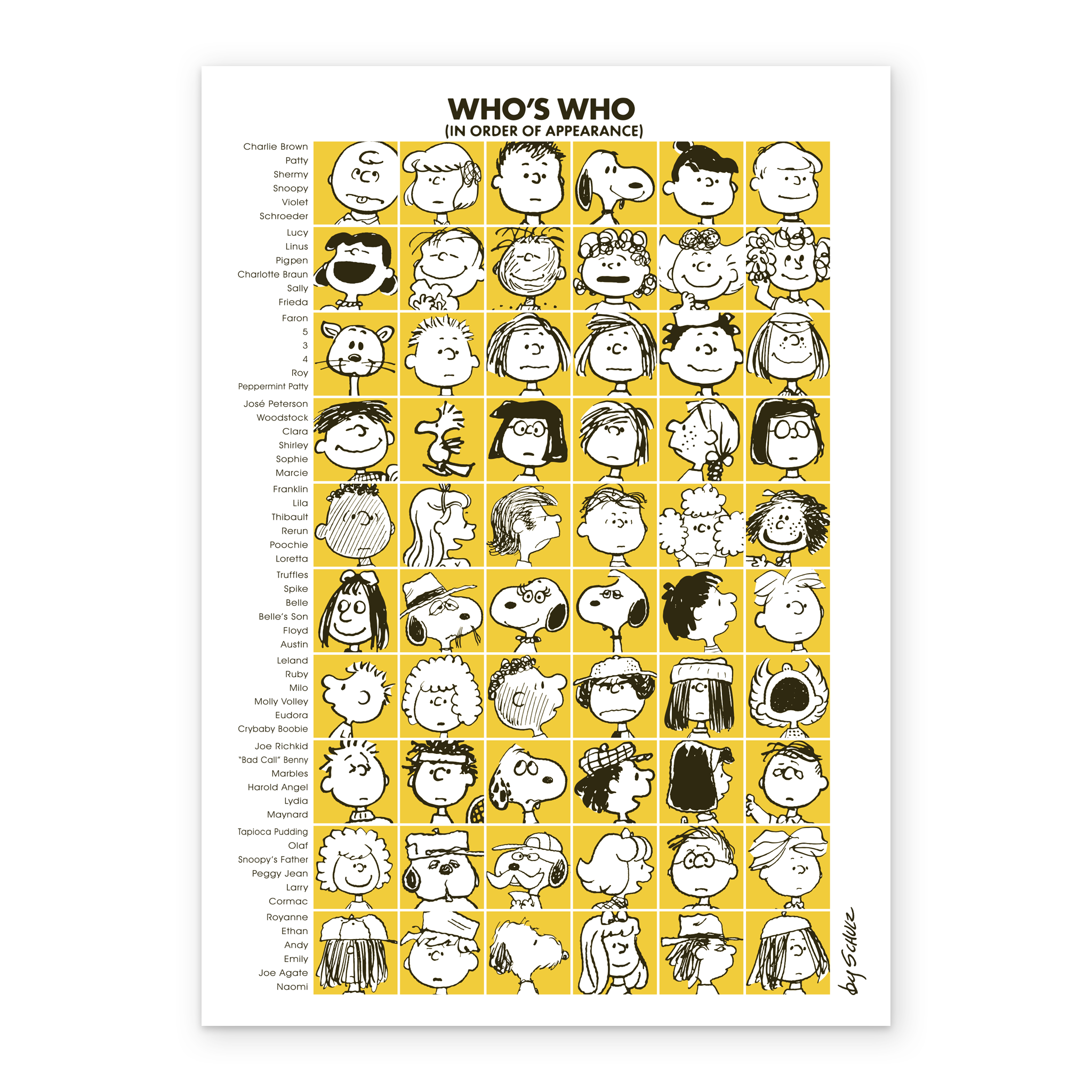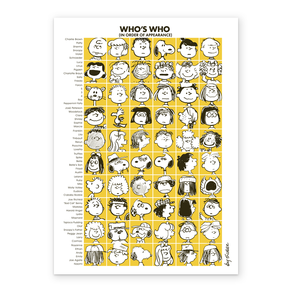 Printed on premium-quality board, this card features an illustrated guide to who's who within the PEANUTS™ comic strip, with the entire cast shown against a yellow background and the words 'Who's Who (in order of appearance) above the design, in black lettering against the white border, and all the character names listed down the left-hand side, also in black lettering against the white border, and comes complete with a co-ordinating white envelope.