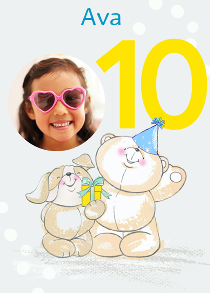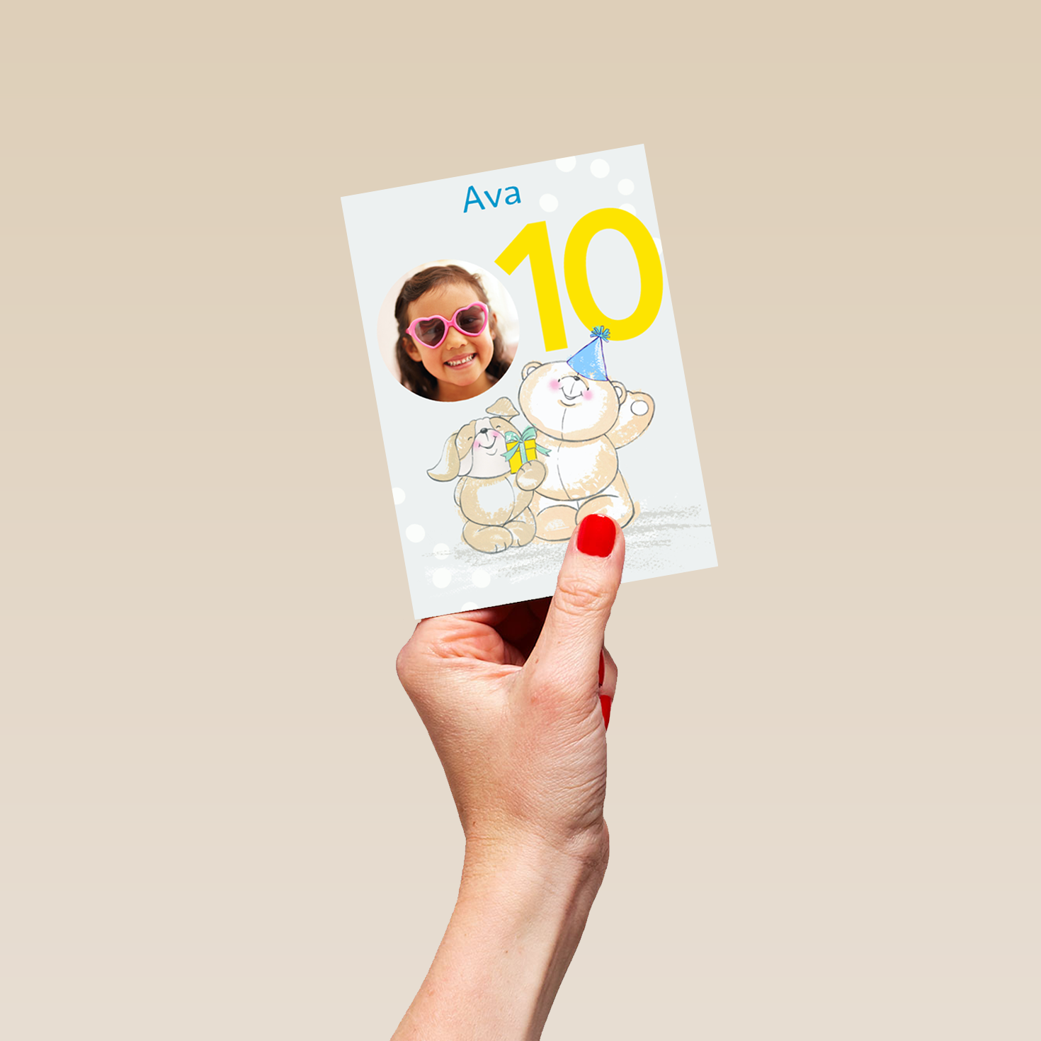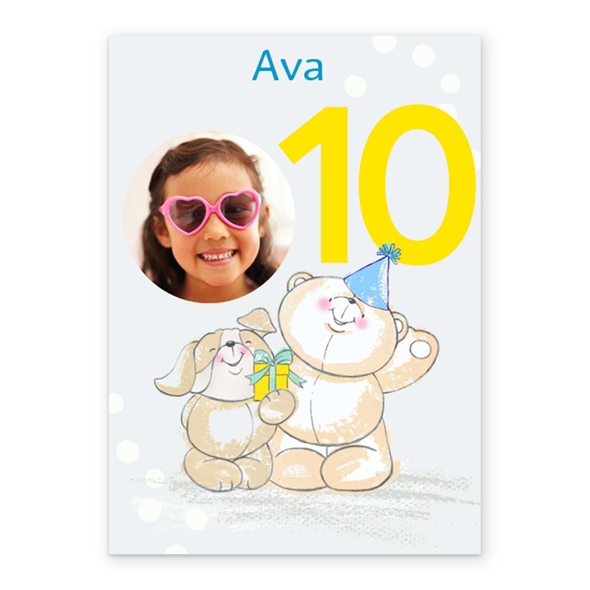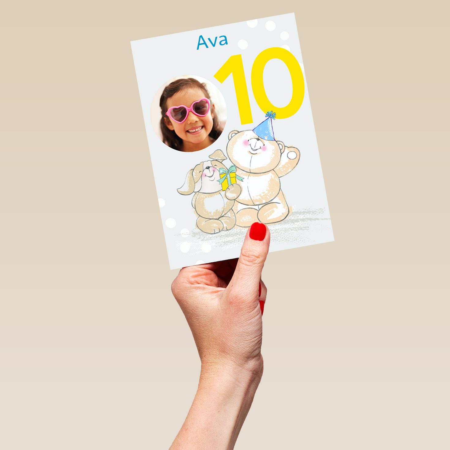 Show them you care with a personalised 10th birthday photo card from Hallmark. Our bear cards are printed on premium quality, FSC®-certified card & delivered nationwide. This card is available as standard 12cm by 16.7cm and large 15.5cm by 21.6cm.