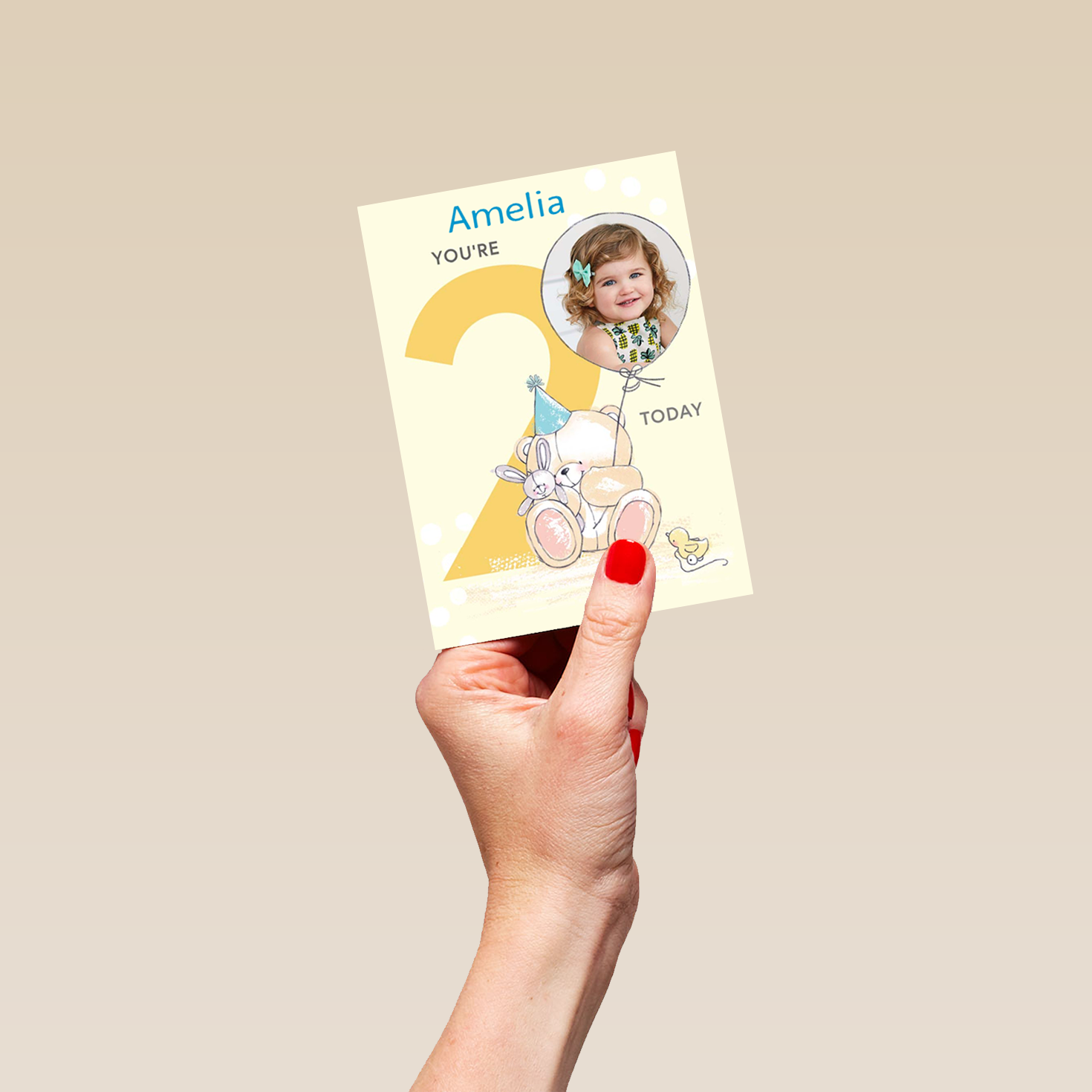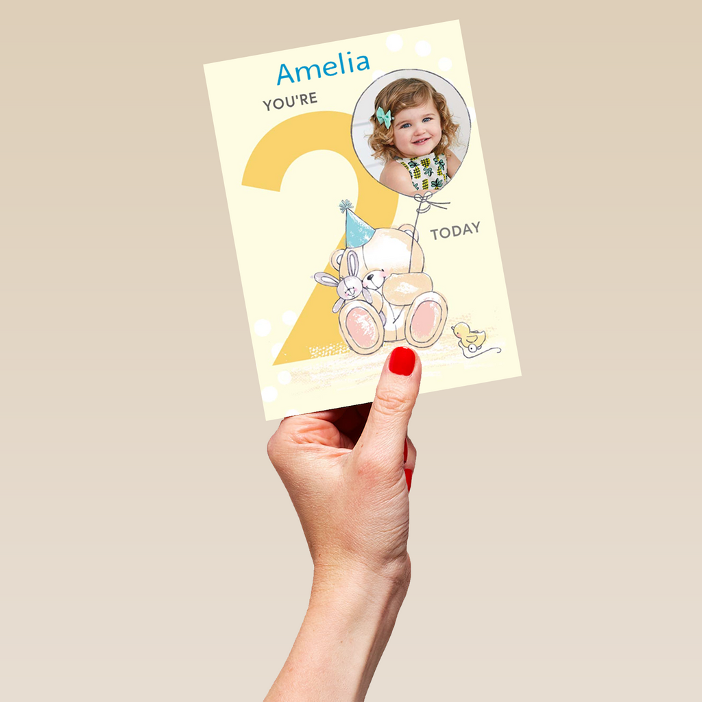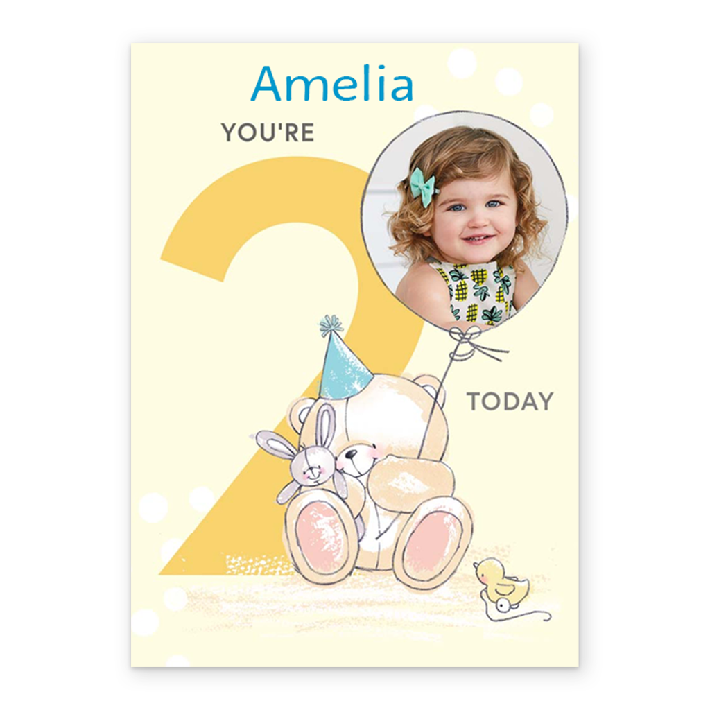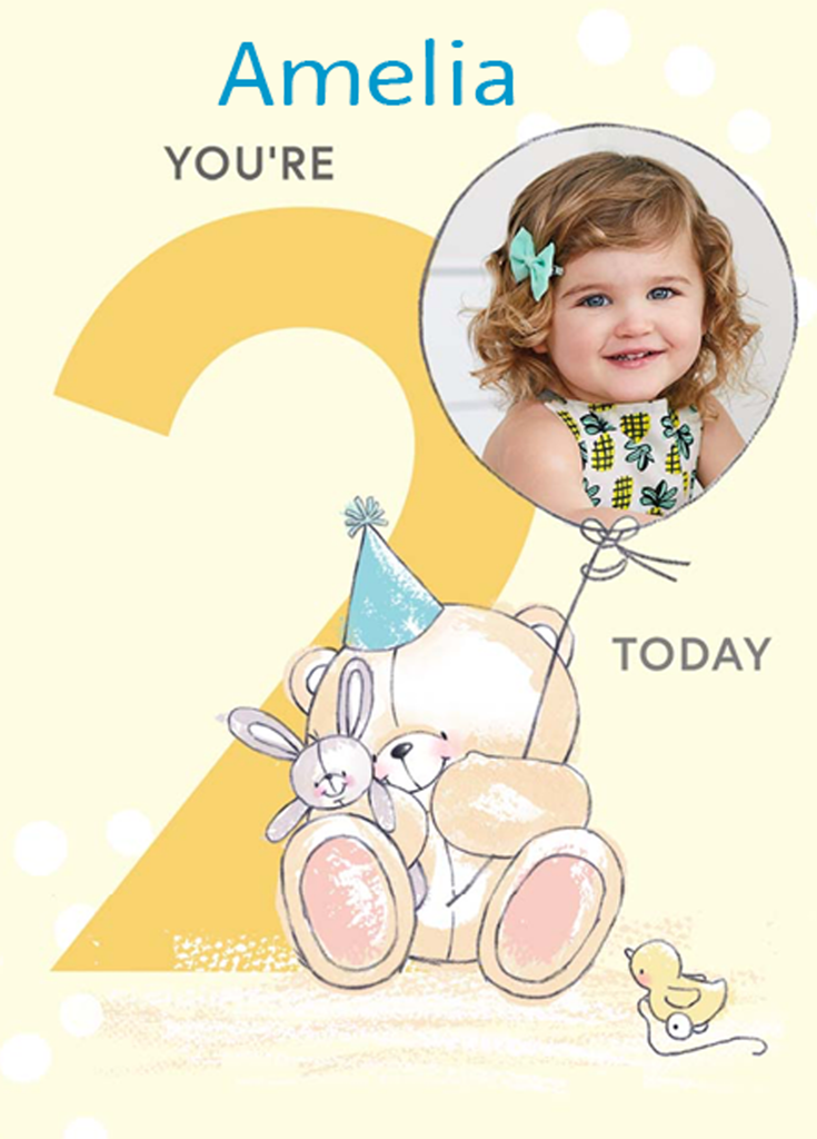 Show them you care with a personalised 2nd birthday photo card from Hallmark. Our 2nd birthday cards are printed on premium quality, FSC®-certified card & delivered nationwide. This card is available as standard 12cm by 16.7cm and large 15.5cm by 21.6cm.