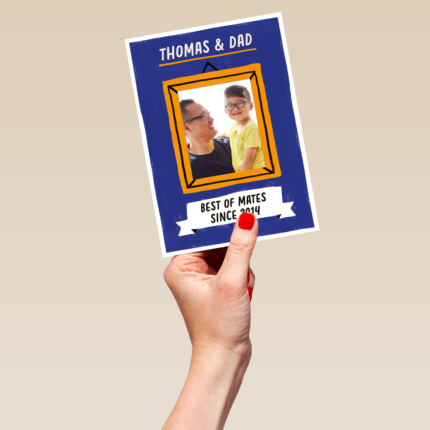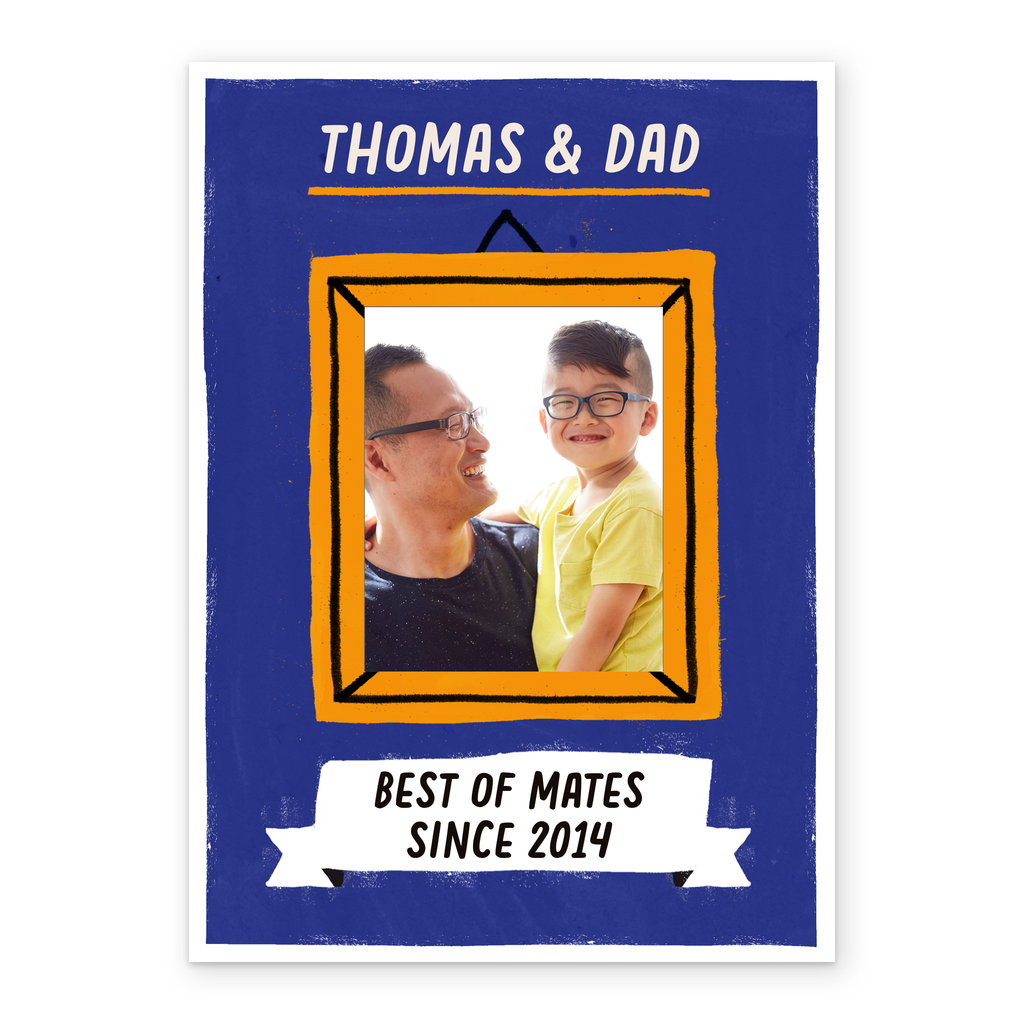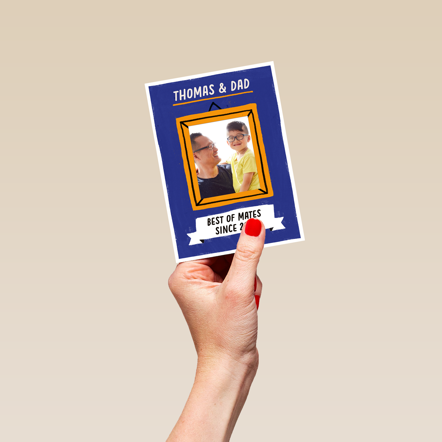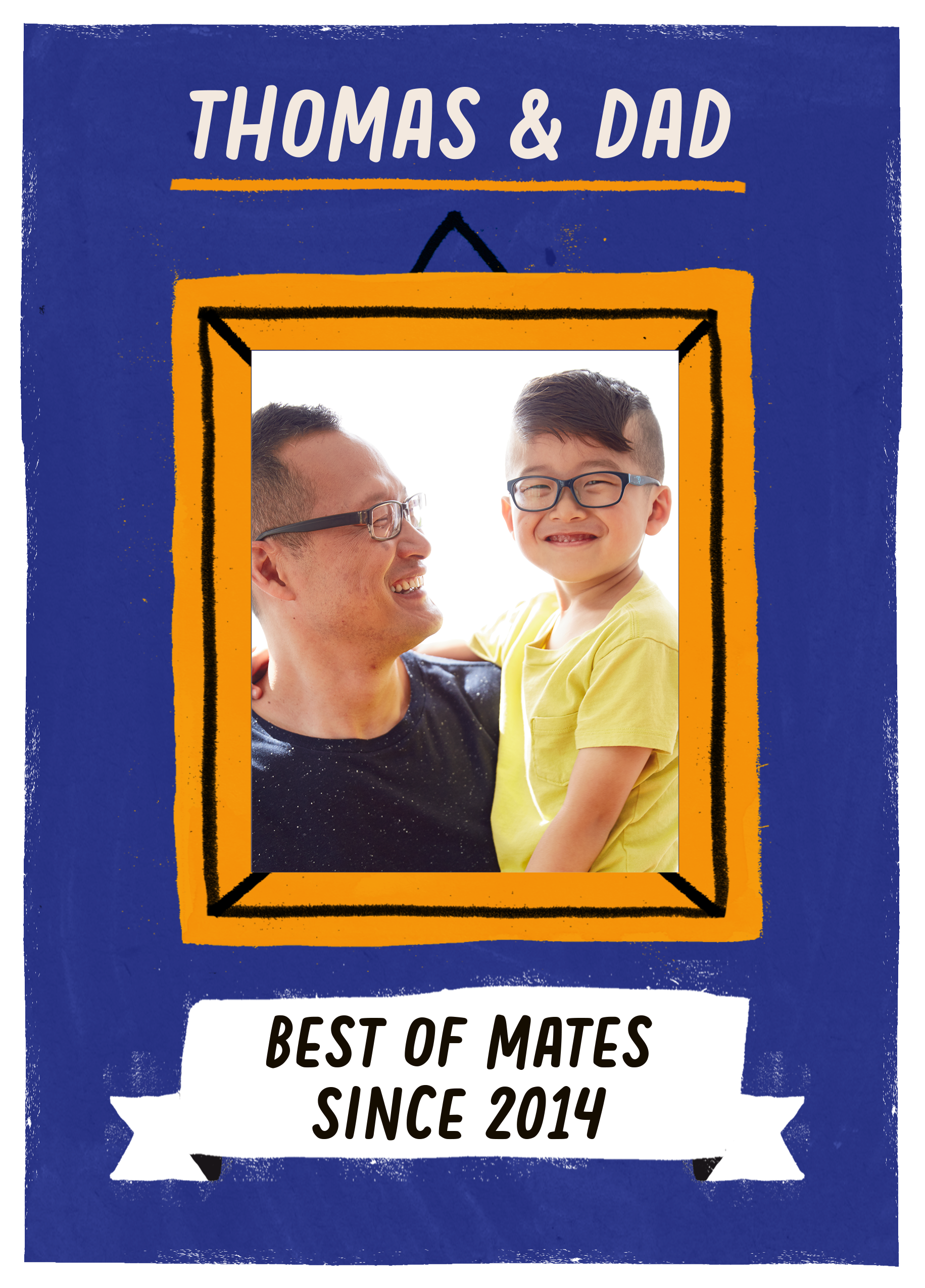 Printed on premium-quality board, this card features a hanging picture frame design, with the message 'Best of mates since [YEAR]', space to upload a photo and personalise a name, and comes complete with a co-ordinating white envelope.