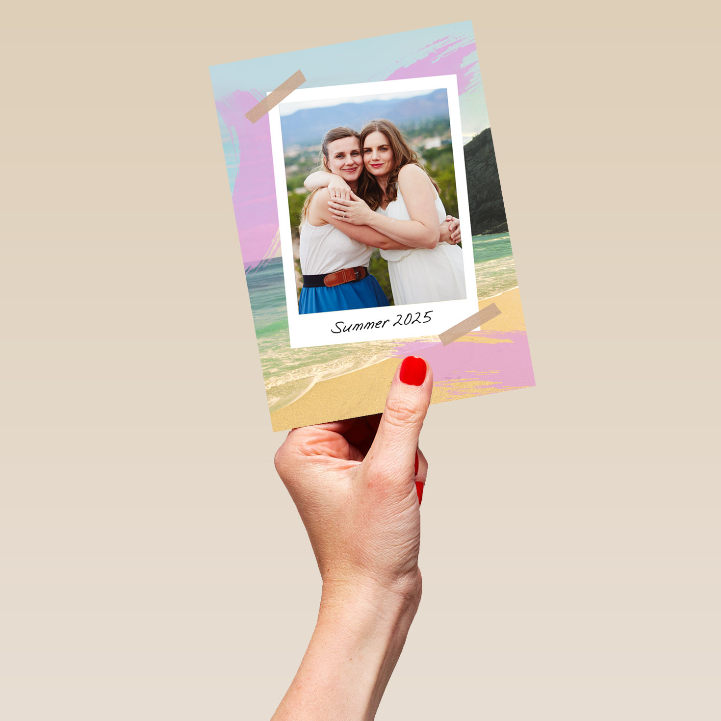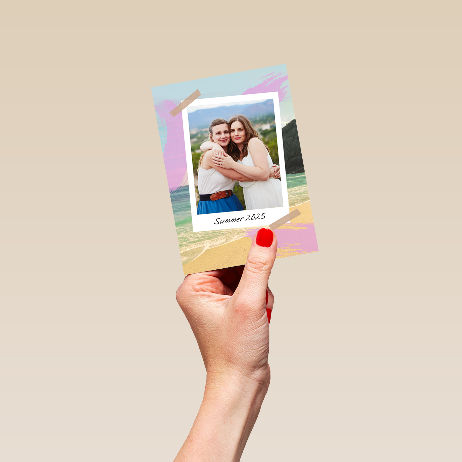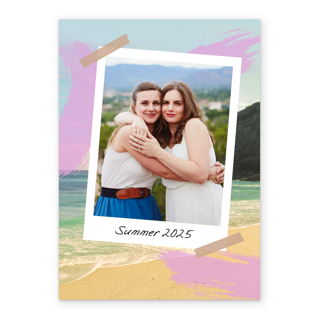 Printed on premium-quality board, this card features a beach themed background with a polaroid-styled photo border, with the message 'Summer 2025', space to upload a photo and personalise your message, and comes complete with a co-ordinating white envelope.