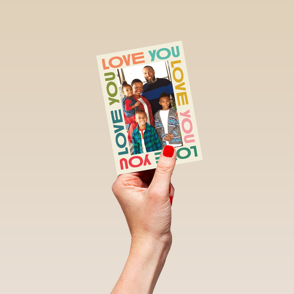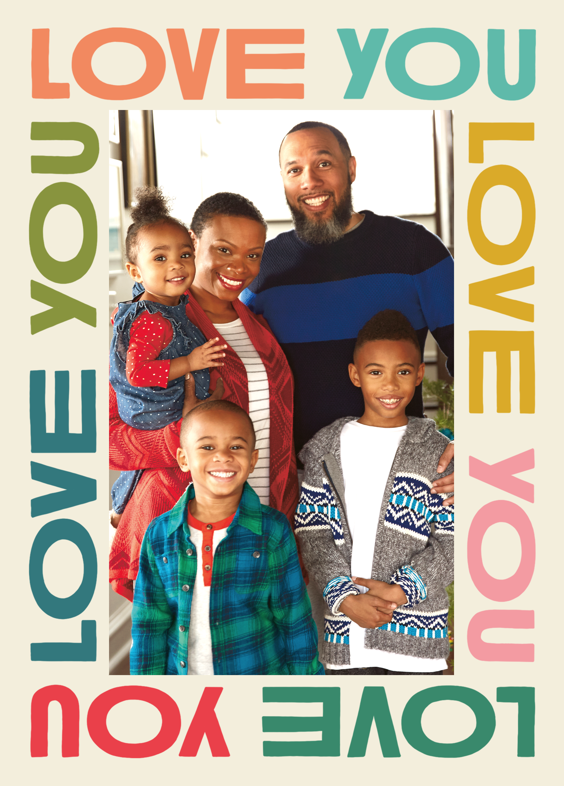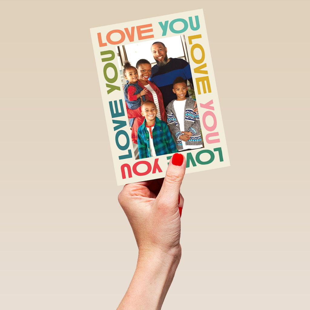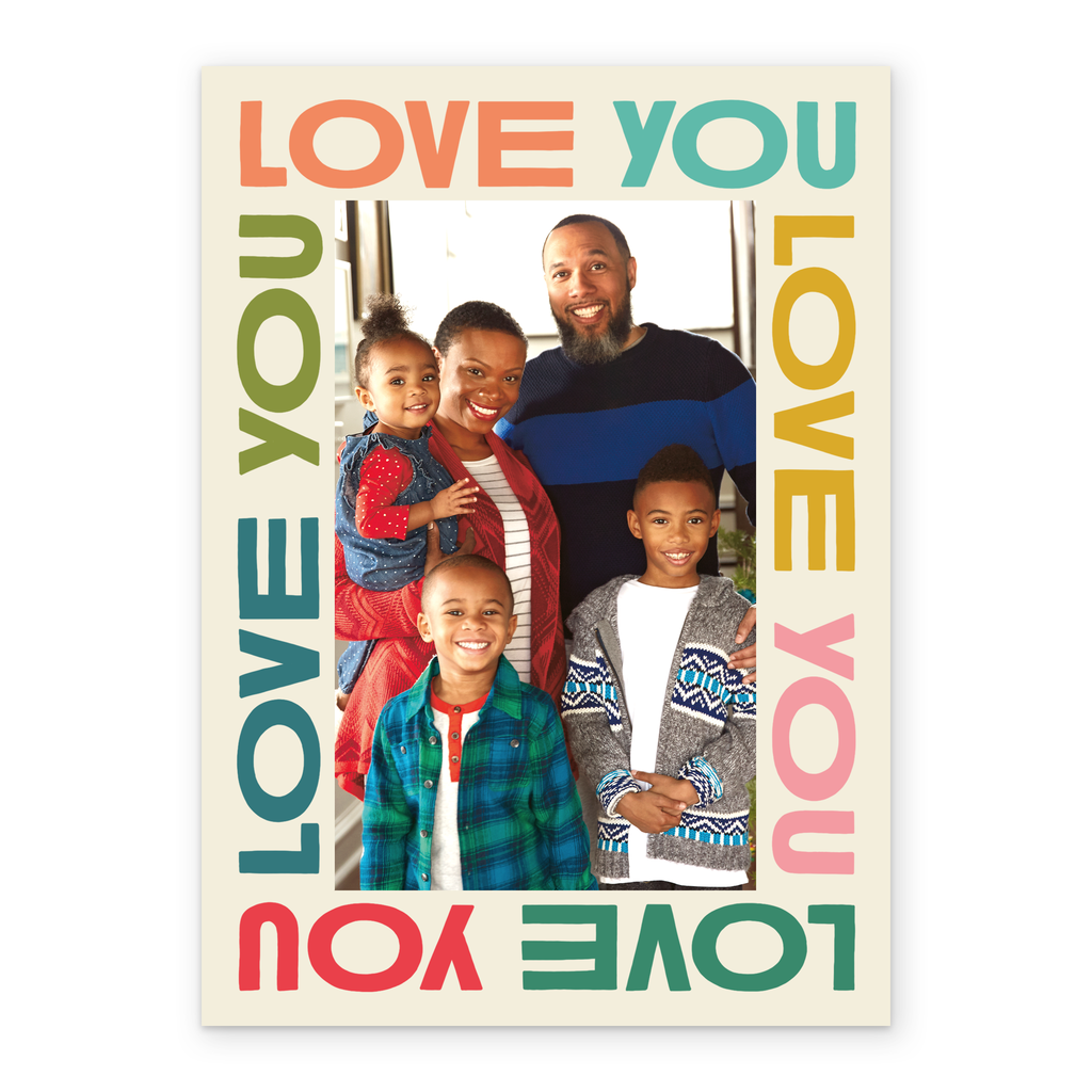 Printed on premium-quality board, this card features colourful typography word art around the border, with the message 'Love you', space to upload a photo, and comes complete with a co-ordinating white envelope.