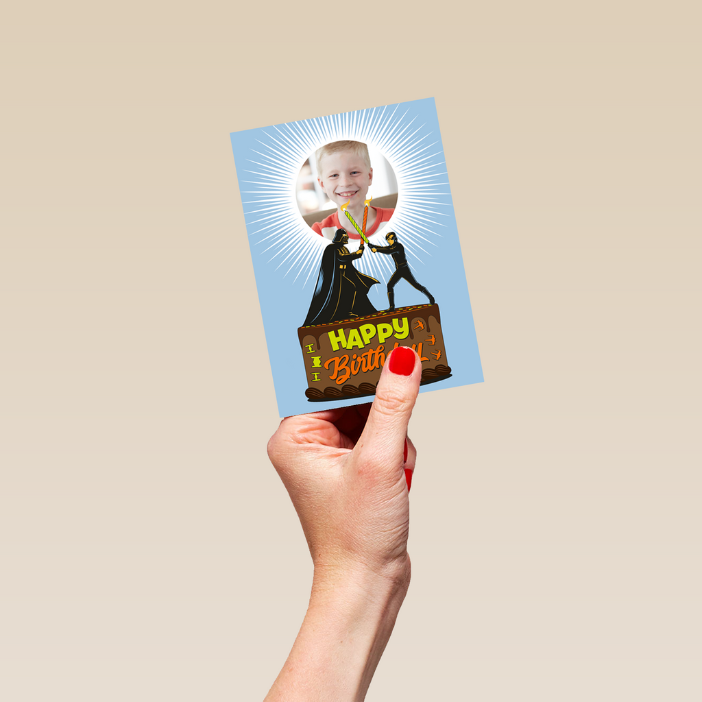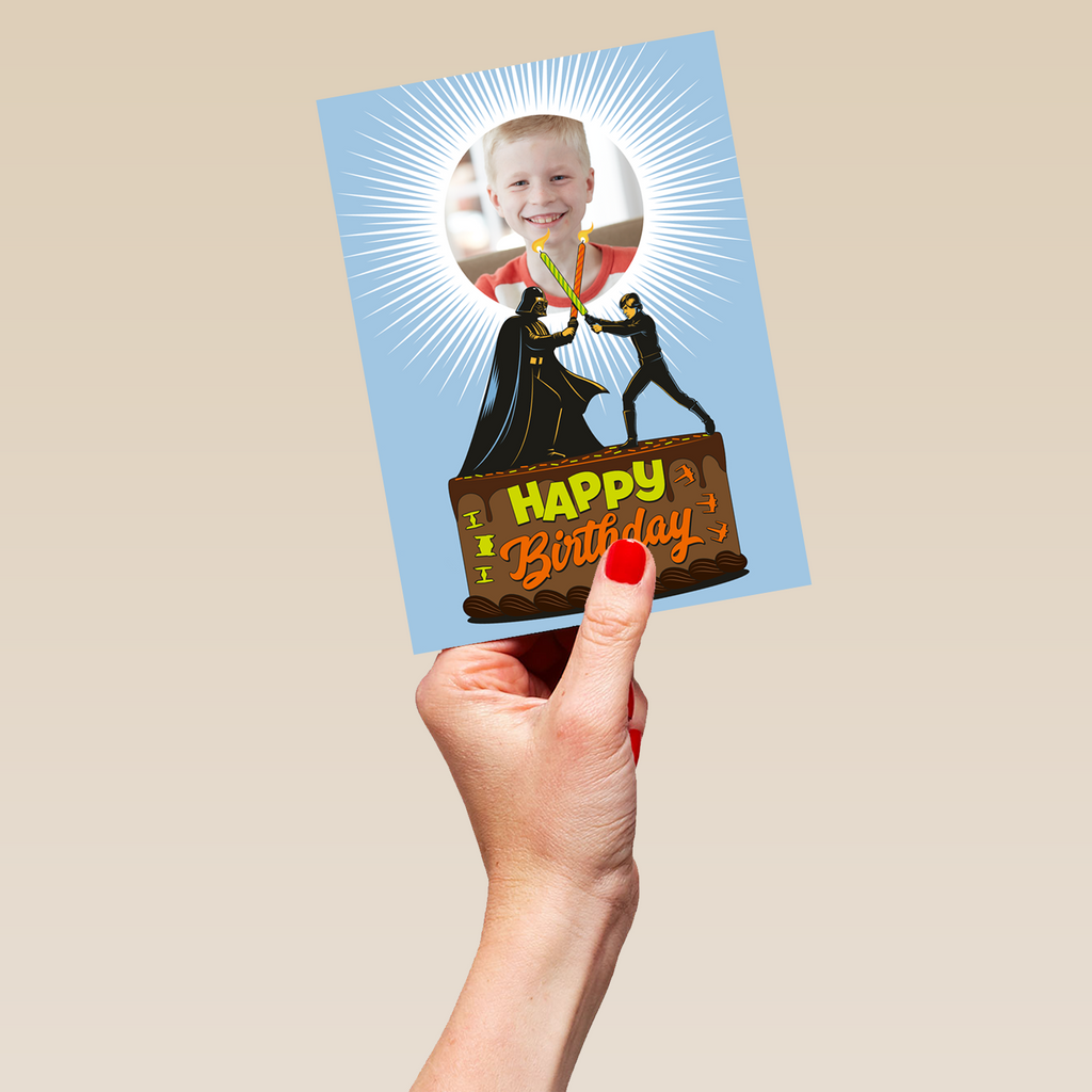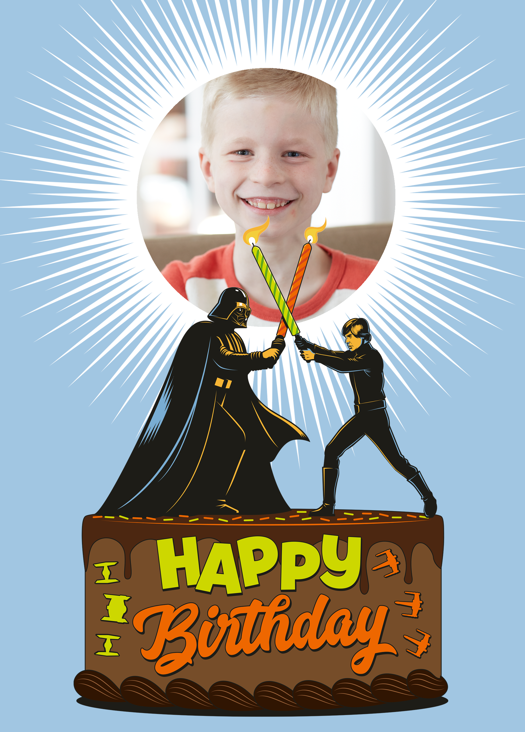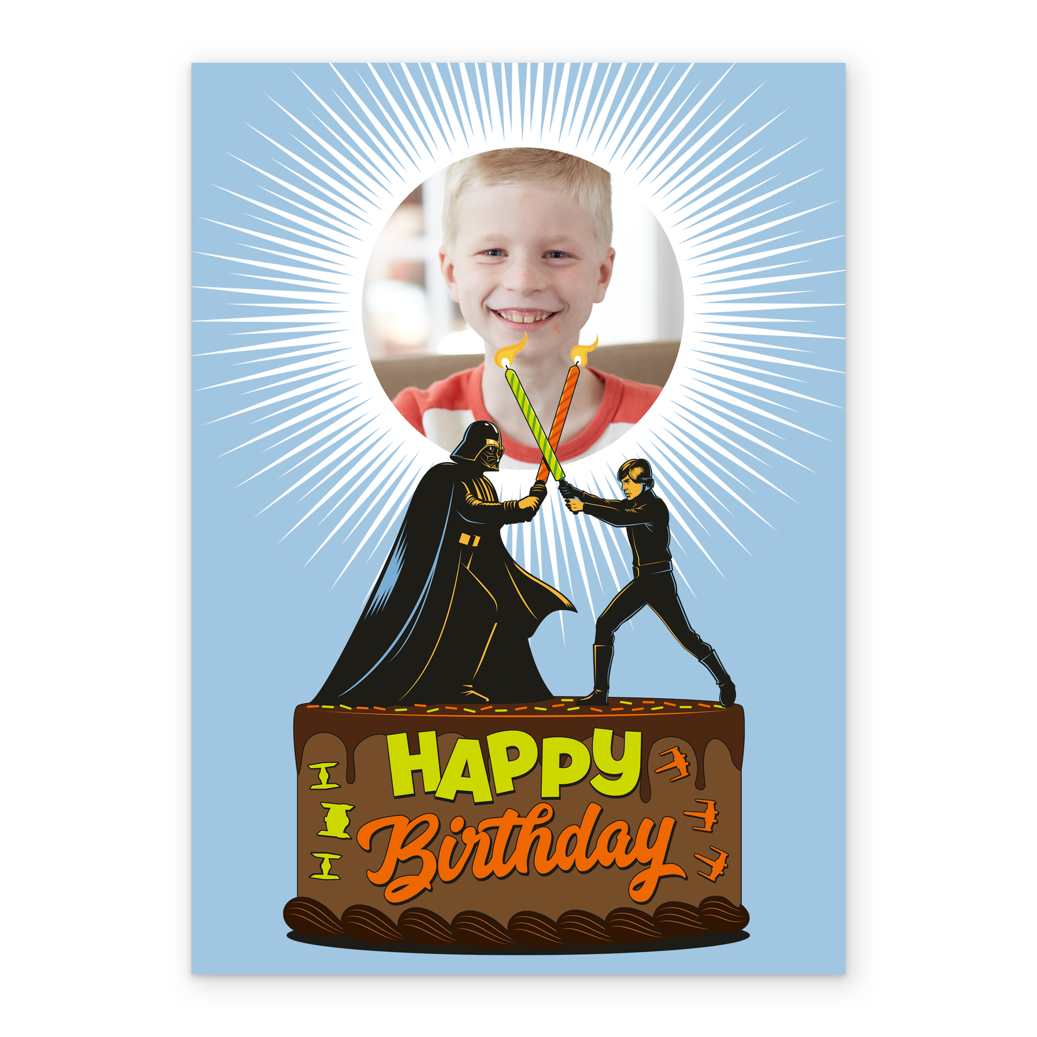 Printed on premium-quality board, this card features Darth Vader and Luke Skywalker battling on a Birthday cake, with the message 'Happy Birthday', space to upload a photo, and comes complete with a co-ordinating white envelope.