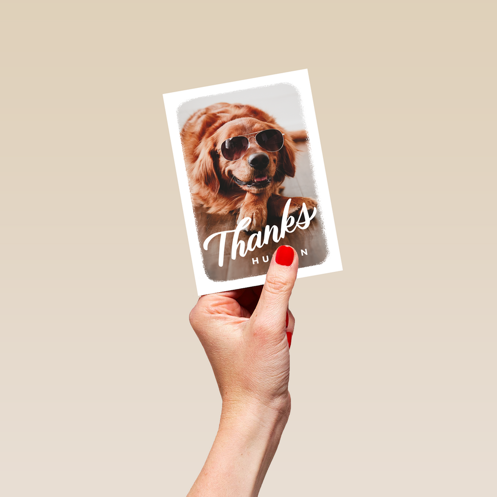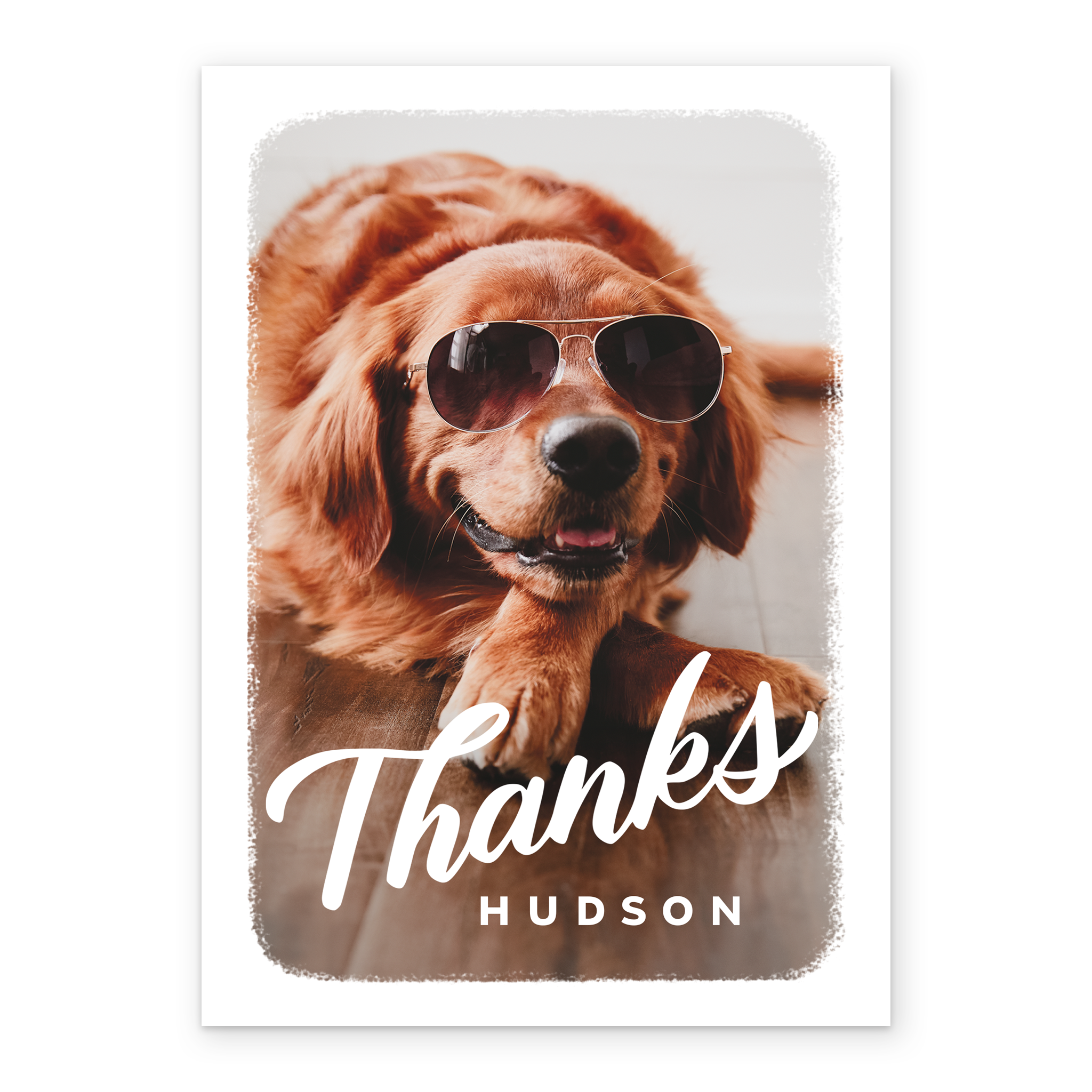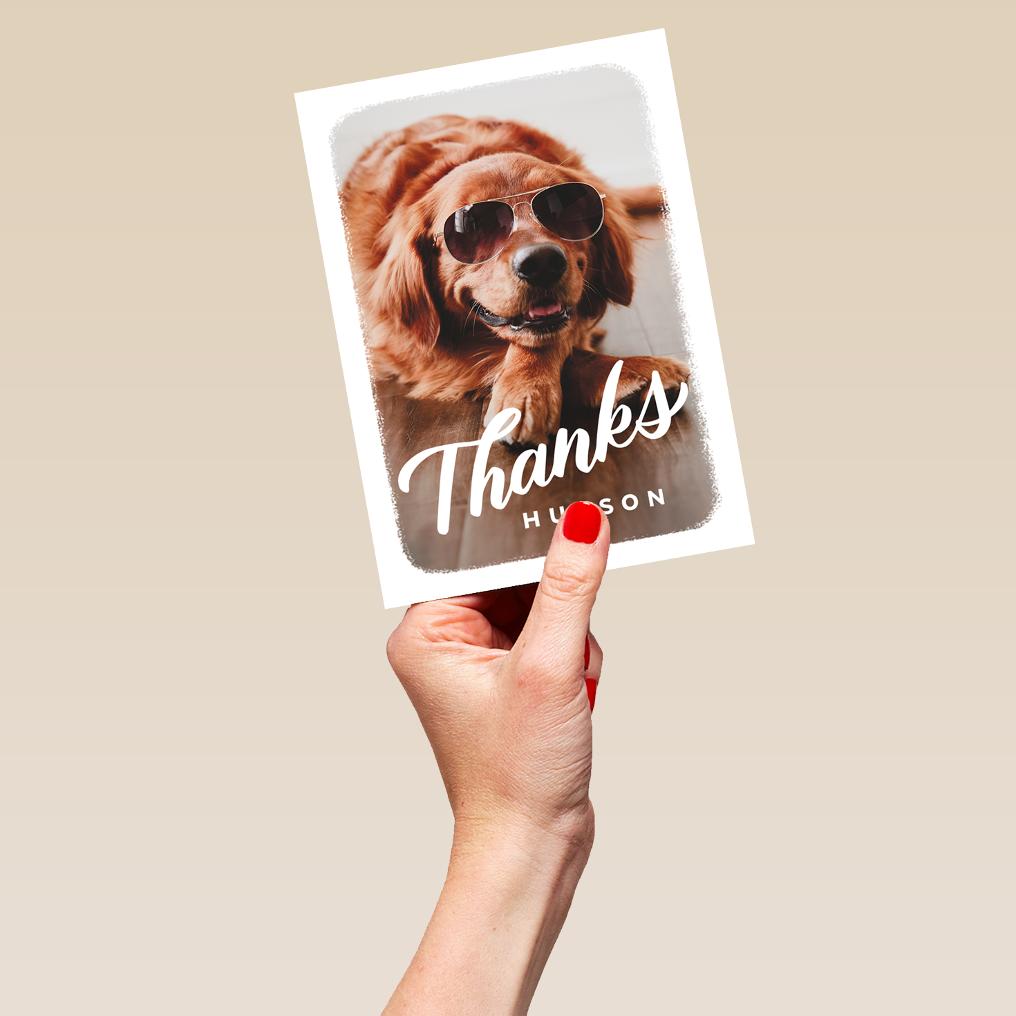 Printed on premium-quality board, this card features a simple photo frame with white text, with the message 'Thanks', space to upload a photo and personalise a name, and comes complete with a co-ordinating white envelope.