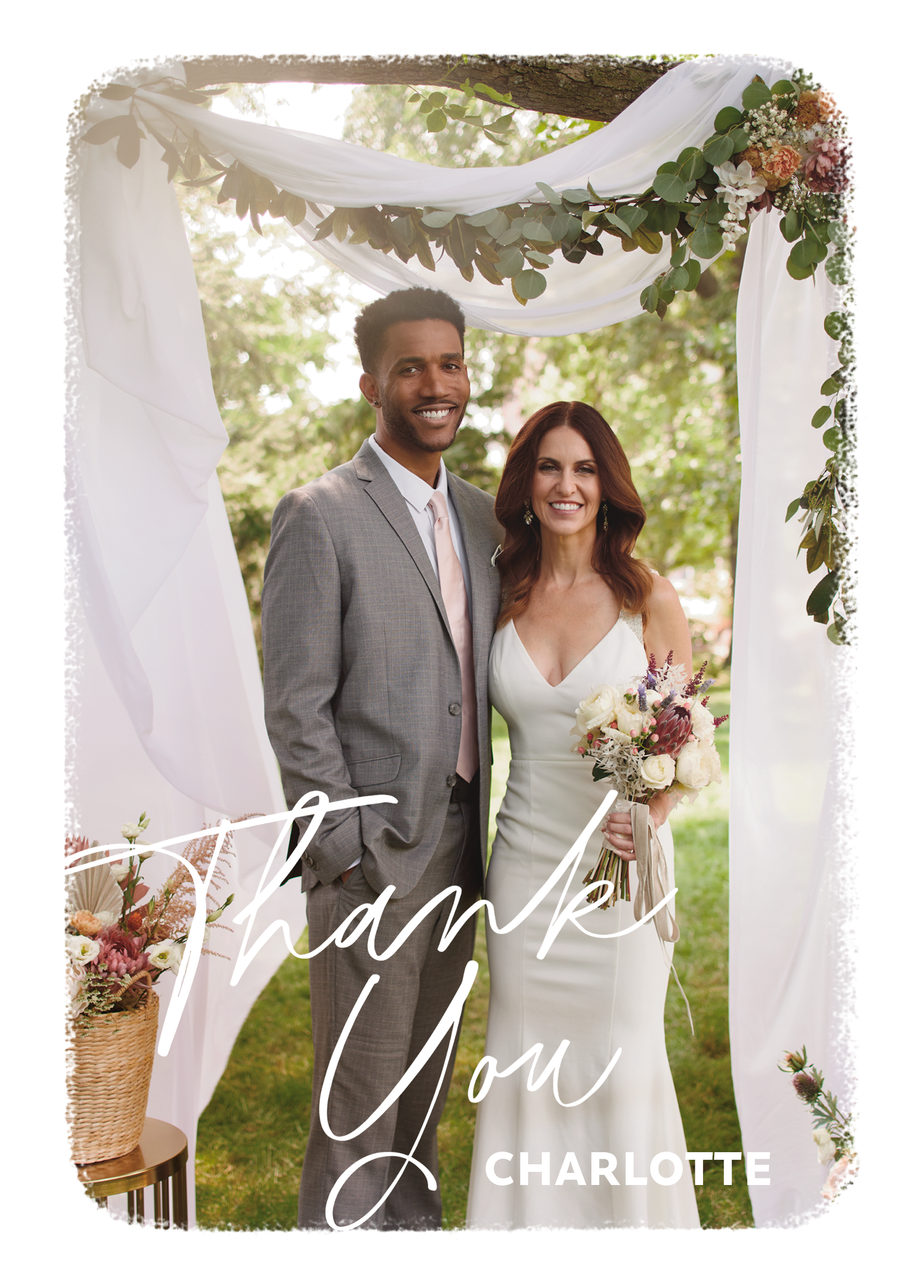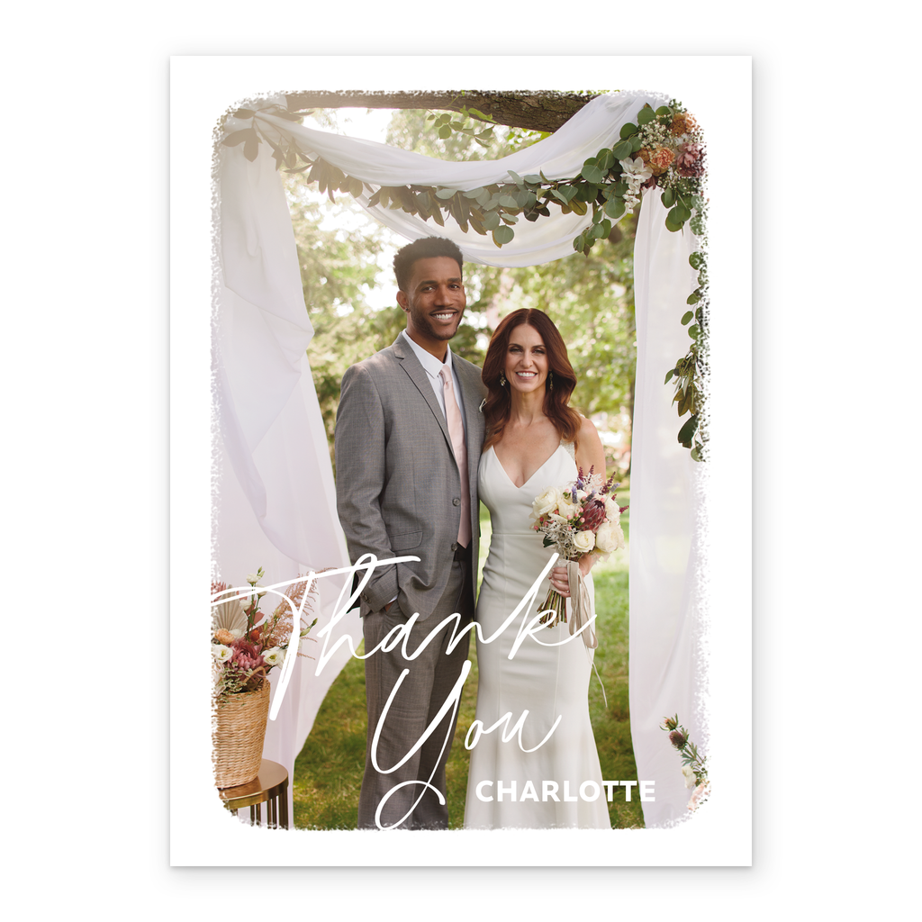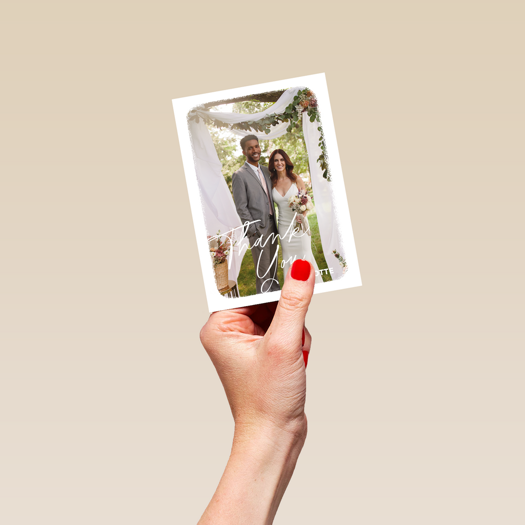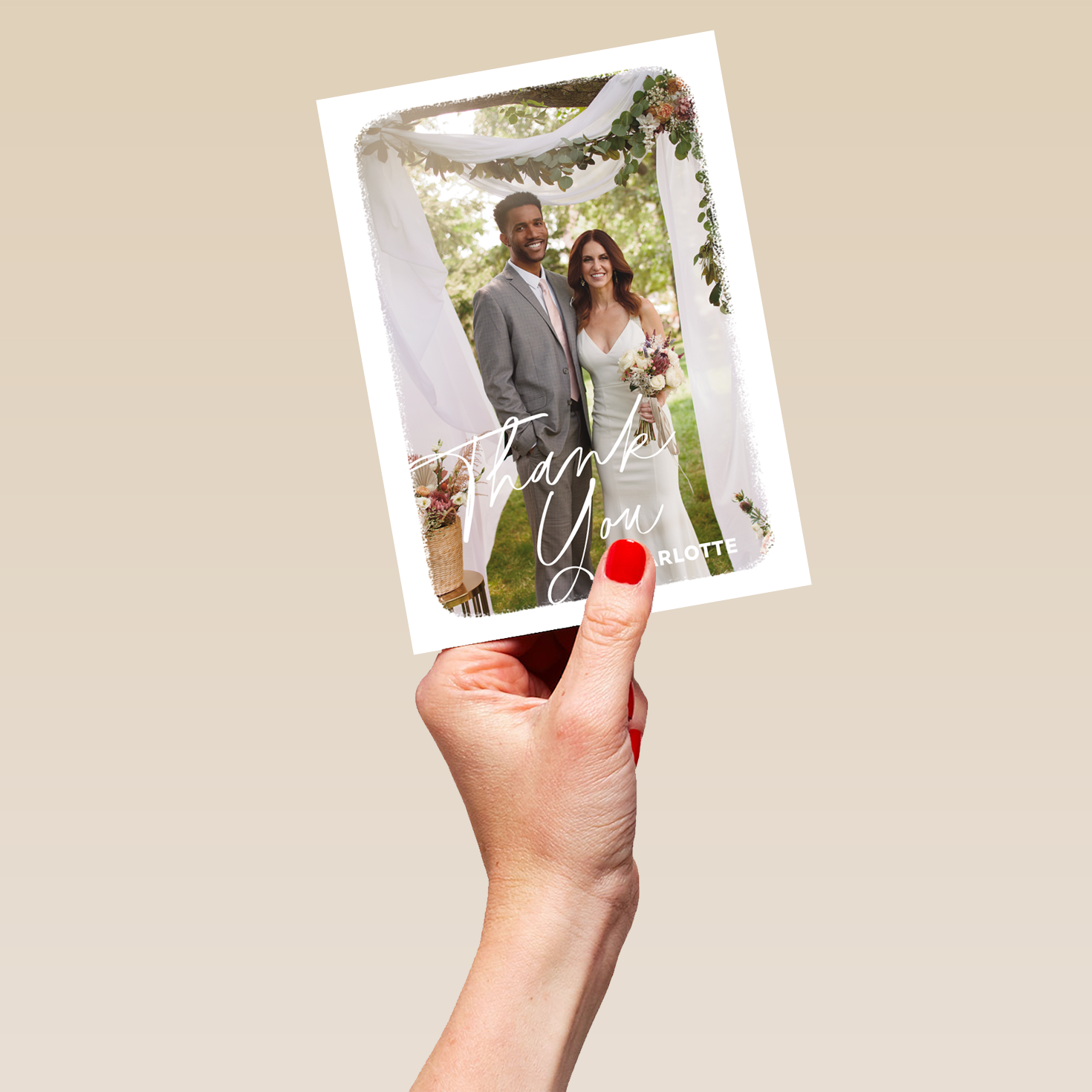 Printed on premium-quality board, this card features a plain white border with simple text, with the message 'Thank You [NAME]', space to upload a photo and personalise a name, and comes complete with a co-ordinating white envelope.