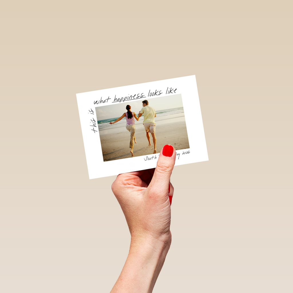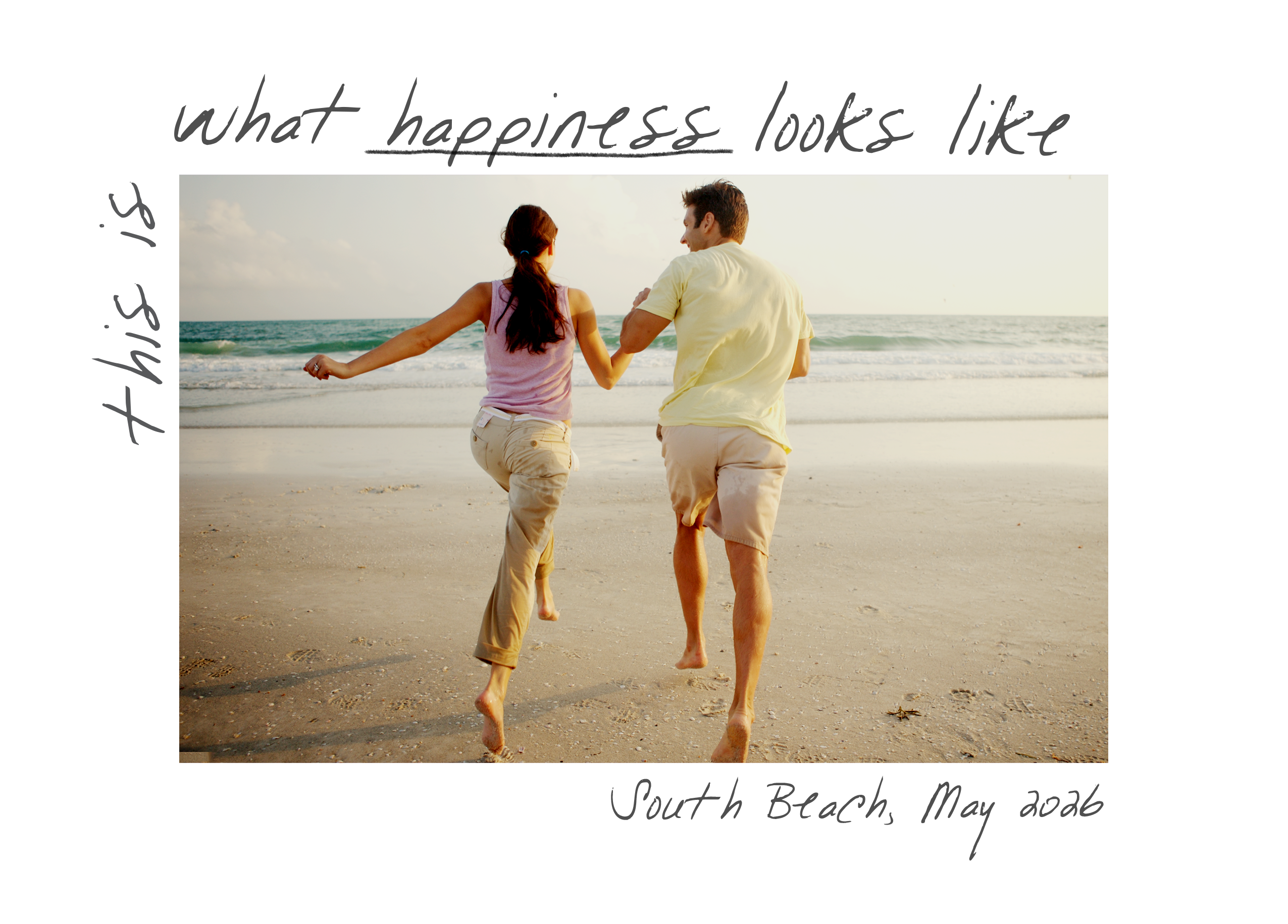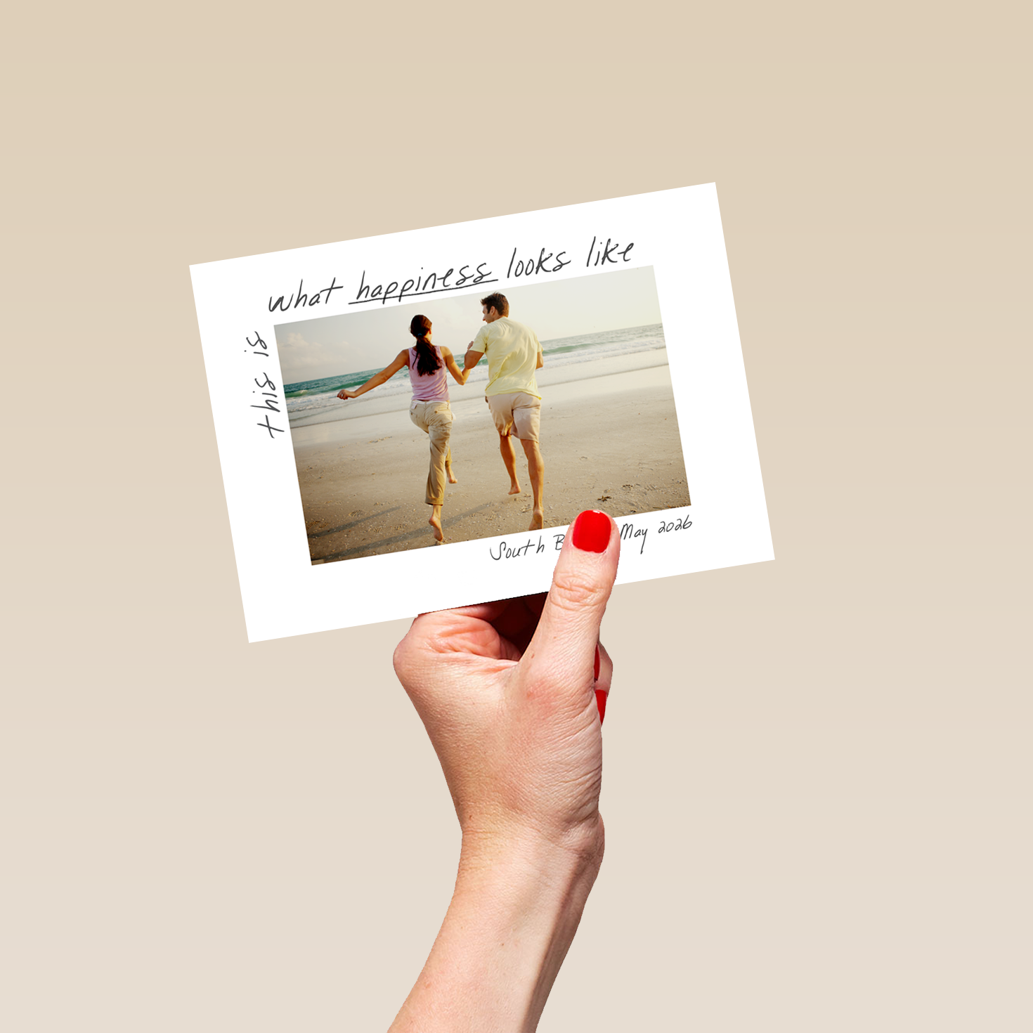 Printed on premium-quality board, this card features a white border with handwriting-styled lettering, with the message 'This is what happiness looks like [LOCATION & DATE]', space to upload a photo and personalise your message, and comes complete with a co-ordinating white envelope.