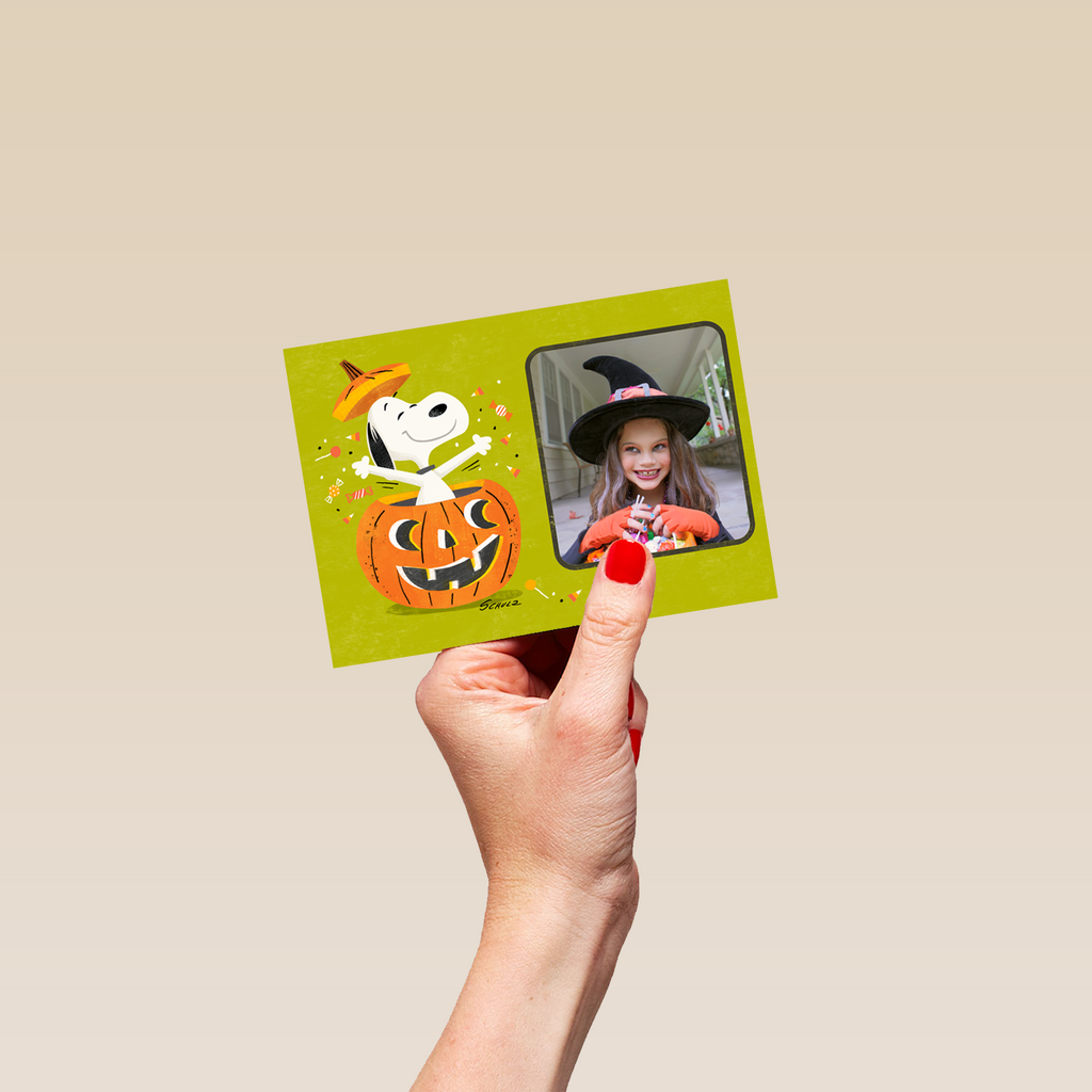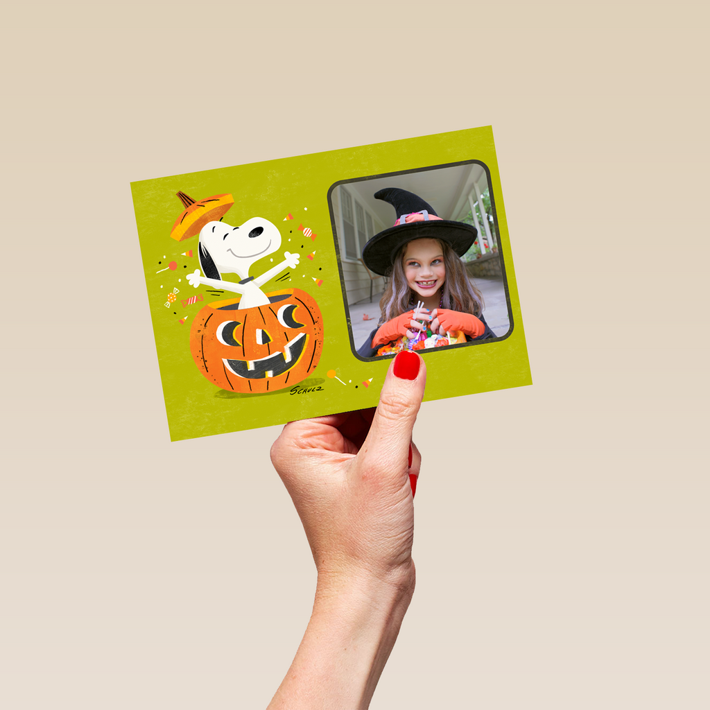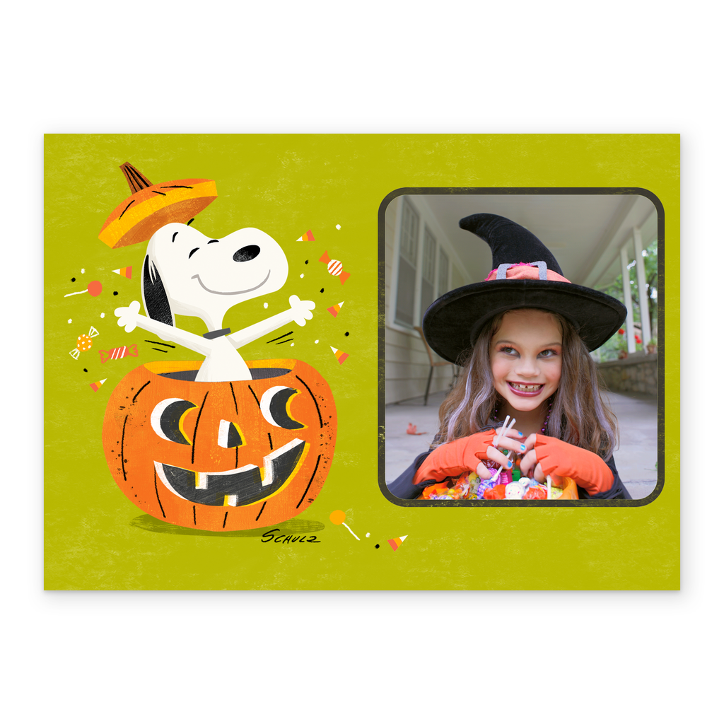 Printed on premium-quality board, this card features SNOOPY jumping out of a carved pumpkin, space to upload a photo, and comes complete with a co-ordinating white envelope.