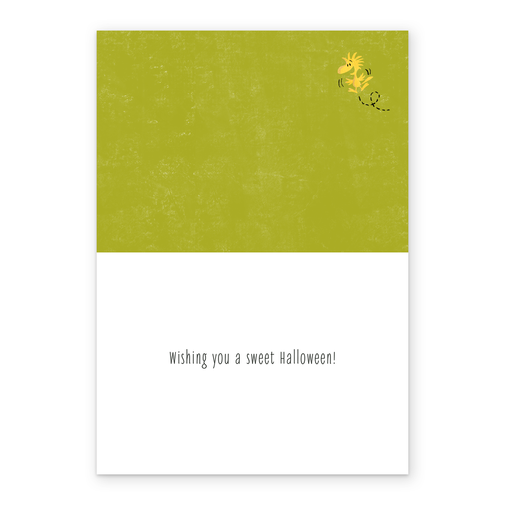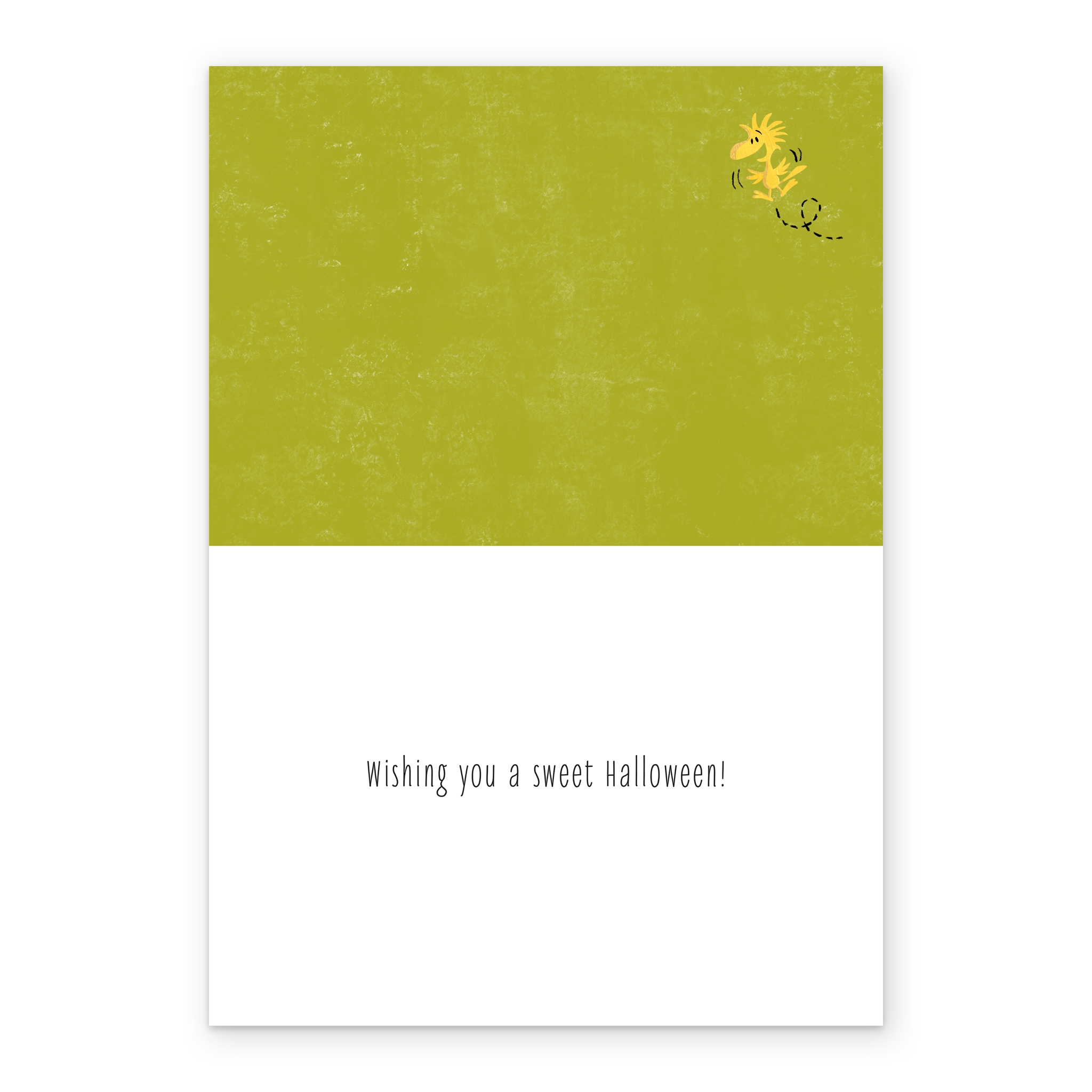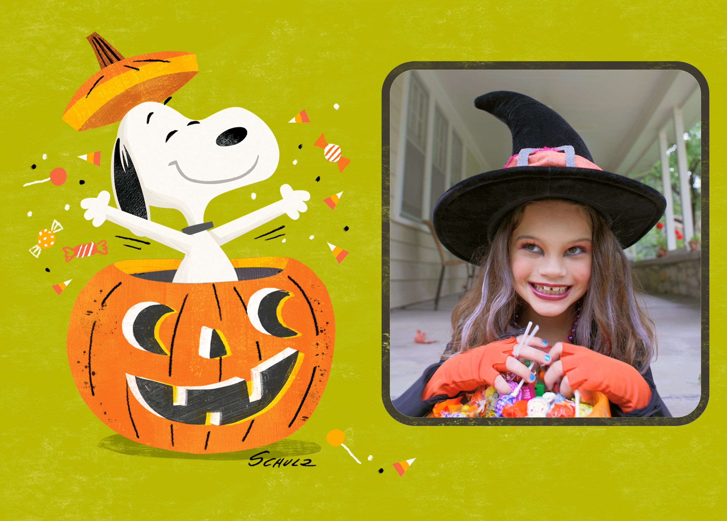 Printed on premium-quality board, this card features SNOOPY jumping out of a carved pumpkin, space to upload a photo, and comes complete with a co-ordinating white envelope.