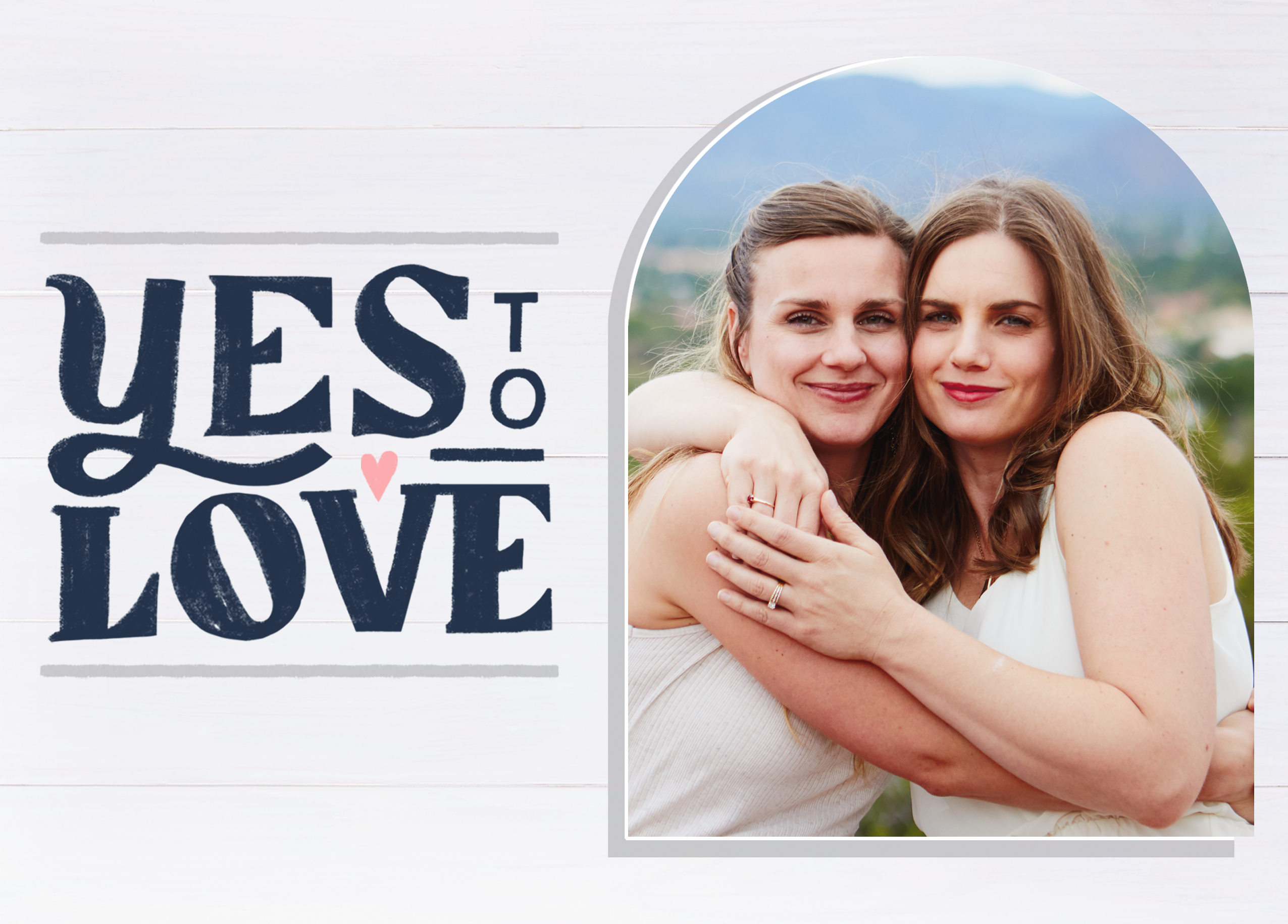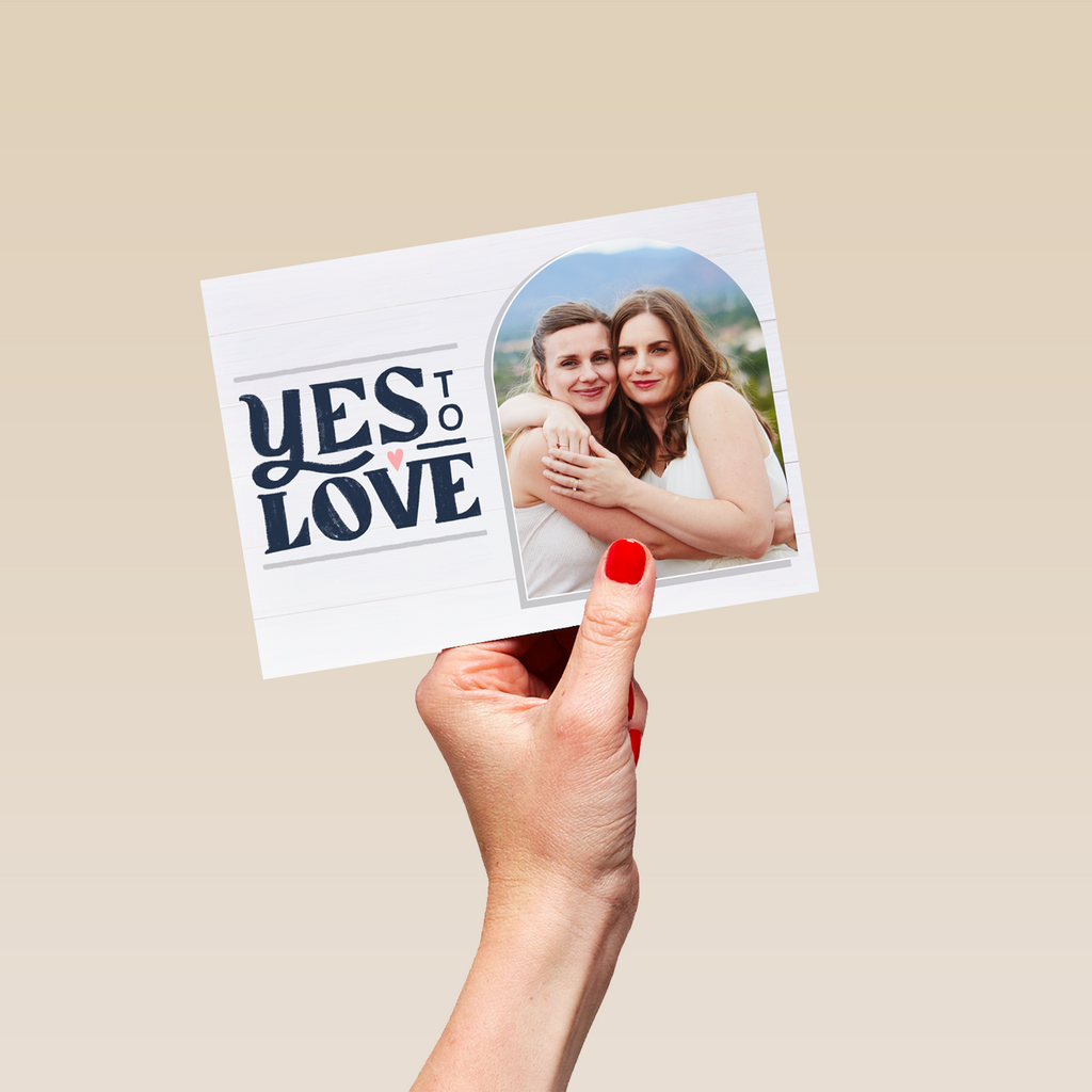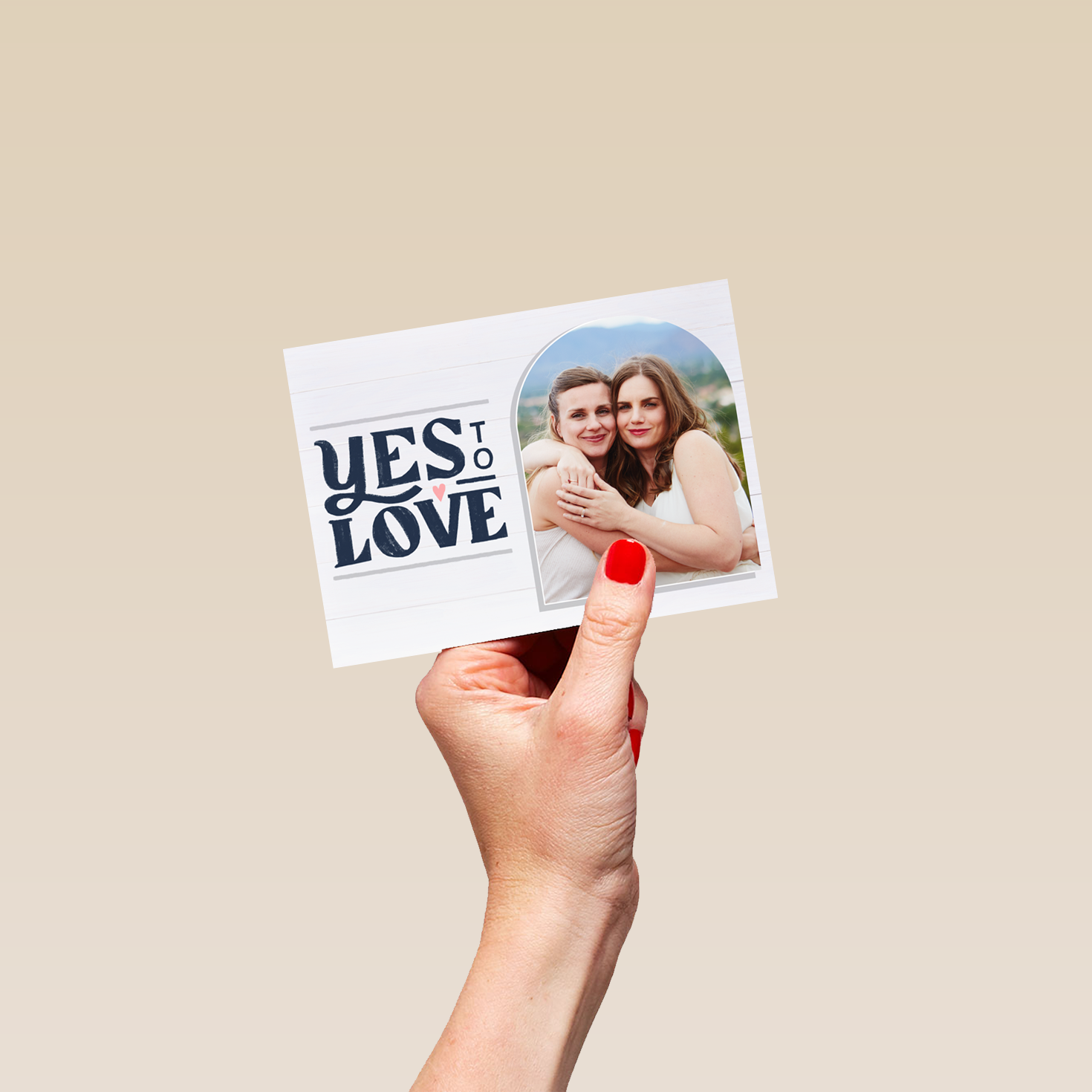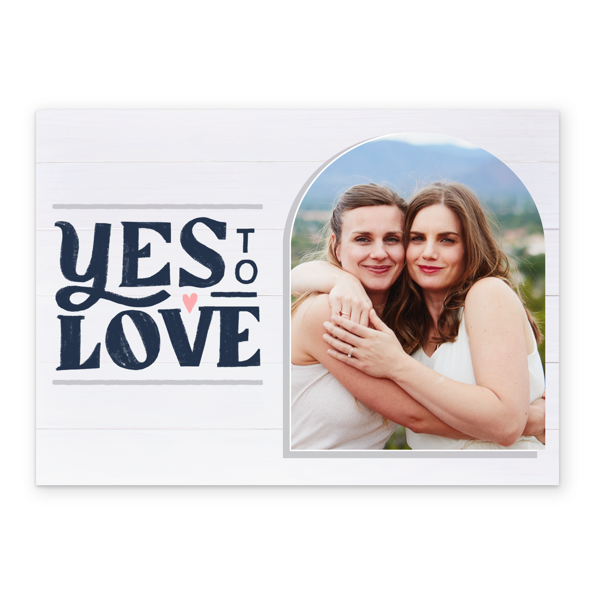 Printed on premium-quality board, this card features fun typography word art, with the message 'Yes To Love', space to upload a photo, and comes complete with a co-ordinating white envelope.