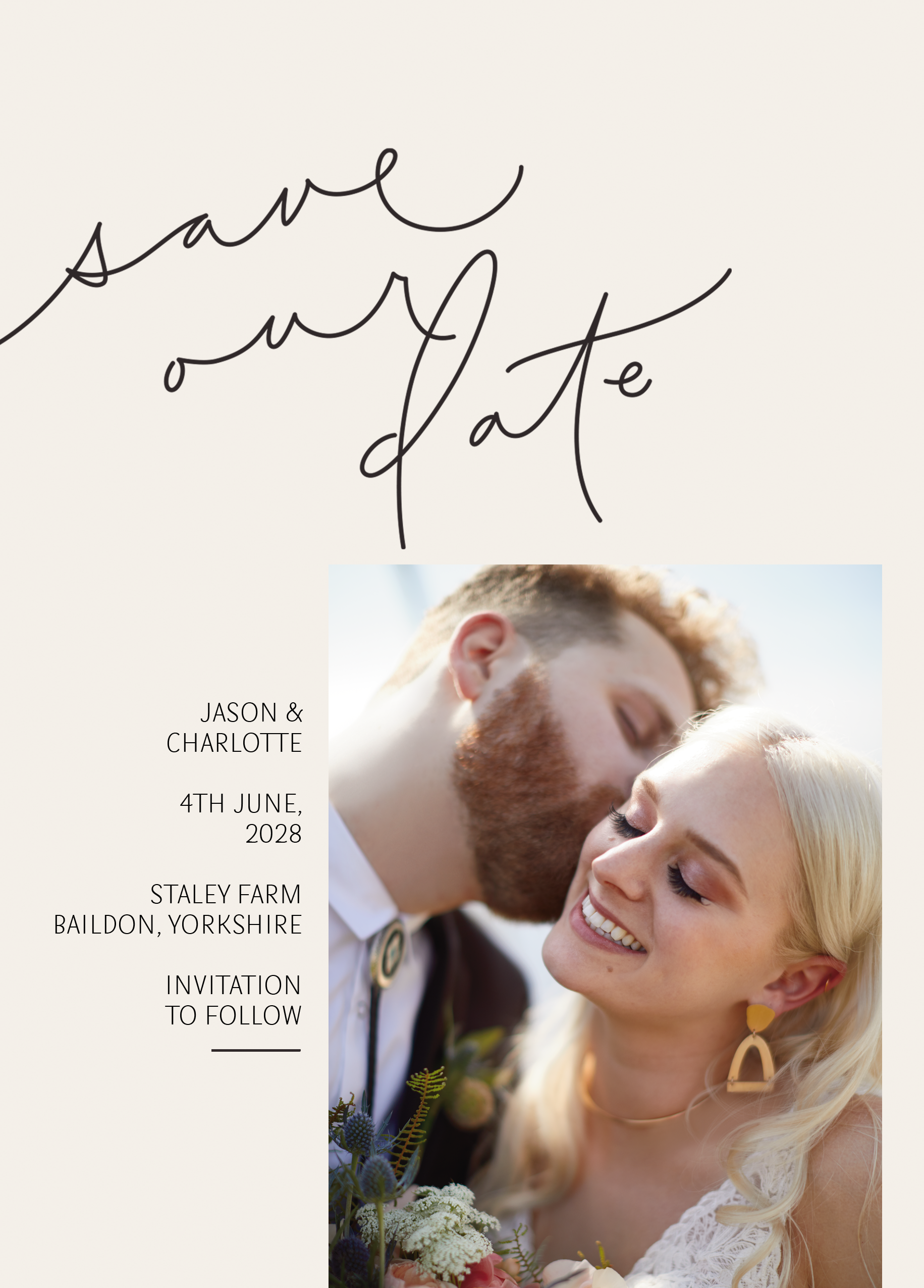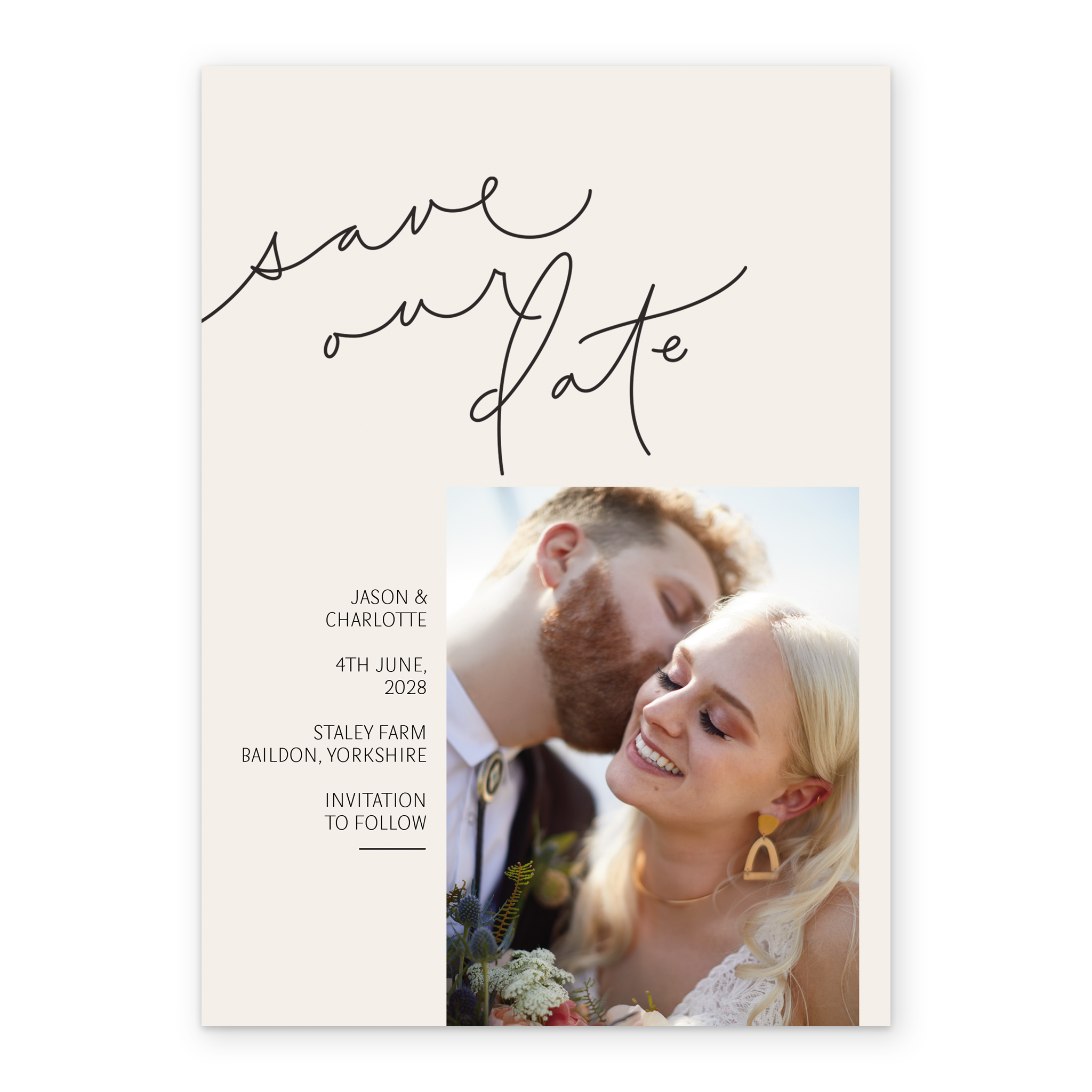 Make sure all your friends and family are ready for your big day with this simple and stylish 'Save the Date' personalised card design.