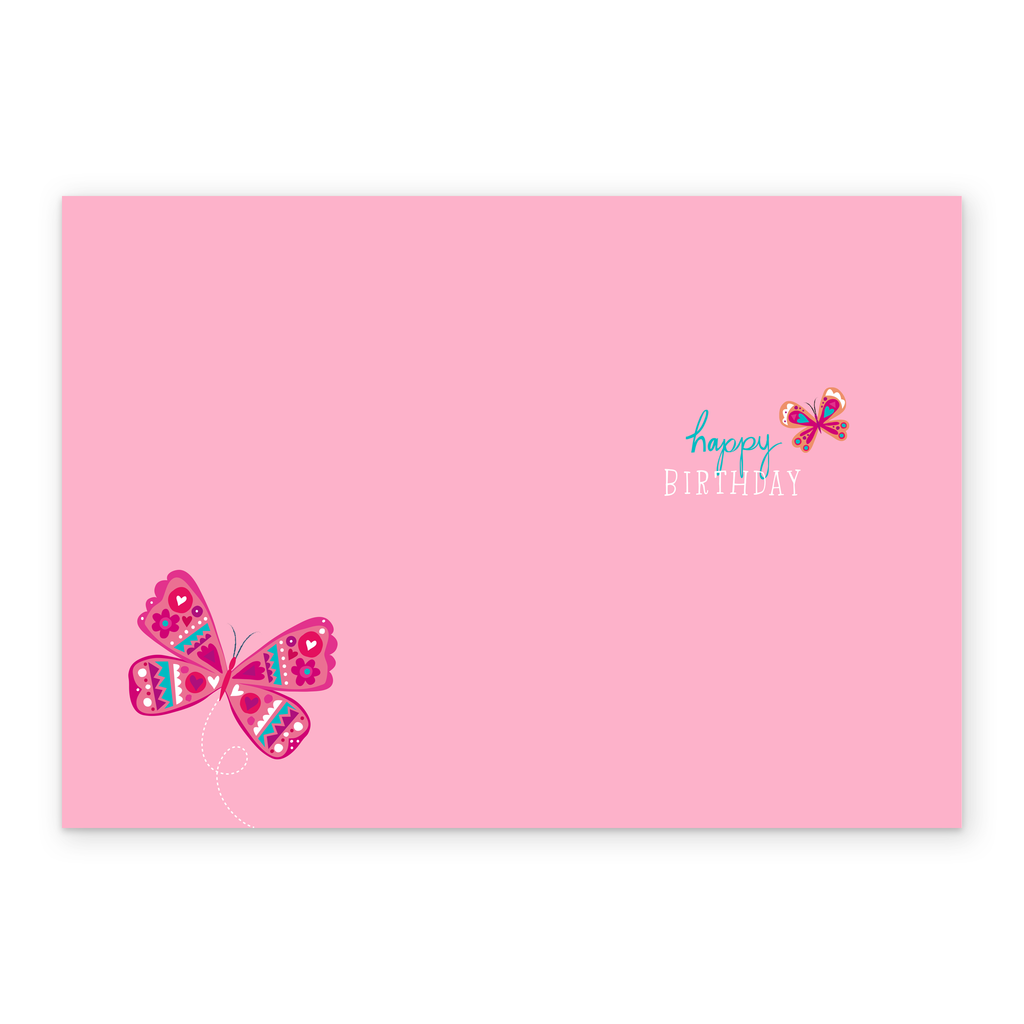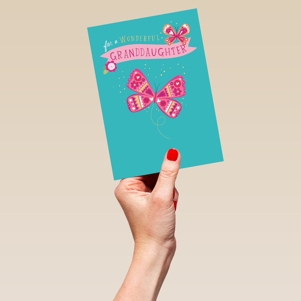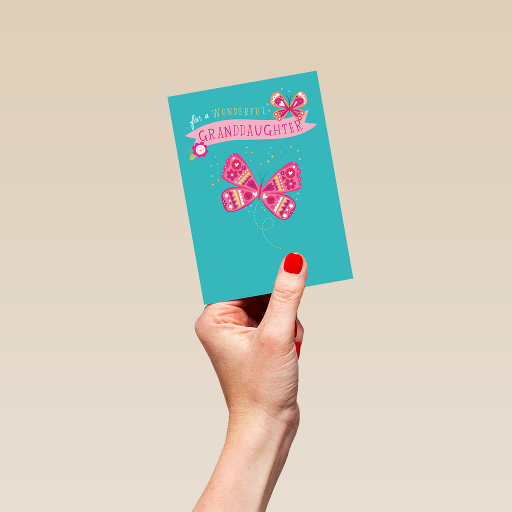 Show them you care with a personalised pink butterflies birthday card for granddaughter from Hallmark. Our birthday cards are printed on premium quality, FSC®-certified card & delivered nationwide. This card is available as standard 12cm by 16.7cm and large 15.5cm by 21.6cm.