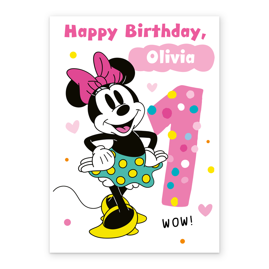 Wish a wonderful 1st birthday to the little girl in your life, with this fun personalised Disney Minnie Mouse first birthday card, perfect to keep the memories of their birthday for a lifetime.
