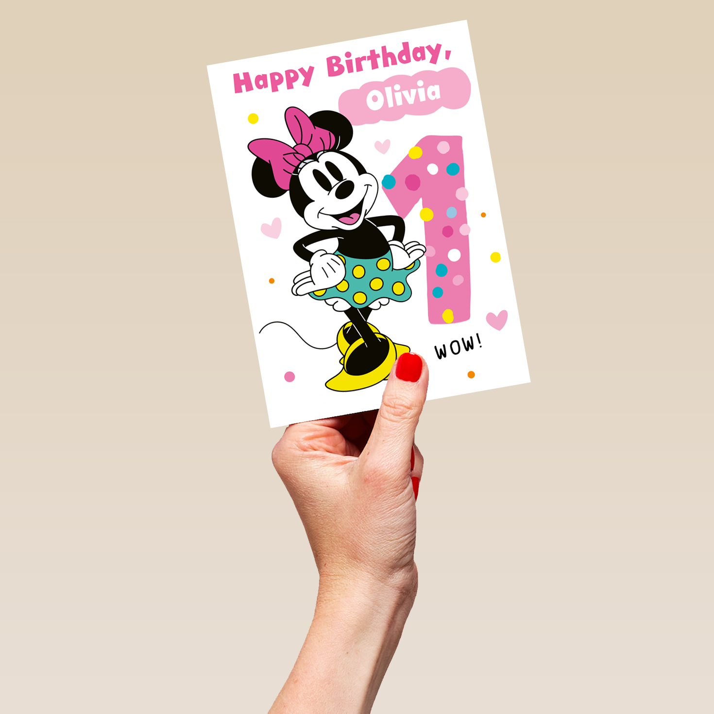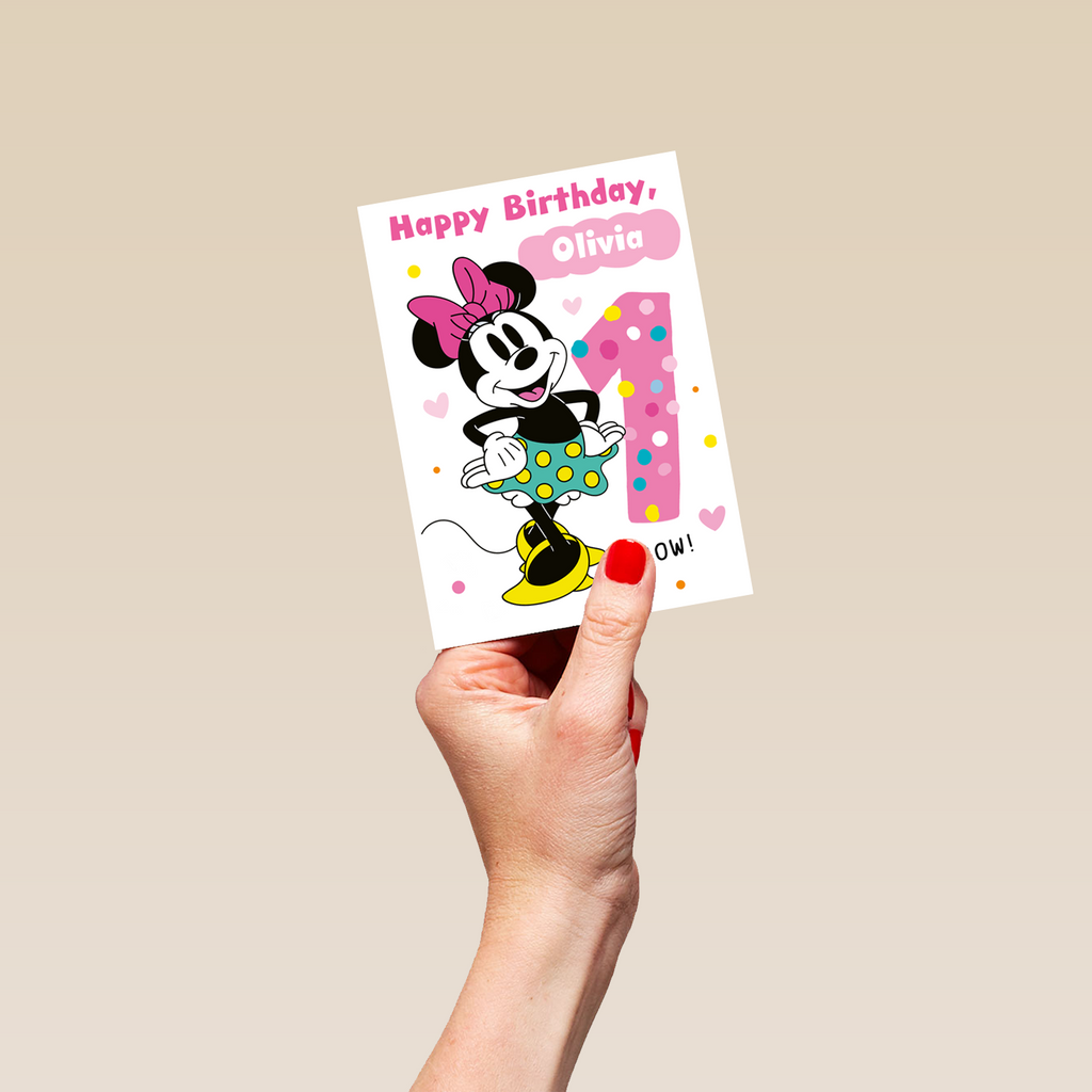 Printed on premium-quality board, this card features Disney's Minnie Mouse with her hands on her hips, with the message 'Happy Birthday, 1', space to personalise a name, and comes complete with a co-ordinating white envelope.