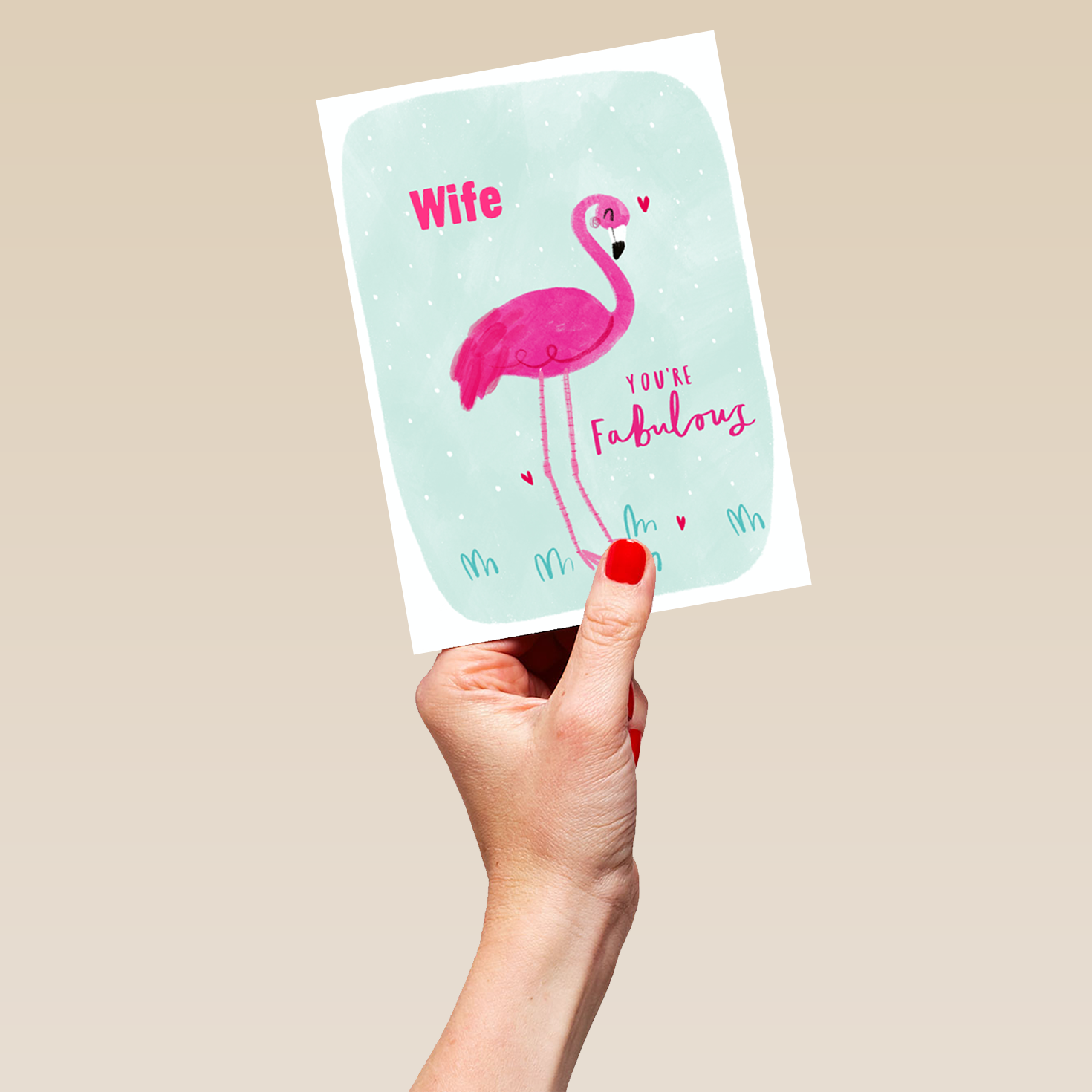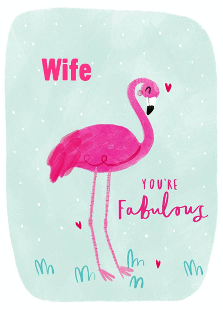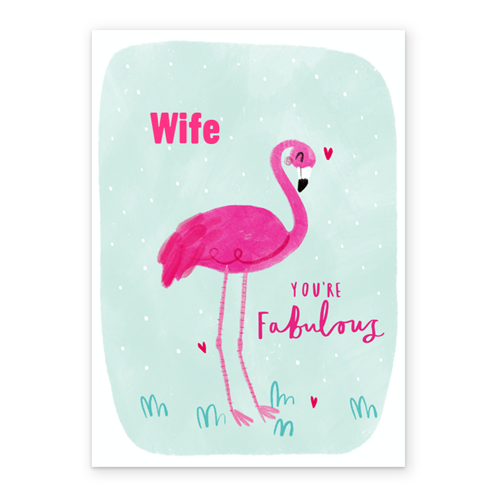 Show them you care with a personalised pink flamingo wife birthday card from Hallmark. Our birthday cards are printed on premium quality, FSC®-certified card & delivered nationwide. This card is available as standard 12cm by 16.7cm and large 15.5cm by 21.6cm.