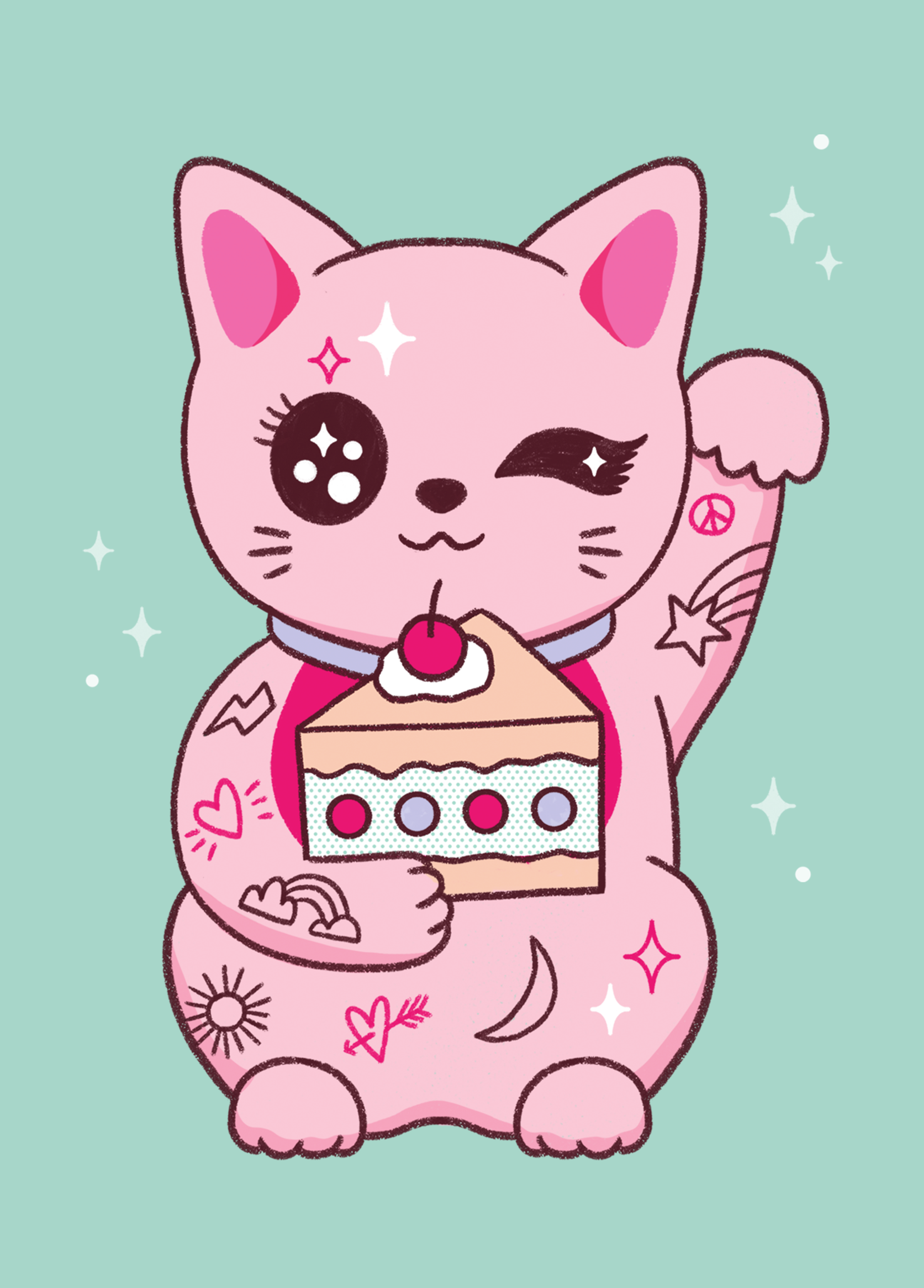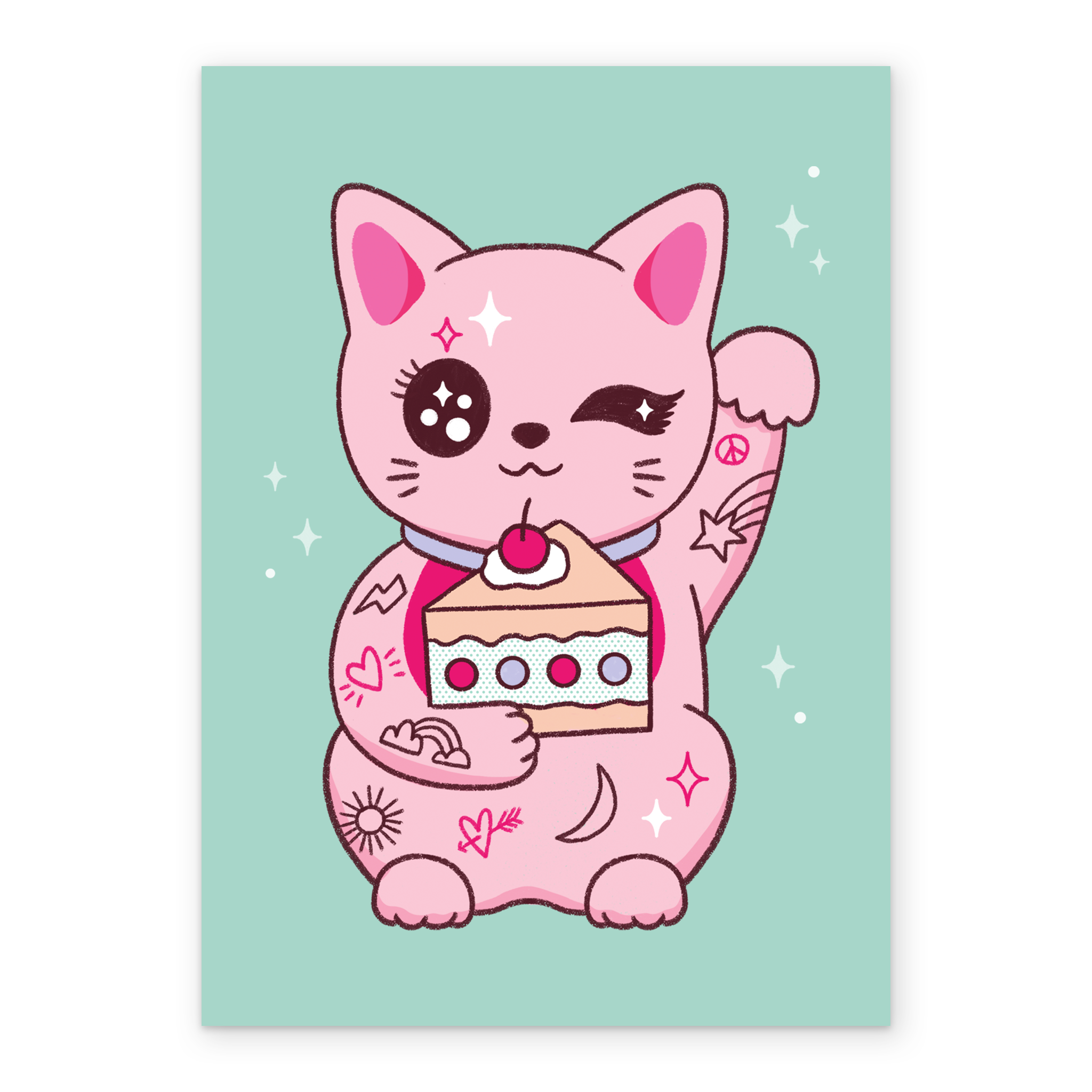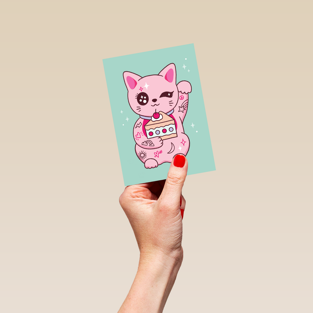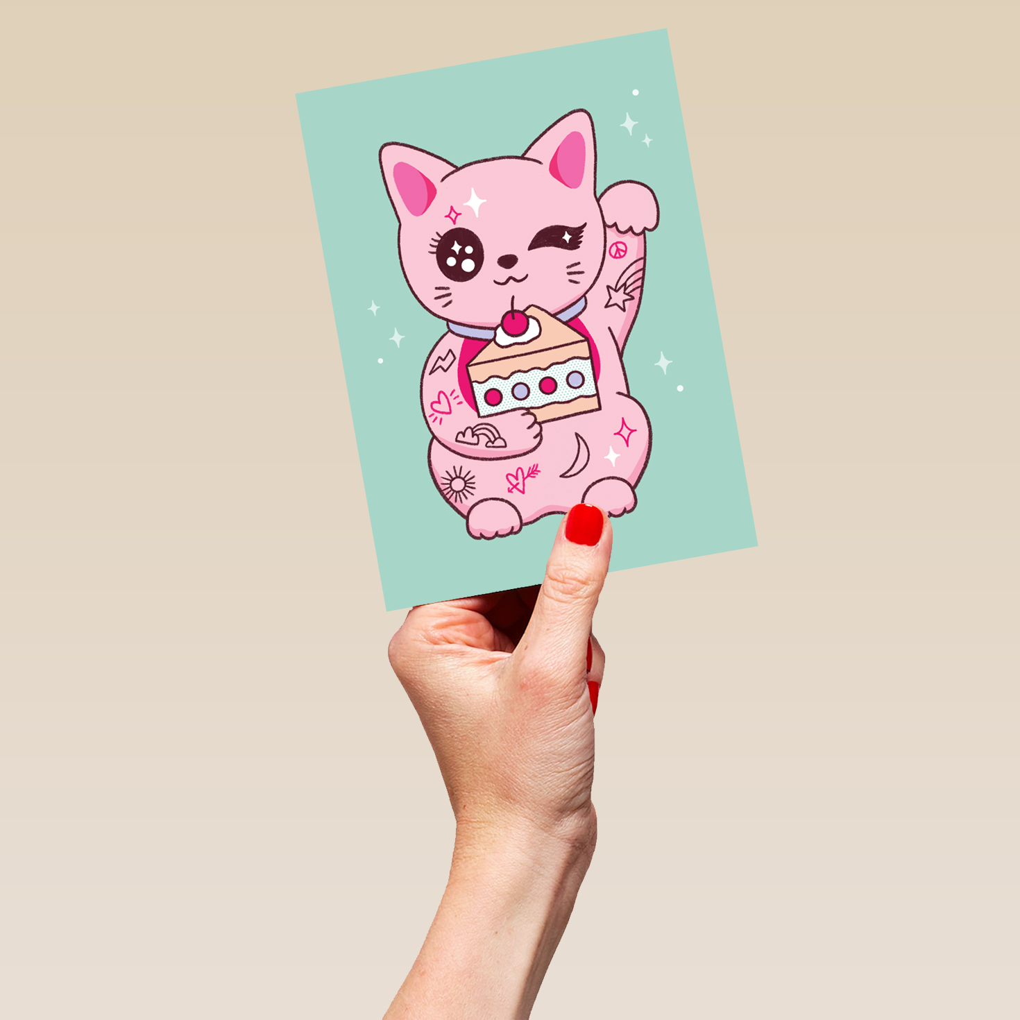 Printed on premium-quality board, this card features a cute pink cat holding a slice of cake, and comes complete with a co-ordinating white envelope.