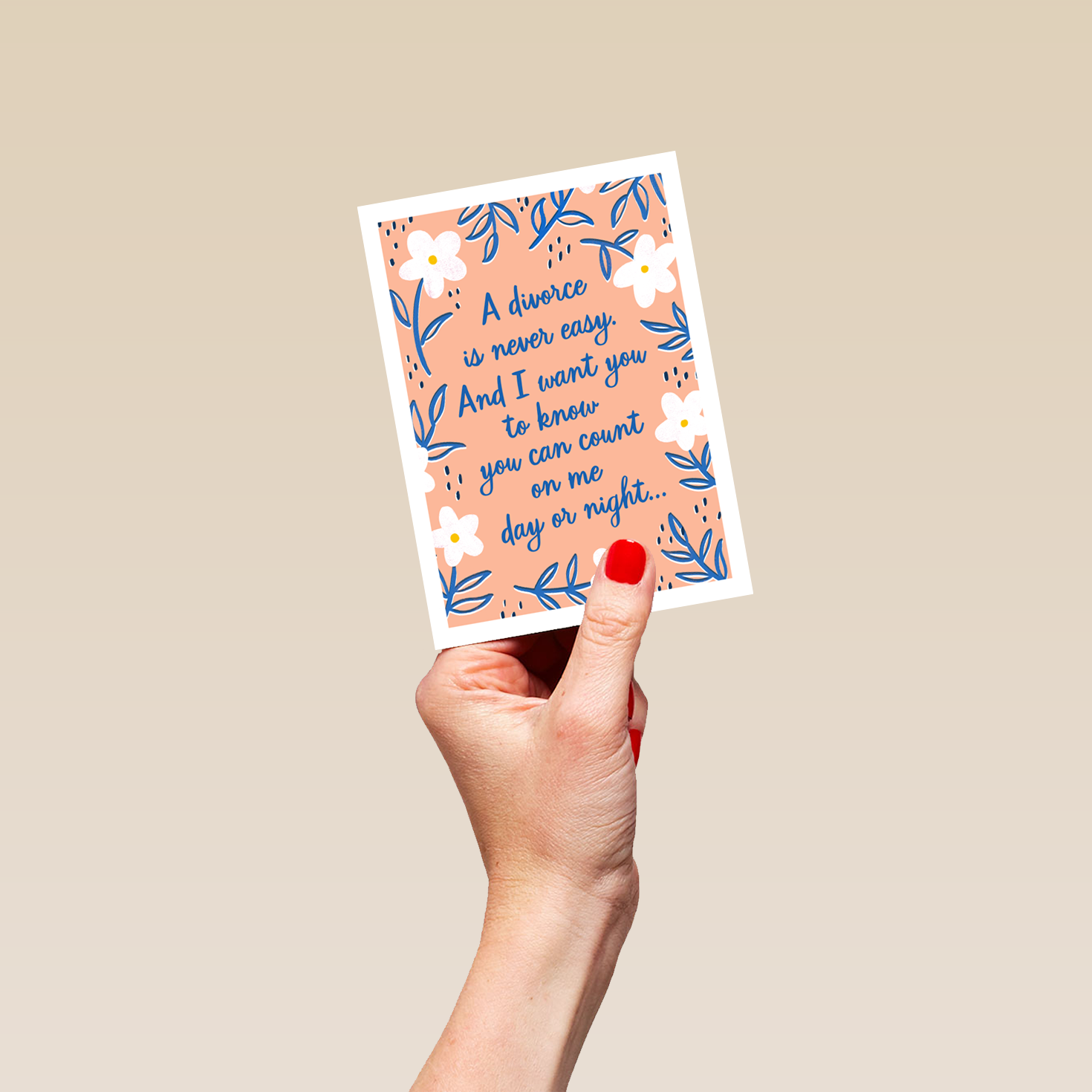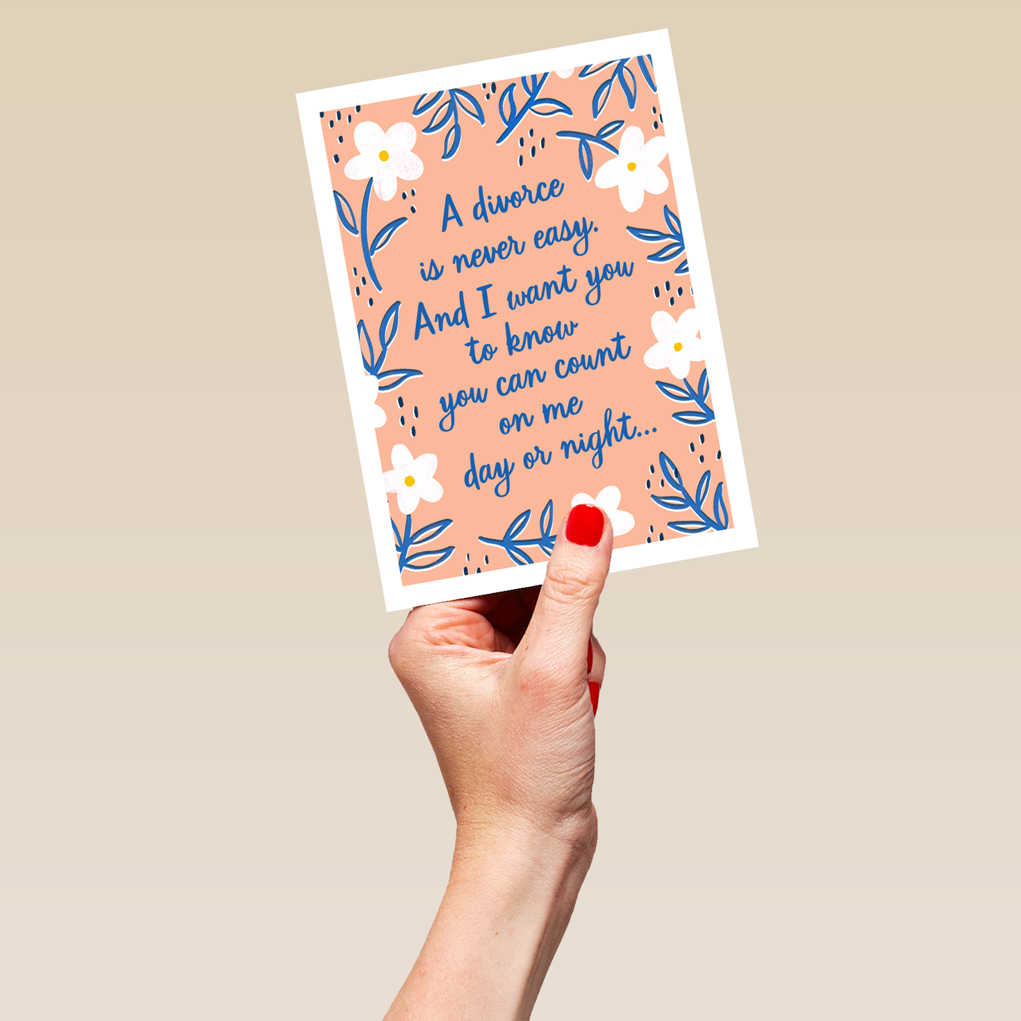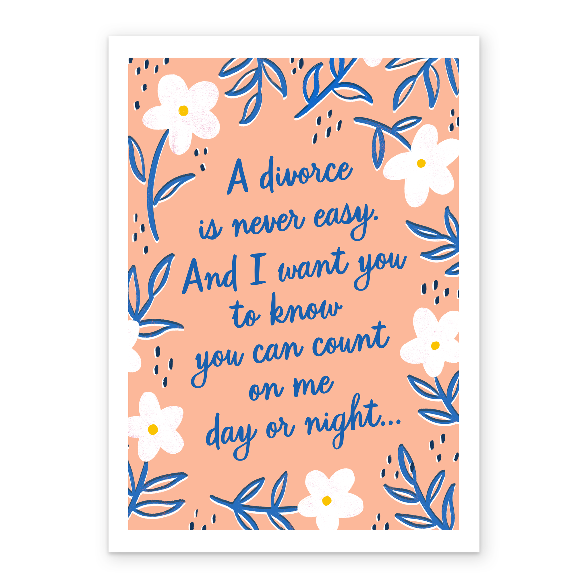 Printed on premium-quality board, this card features a simple and colourful floral design, with the message 'A divorce is never easy. And I want you to know you can count on me day or night...', and comes complete with a co-ordinating white envelope.