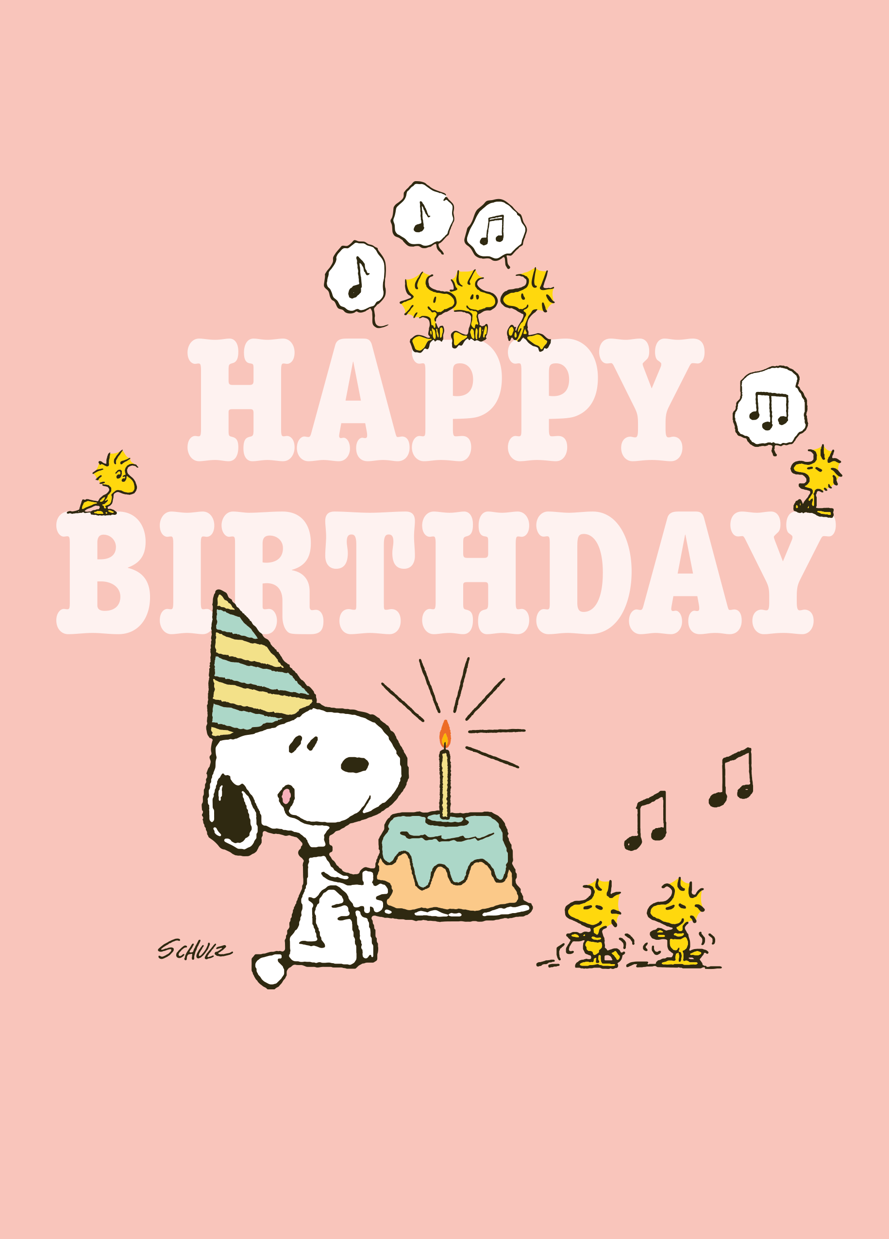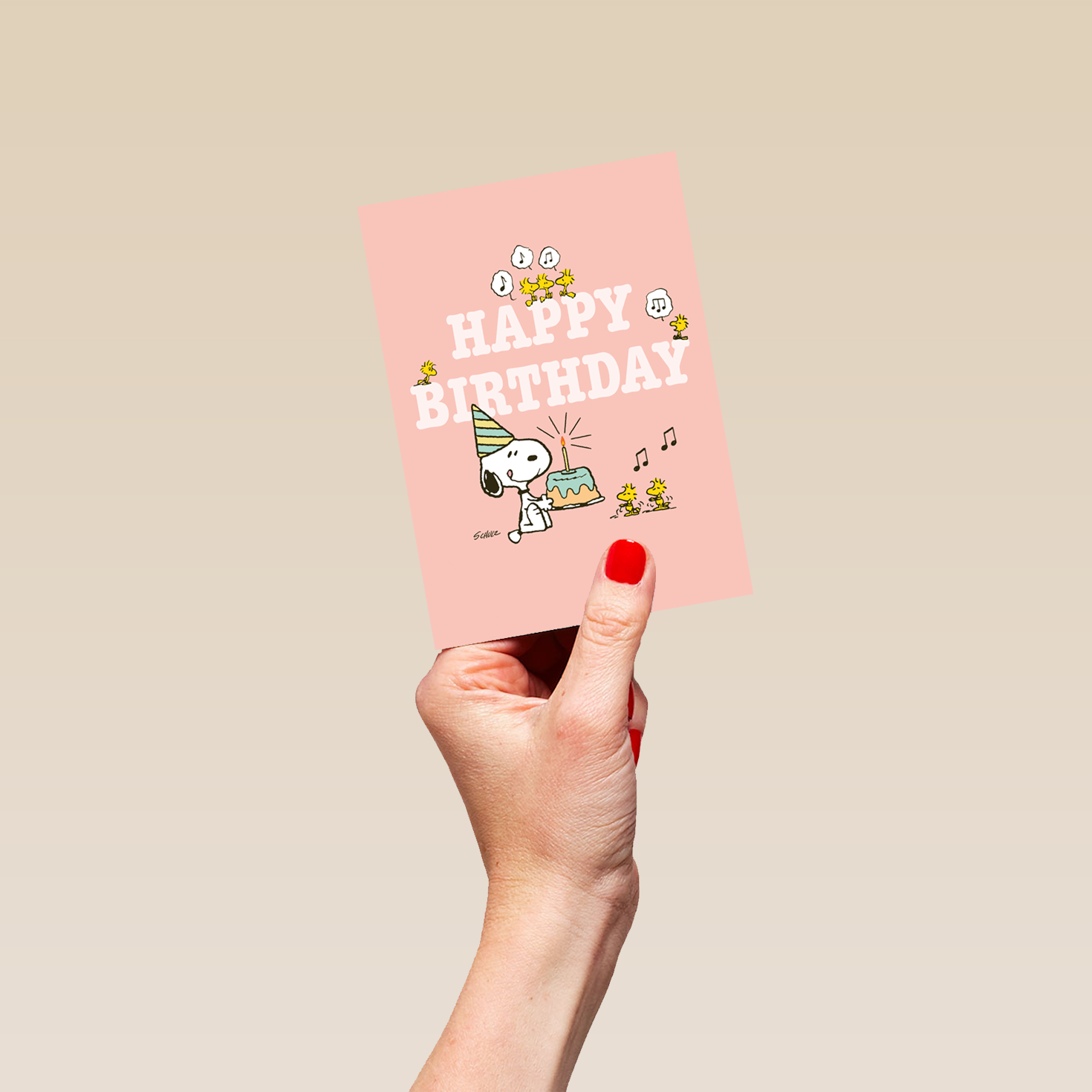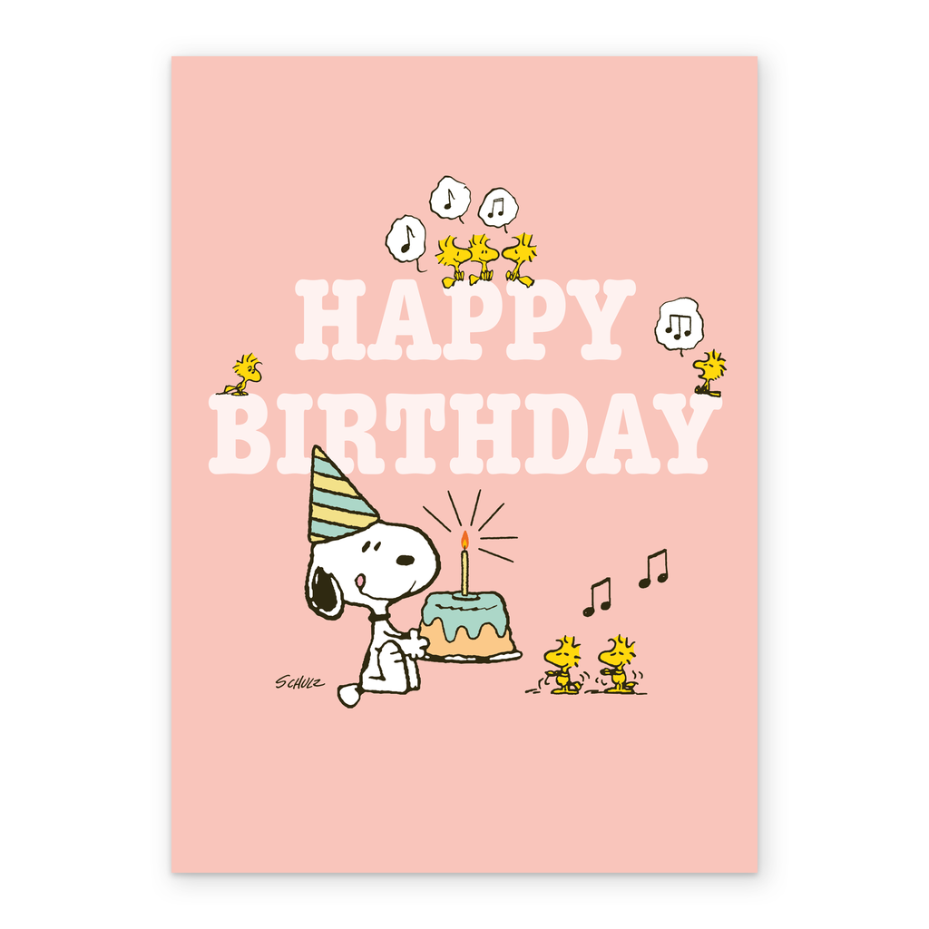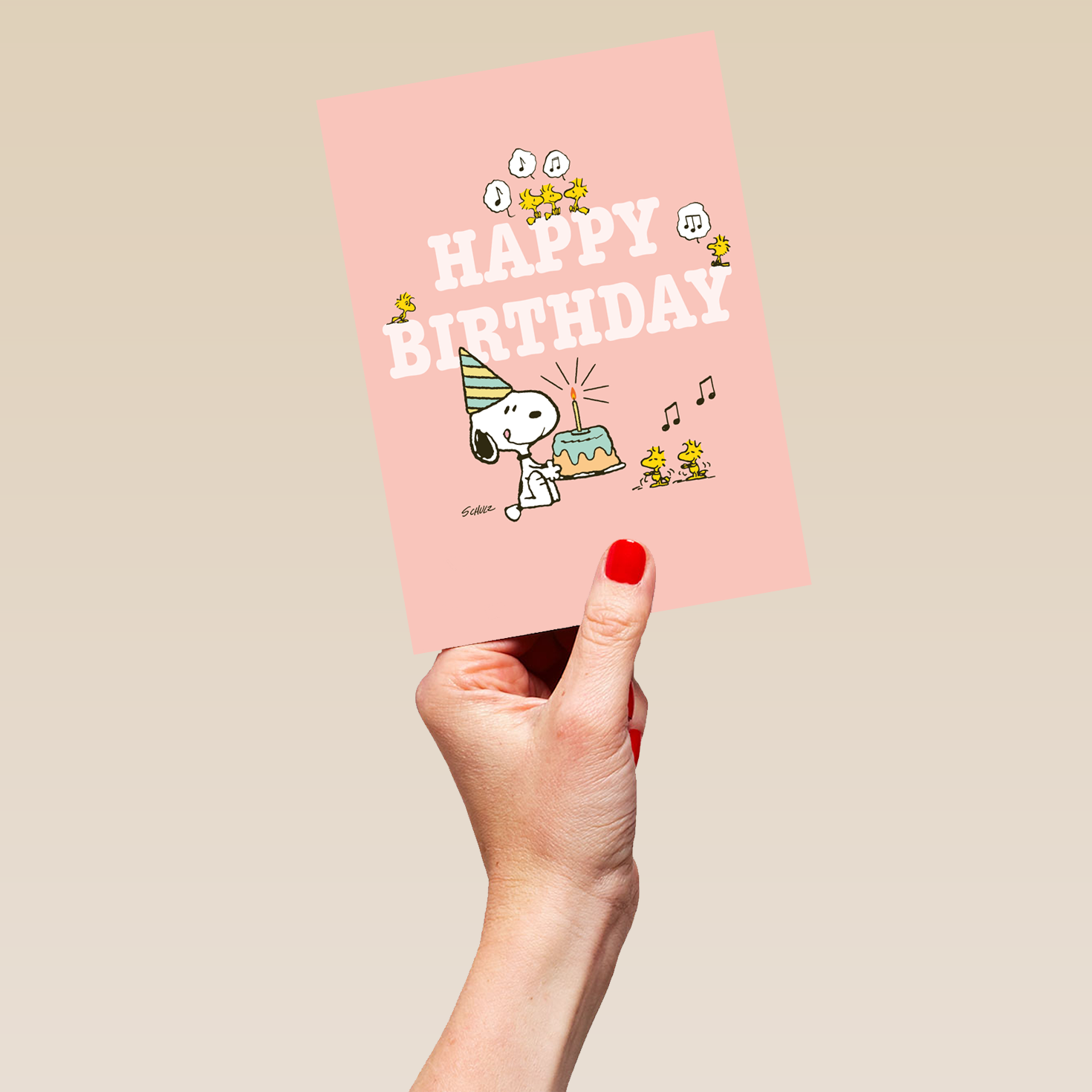 Printed on premium-quality board, this card features PEANUTS' SNOOPY wearing a party hat, with a birthday cake, with WOODSTOCK and his friends singing, with the message 'Happy Birthday', and comes complete with a co-ordinating white envelope.