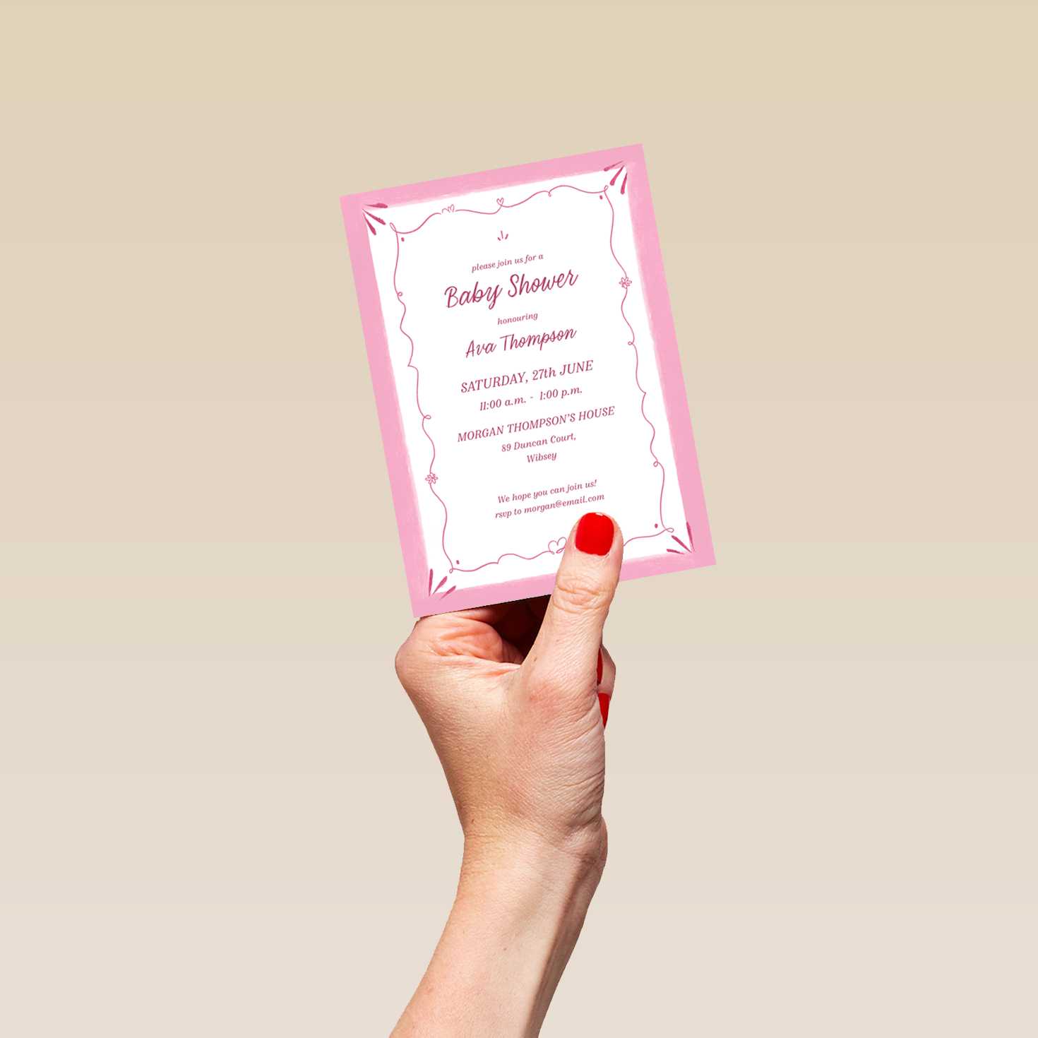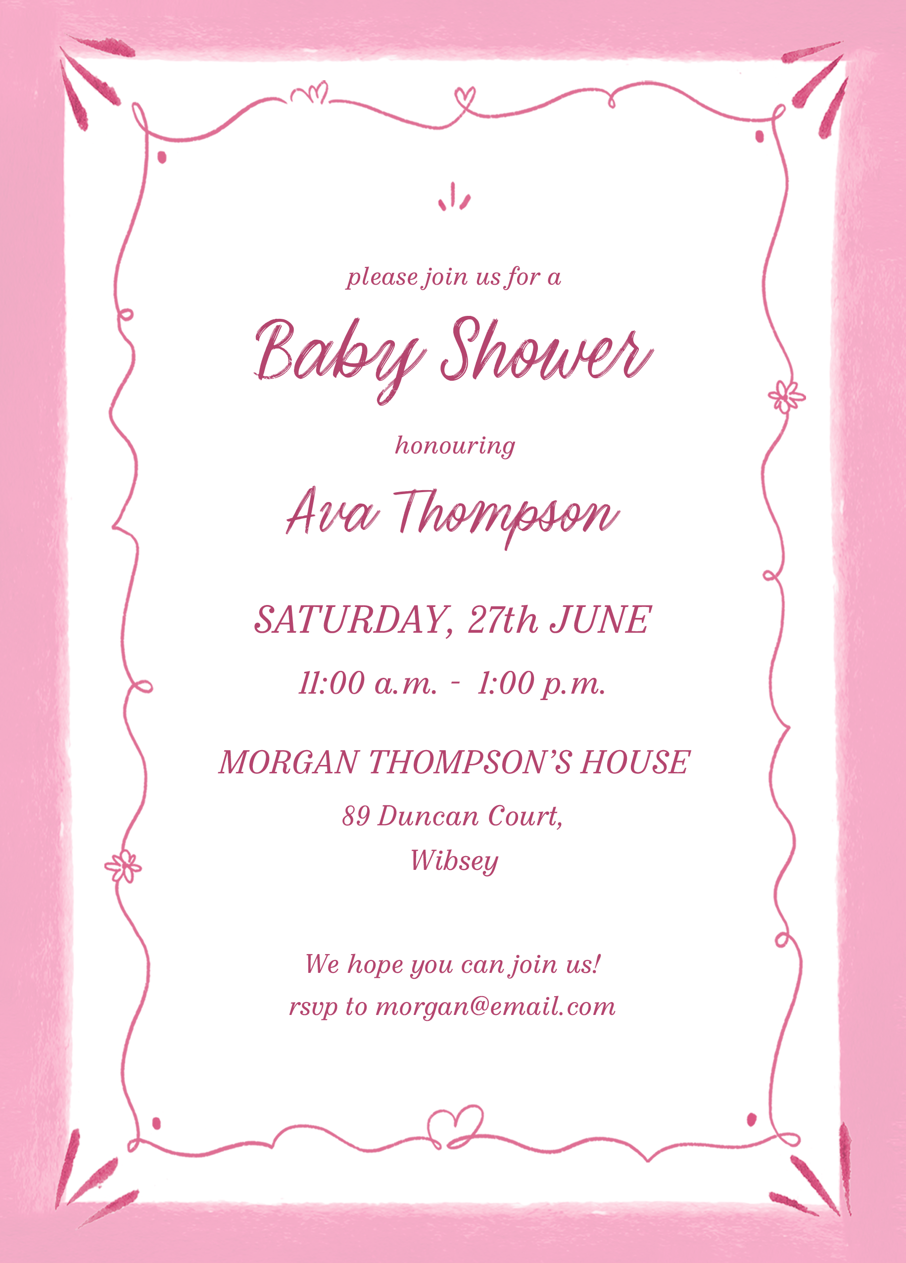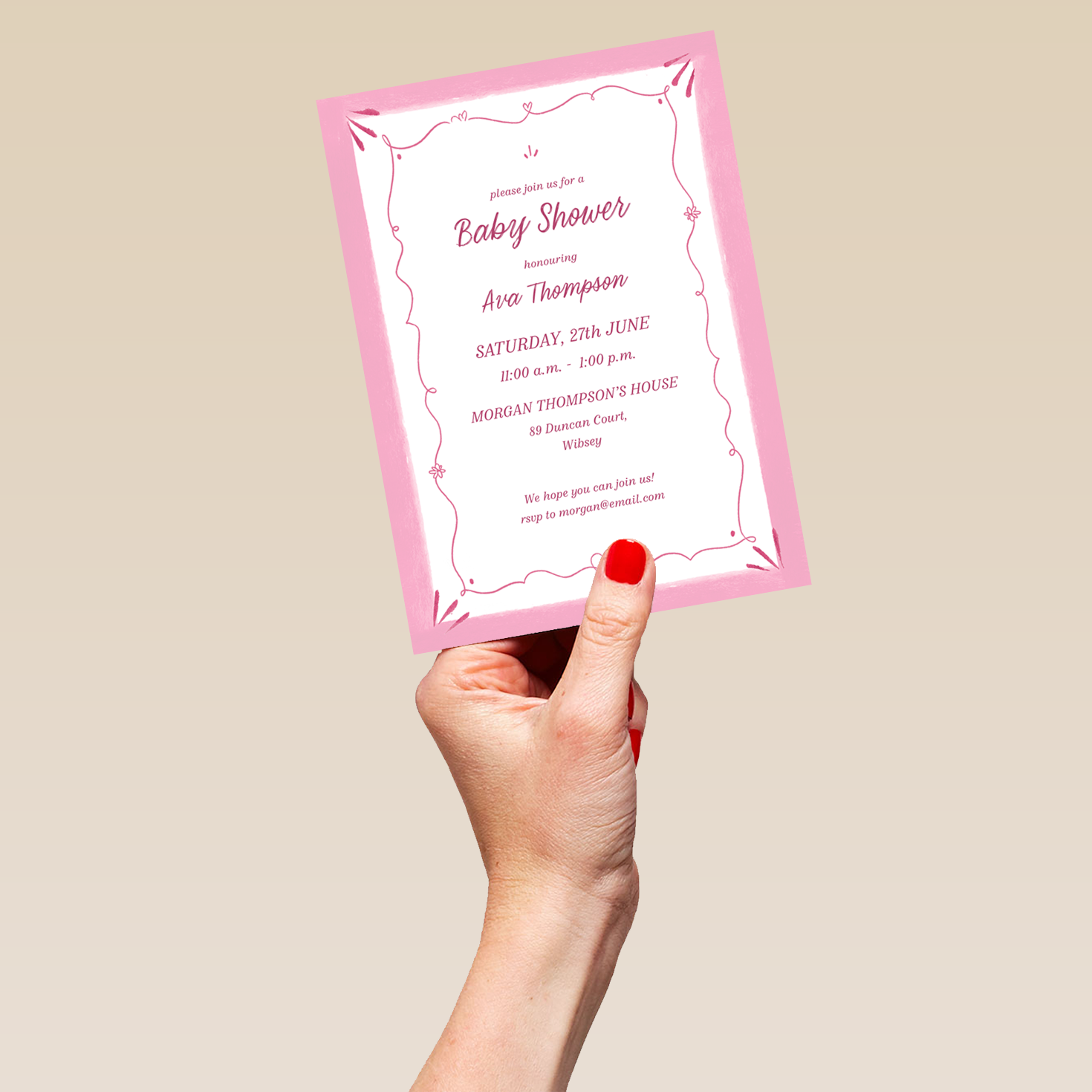 Printed on premium-quality board, this card features a pale pink border surrounding a white central panel with pink design details and lettering, with the message 'Please join us for a baby shower honouring [NAME] [DATE] [ADDRESS] We hope you can join us! Rsvp to [EMAIL ADDRESS]', space to personalise your message, and comes complete with a co-ordinating white envelope.