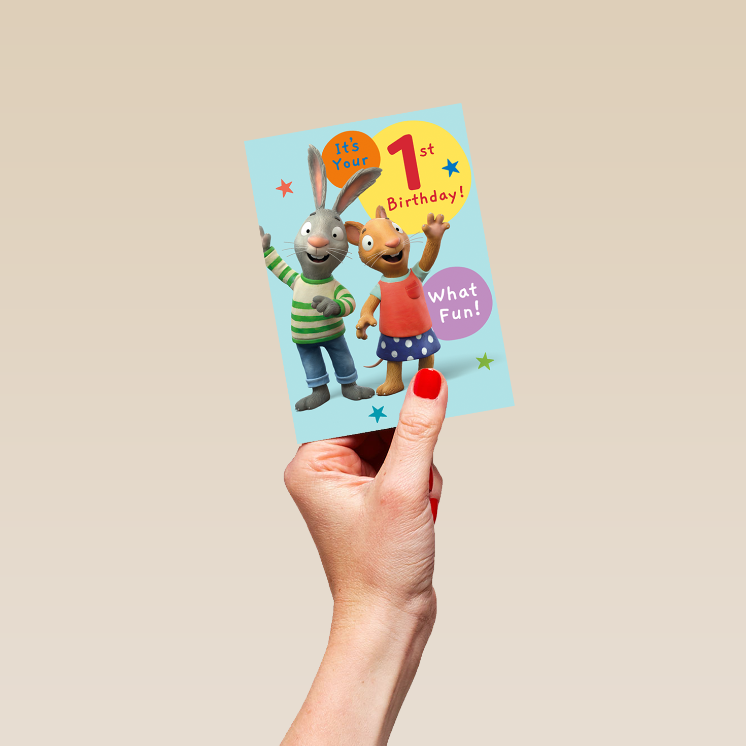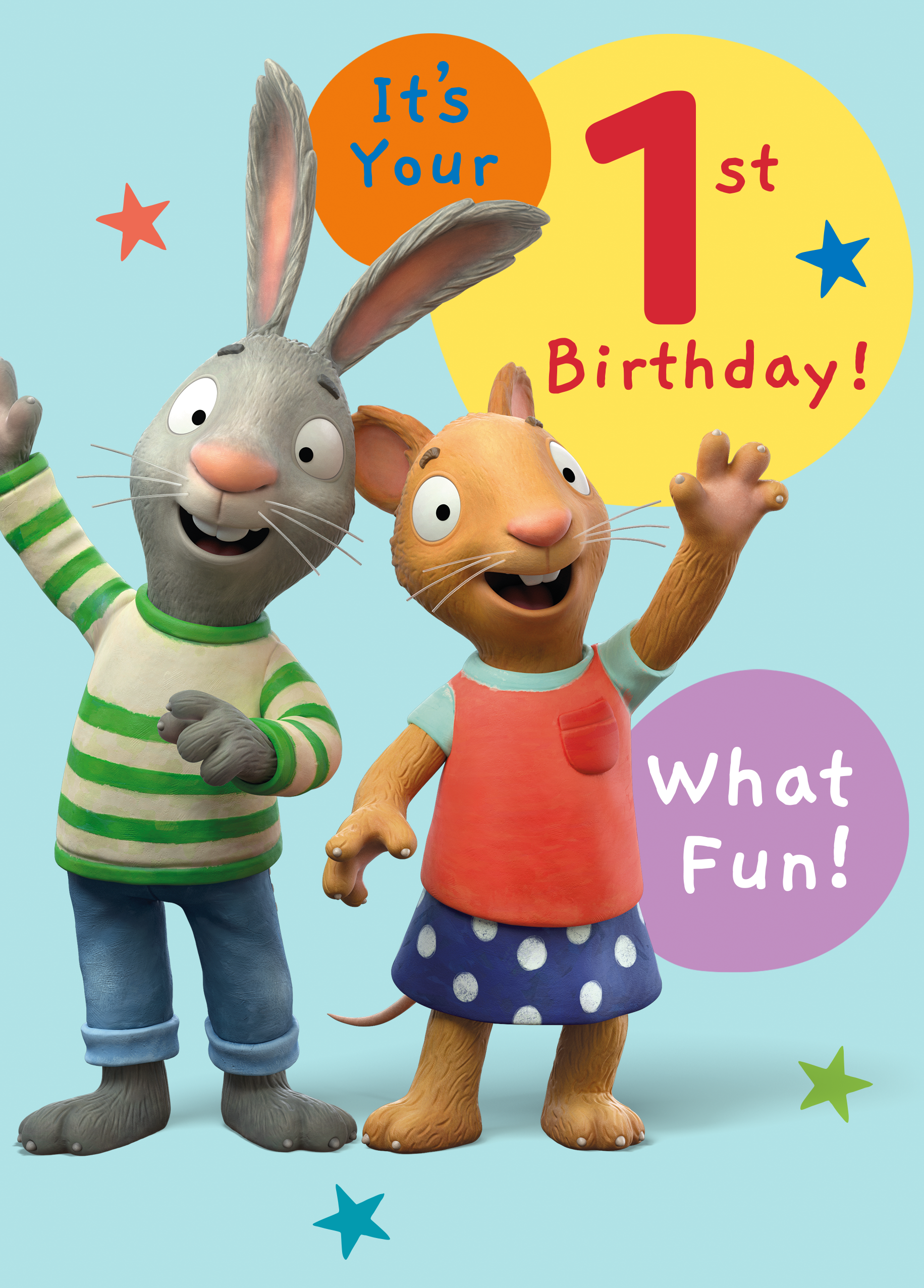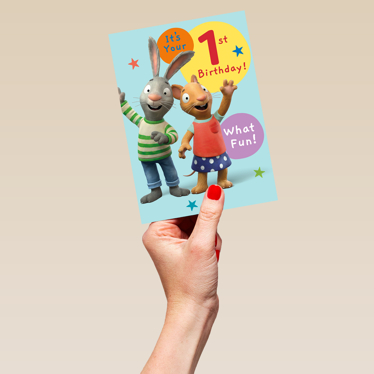 Printed on premium-quality board, this card features a fun Colour-in Activity on the inside and a front-page design showing Pip and Posy waving against a pale blue background dotted with colourful stars, with orange, bright yellow and lilac circles surrounding them containing blue, red and white lettering, with the message 'It's Your 1st Birthday! What Fun!', and comes complete with a co-ordinating white envelope.