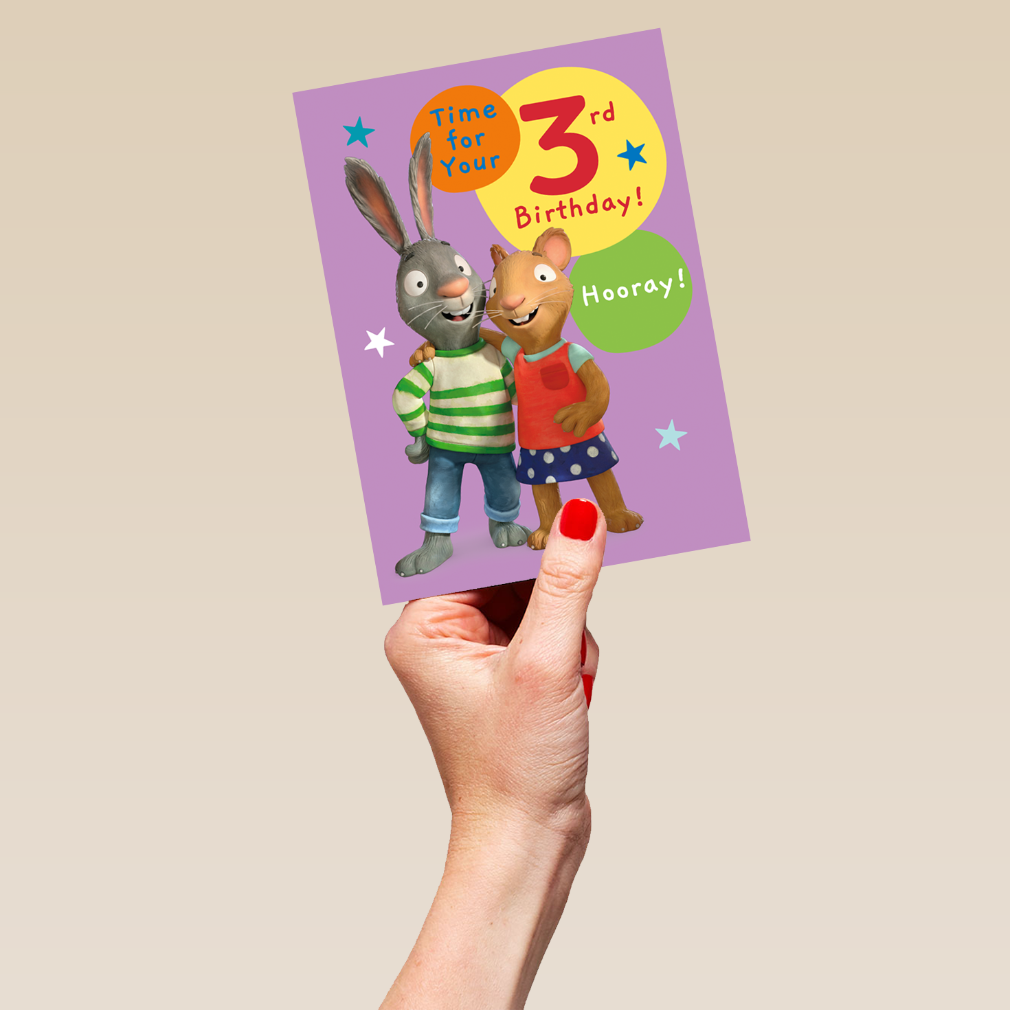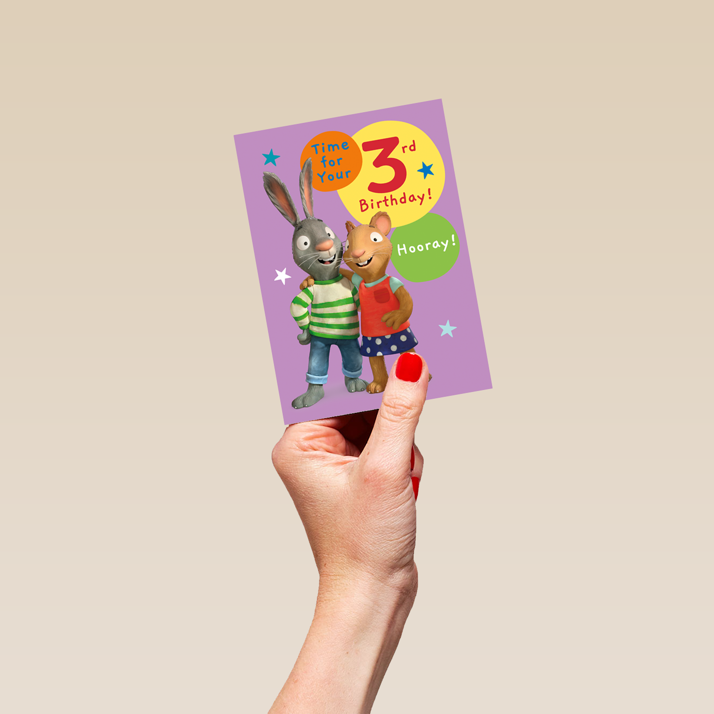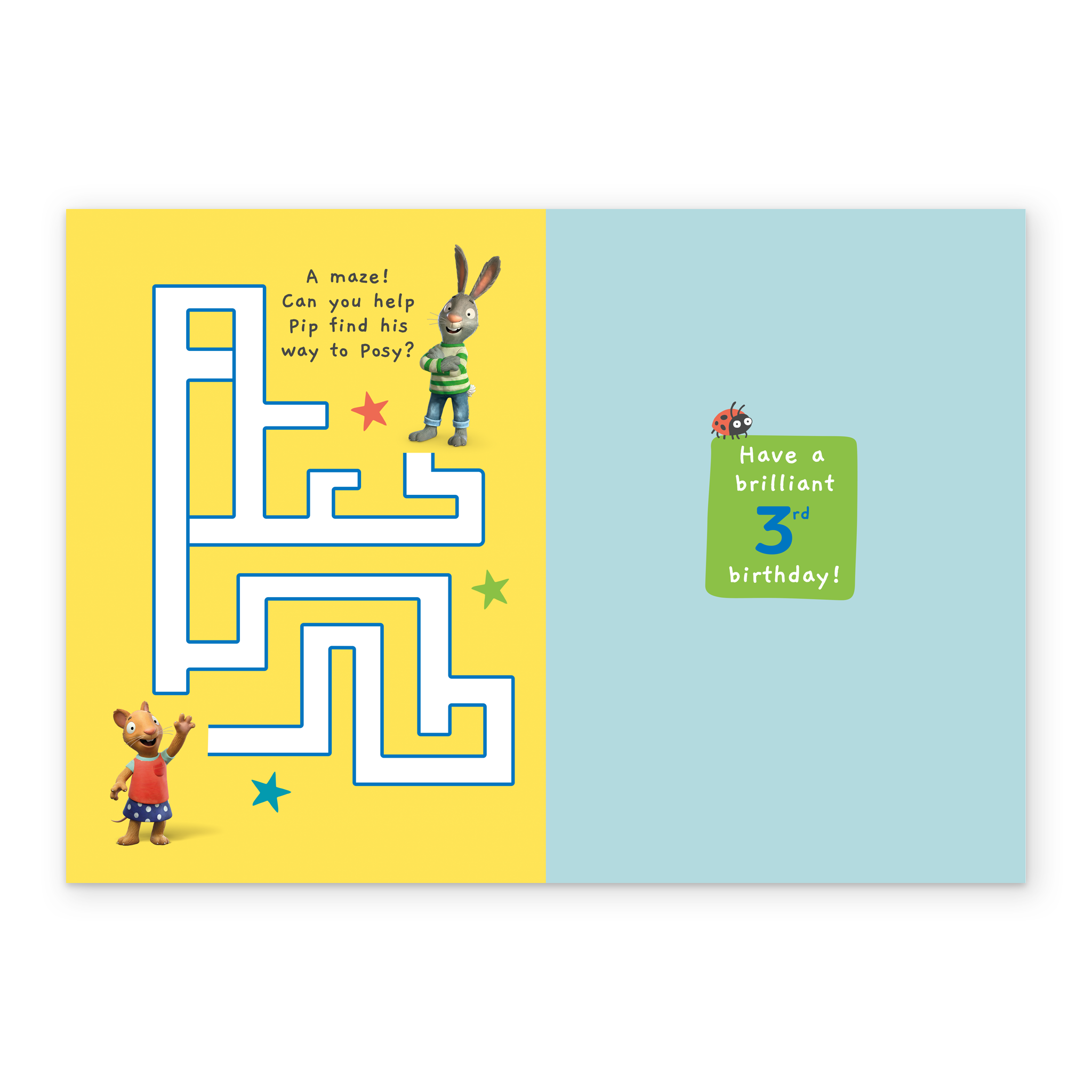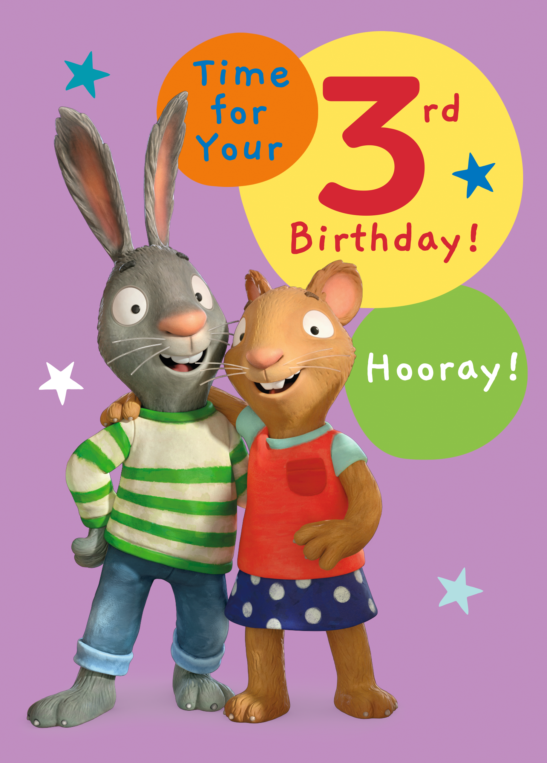 Printed on premium-quality board, this card features a fun Maze Activity on the inside and a front-page design showing Pip and Posy with their arms around each other's shoulders against a lilac background dotted with colourful stars, with orange, bright yellow and bright green circles surrounding them containing blue, red and white lettering, with the message 'Time For Your 3rd Birthday! Hooray!', and comes complete with a co-ordinating white envelope.
