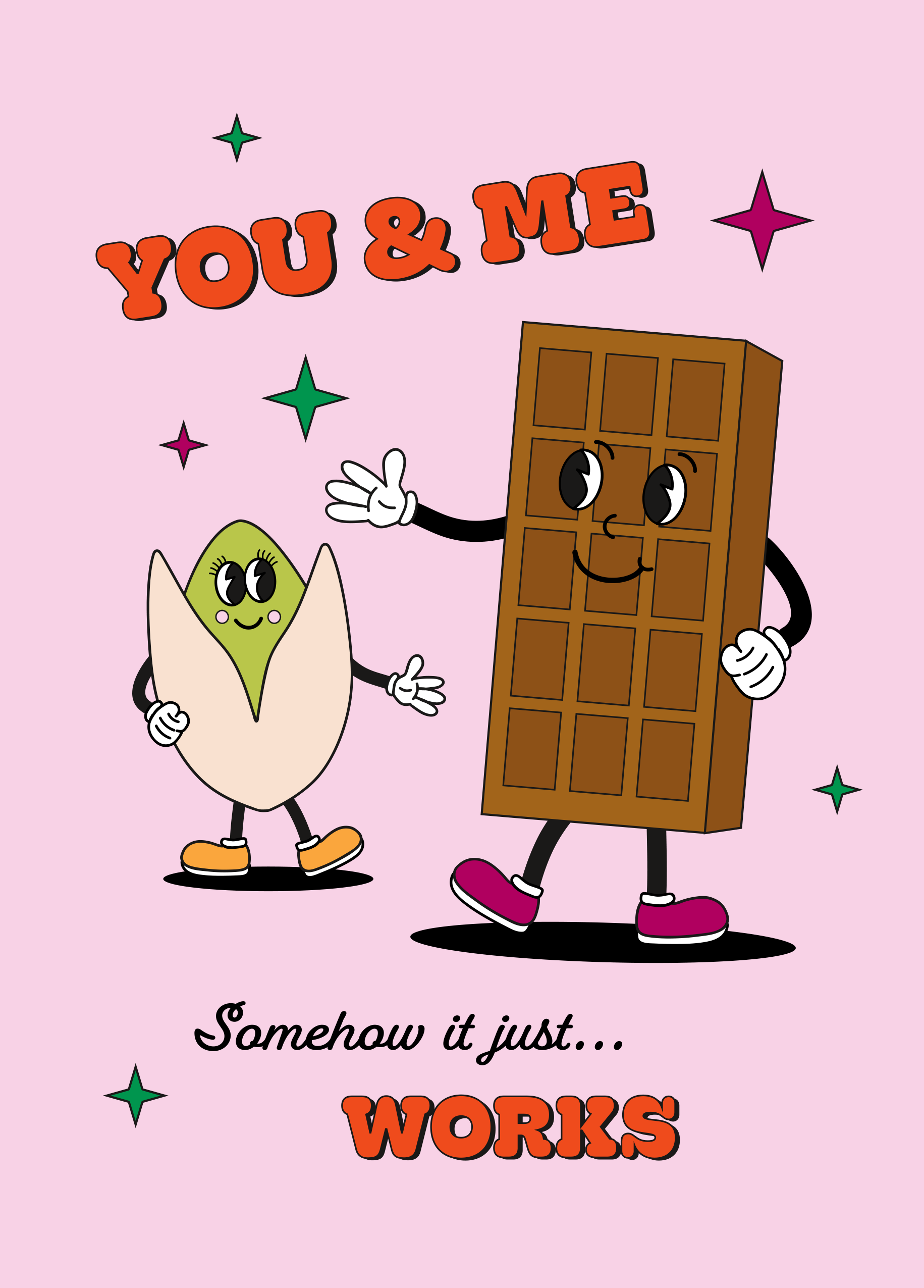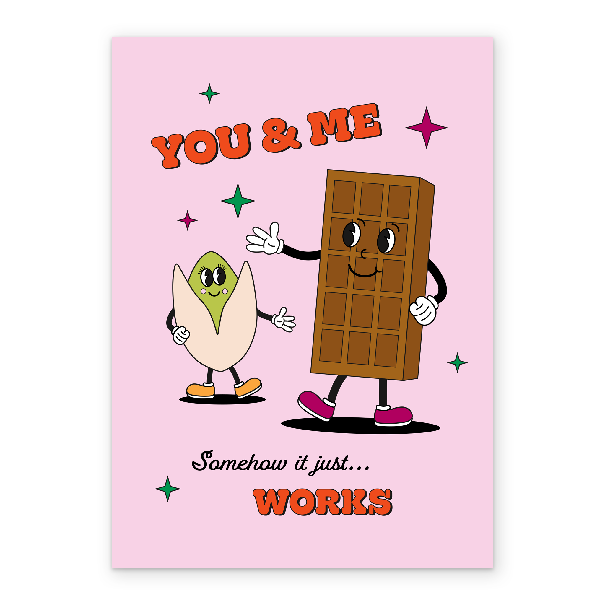 Printed on premium-quality board, this card features a soft pink background with an illustrated pistachio and bar of chocolate in the centre surrounded by stars and with bold red lettering above and below the illustration, with the message 'You & Me. Somehow it just… works', and comes complete with a co-ordinating white envelope.