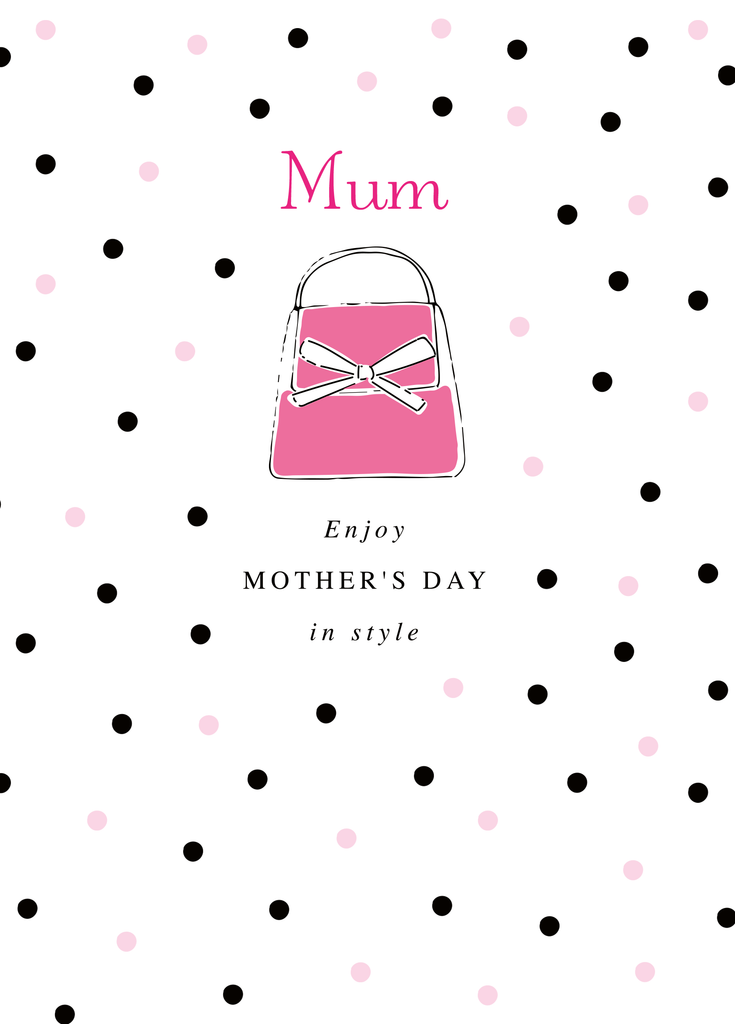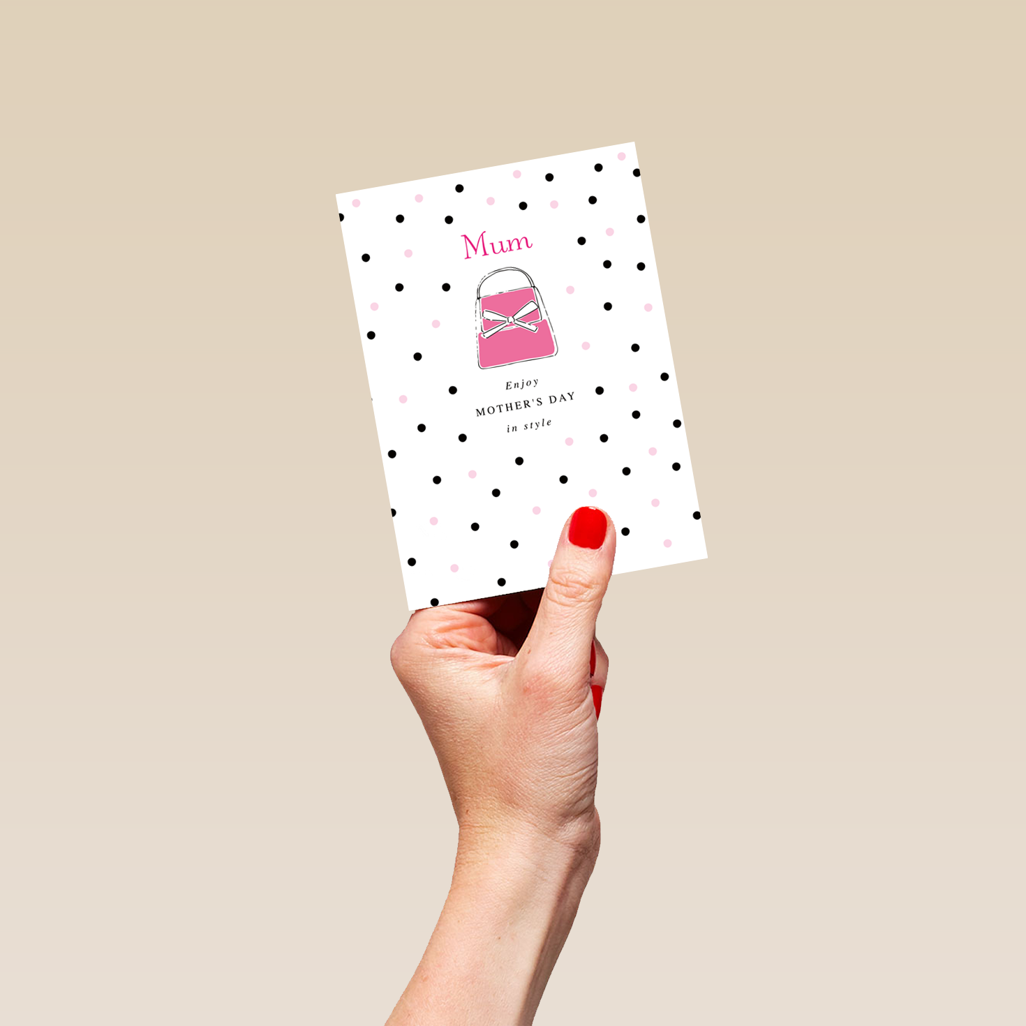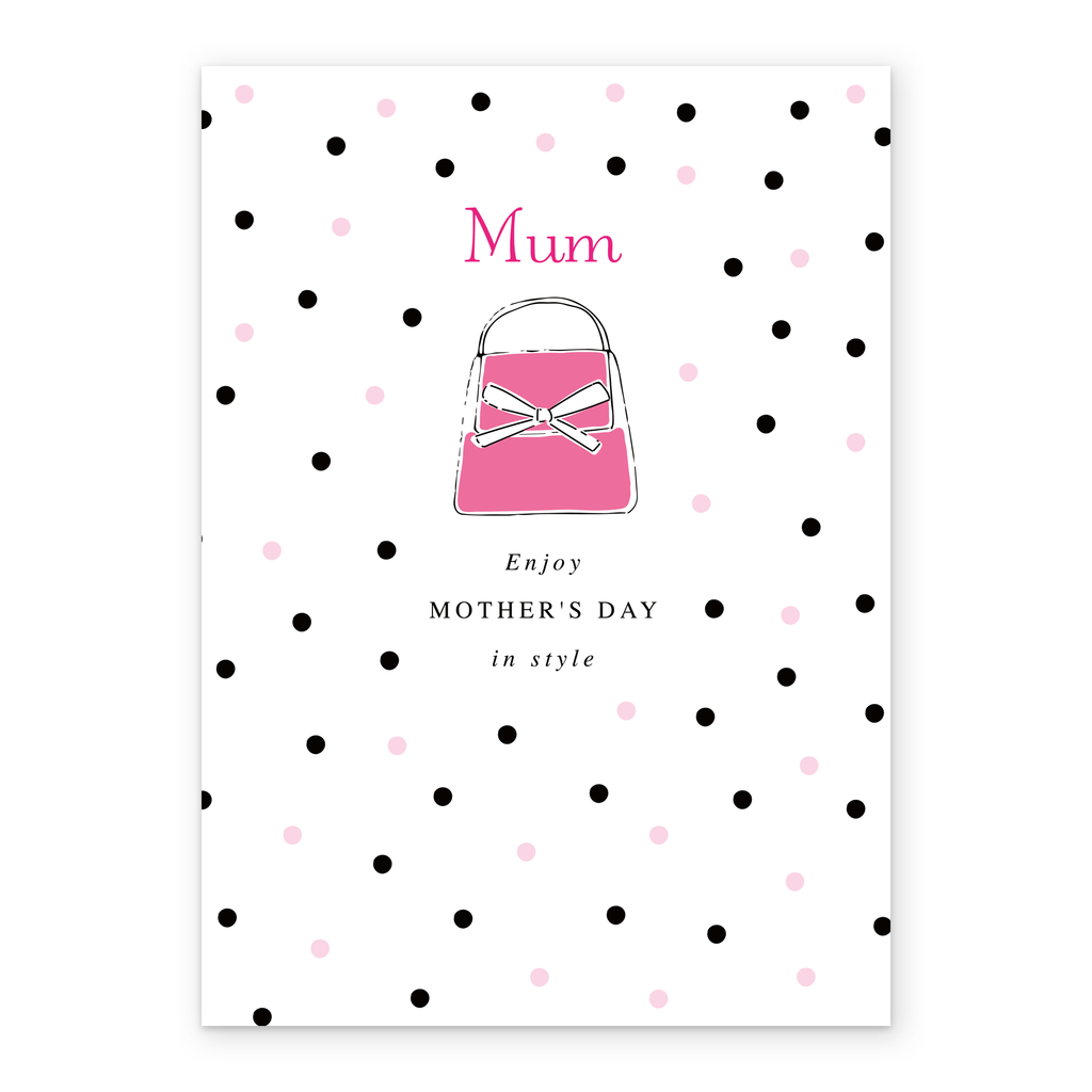 Printed on premium-quality board, this card features an illustrated pink handbag, and light pink and black polka dots on a white background, with the message 'Enjoy Mother's Day in style', space to personalise a name, and comes complete with a co-ordinating white envelope.