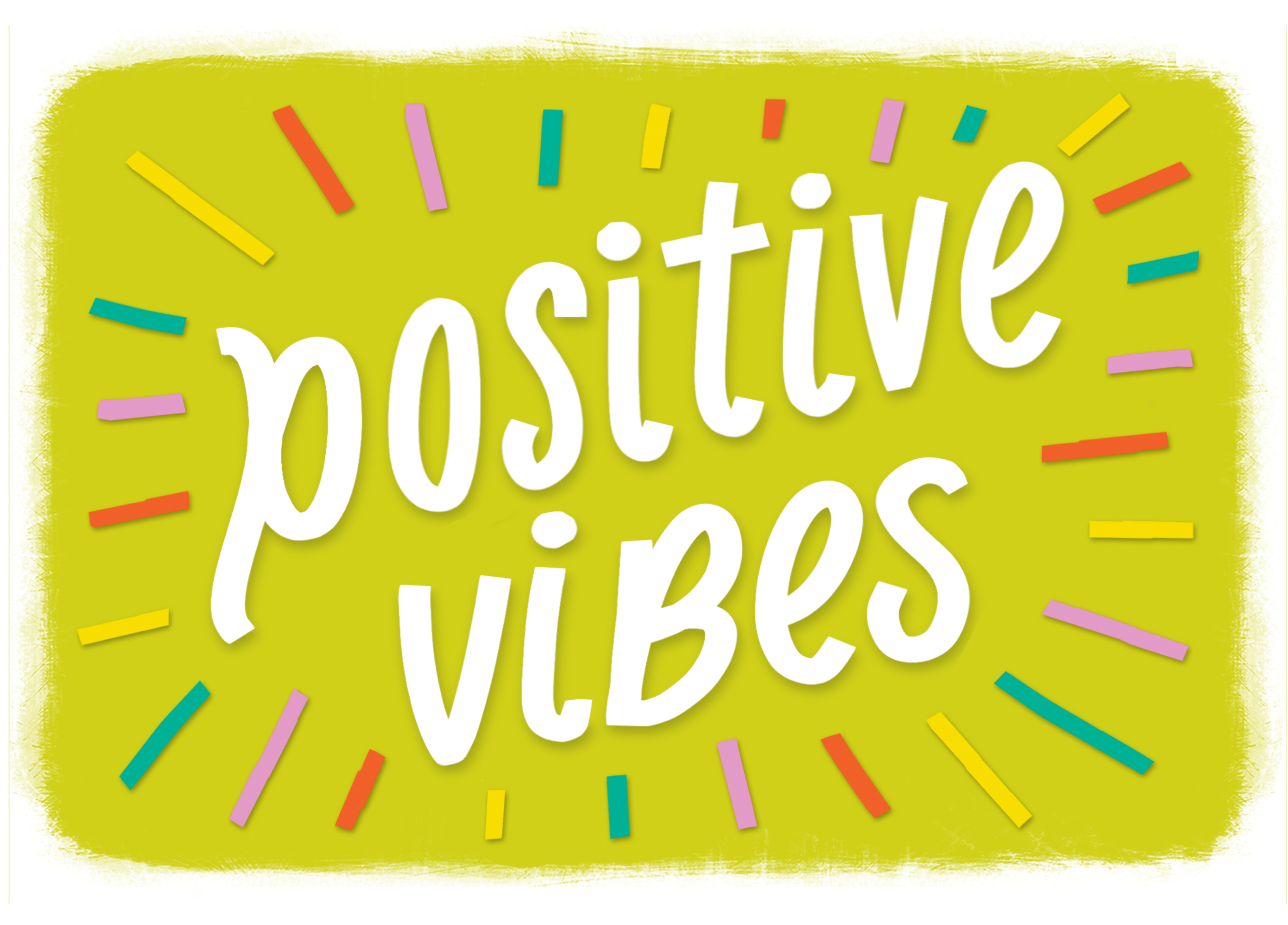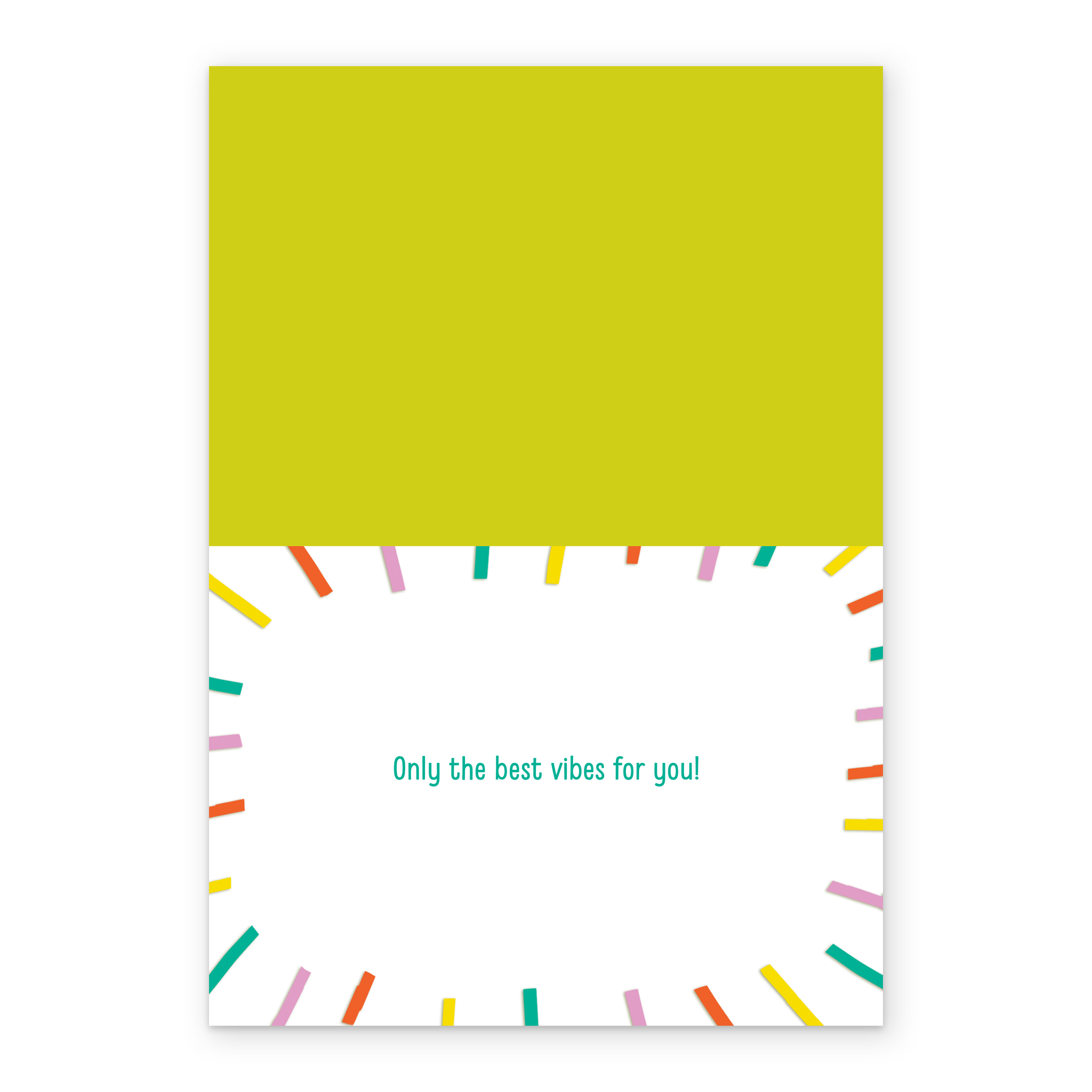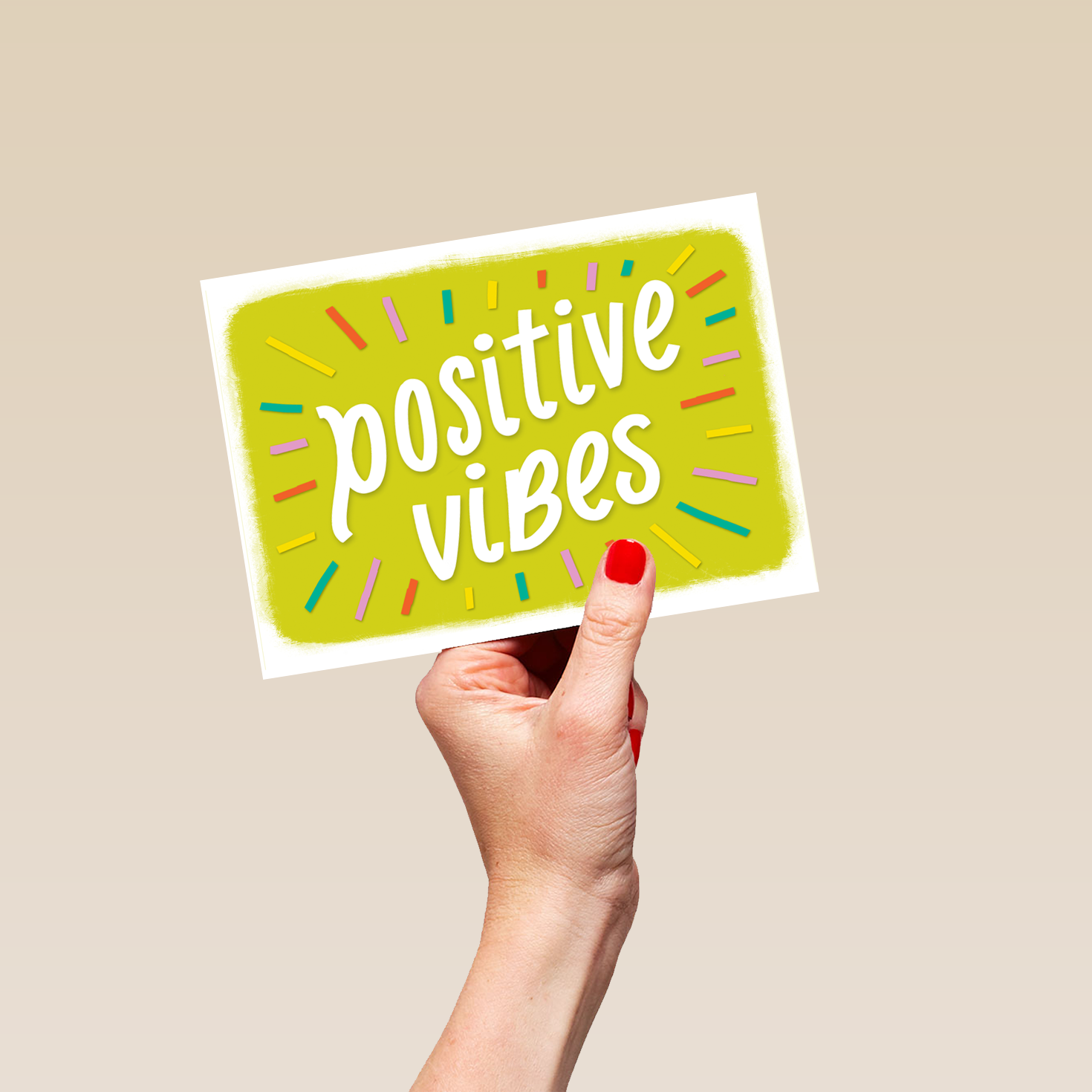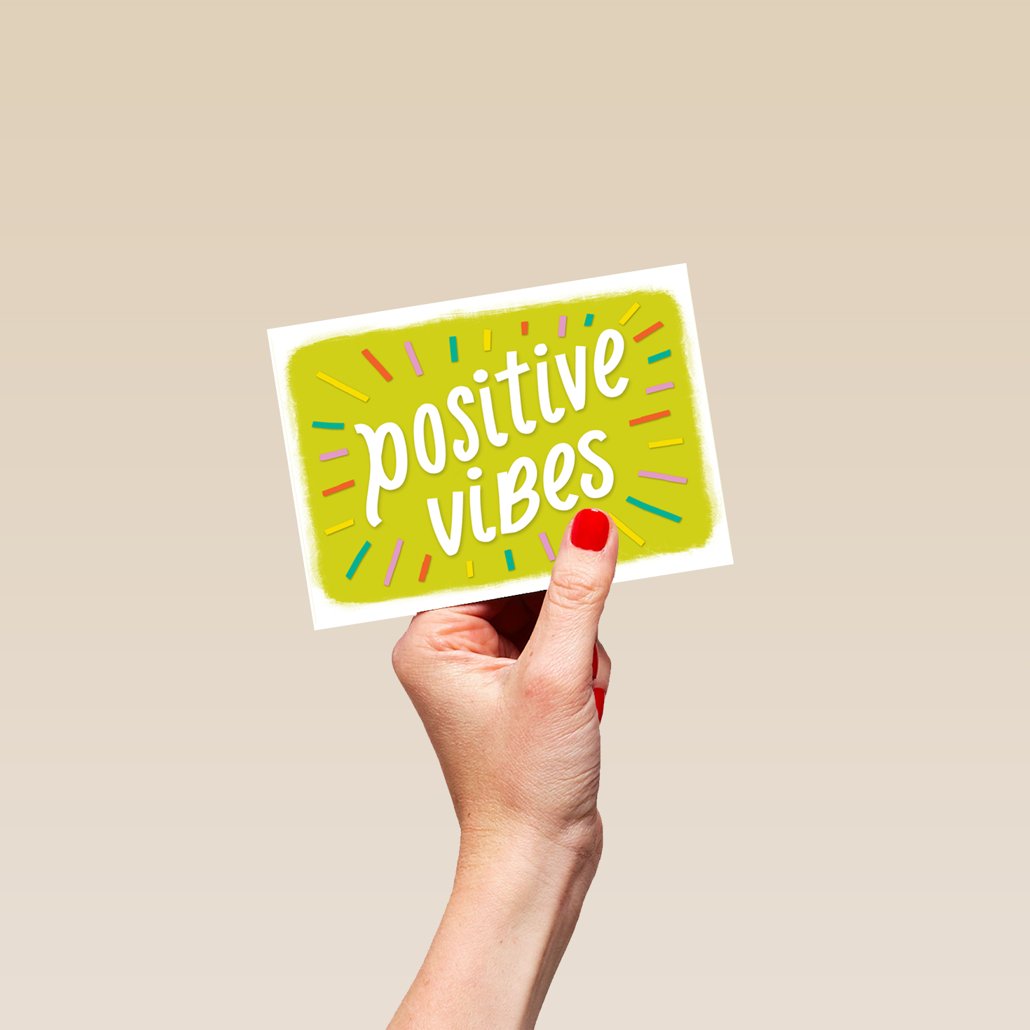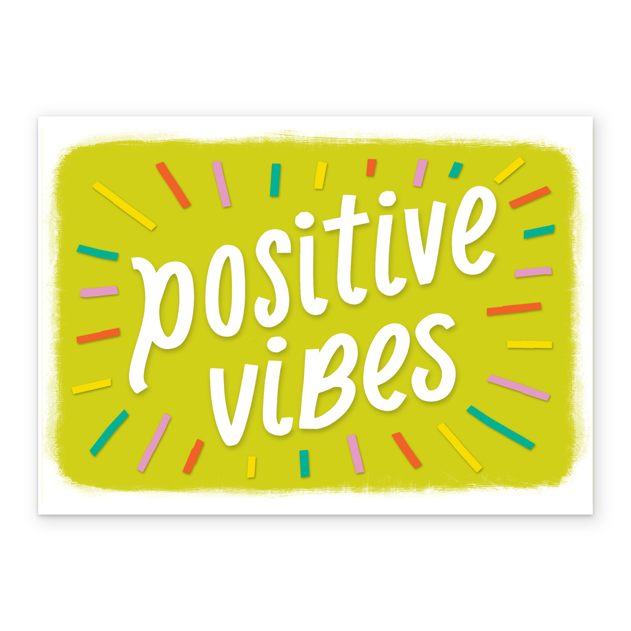 Printed on premium-quality board, this card features a green background with colourful lines, with the message 'Positive Vibes', and comes complete with a co-ordinating white envelope.