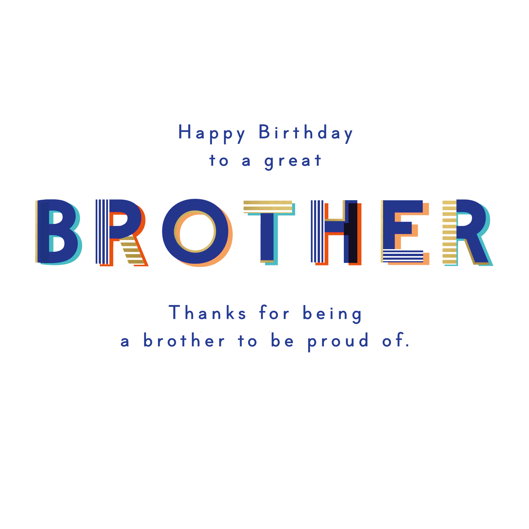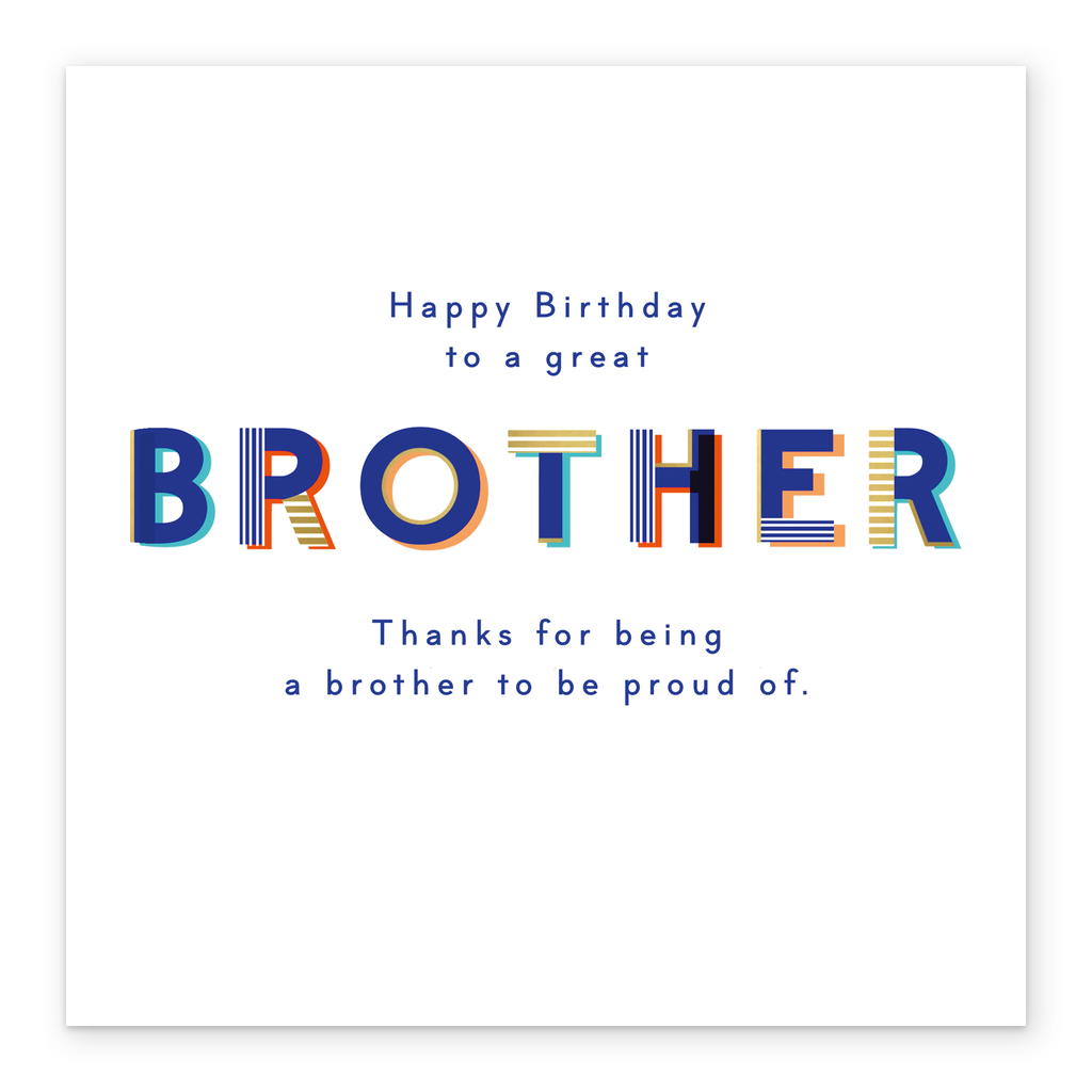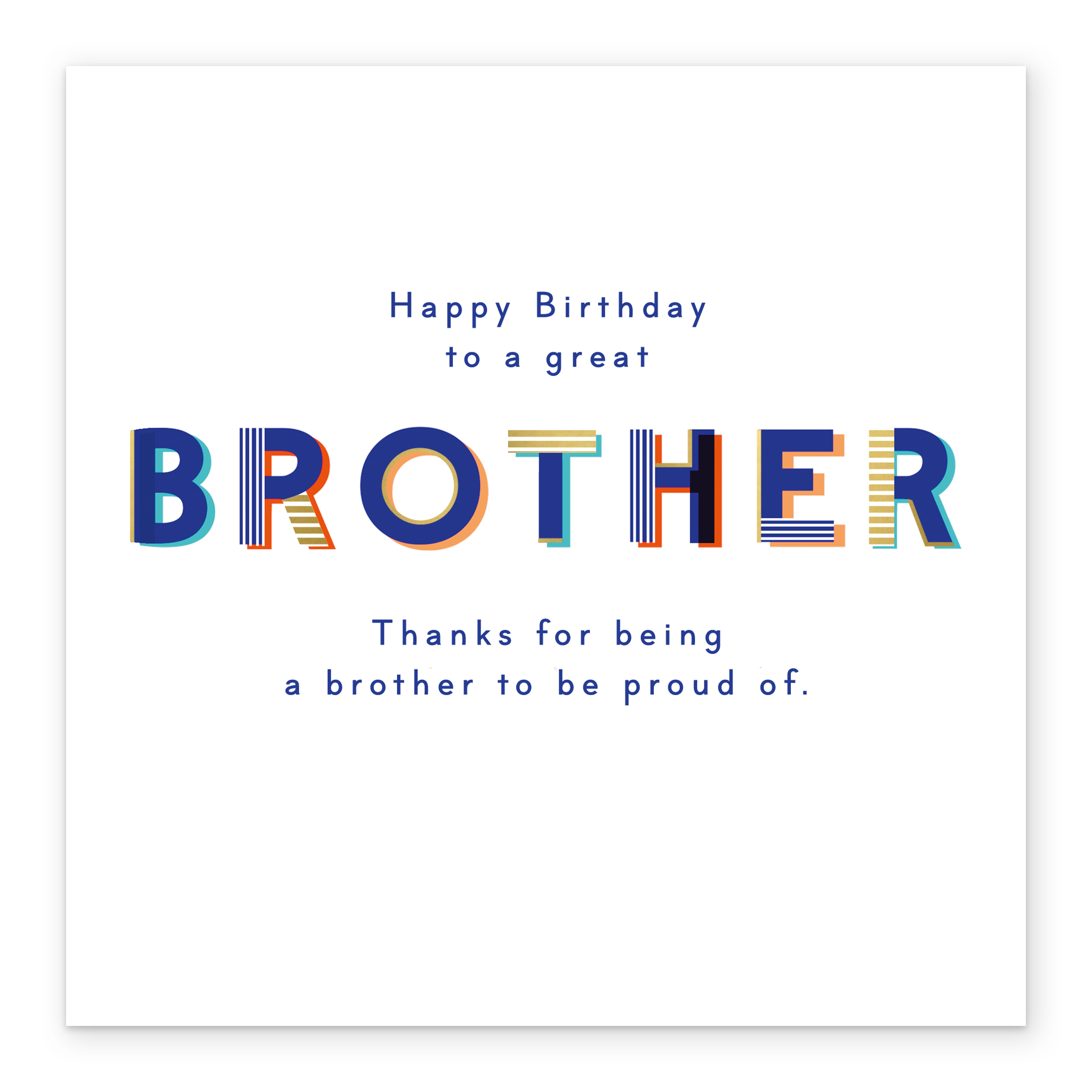 Printed on premium-quality board, this card features fun typography design, with the message 'Happy Birthday To A Great Brother Thanks For Being A Brother To Be Proud Of.', and comes complete with a co-ordinating white envelope.