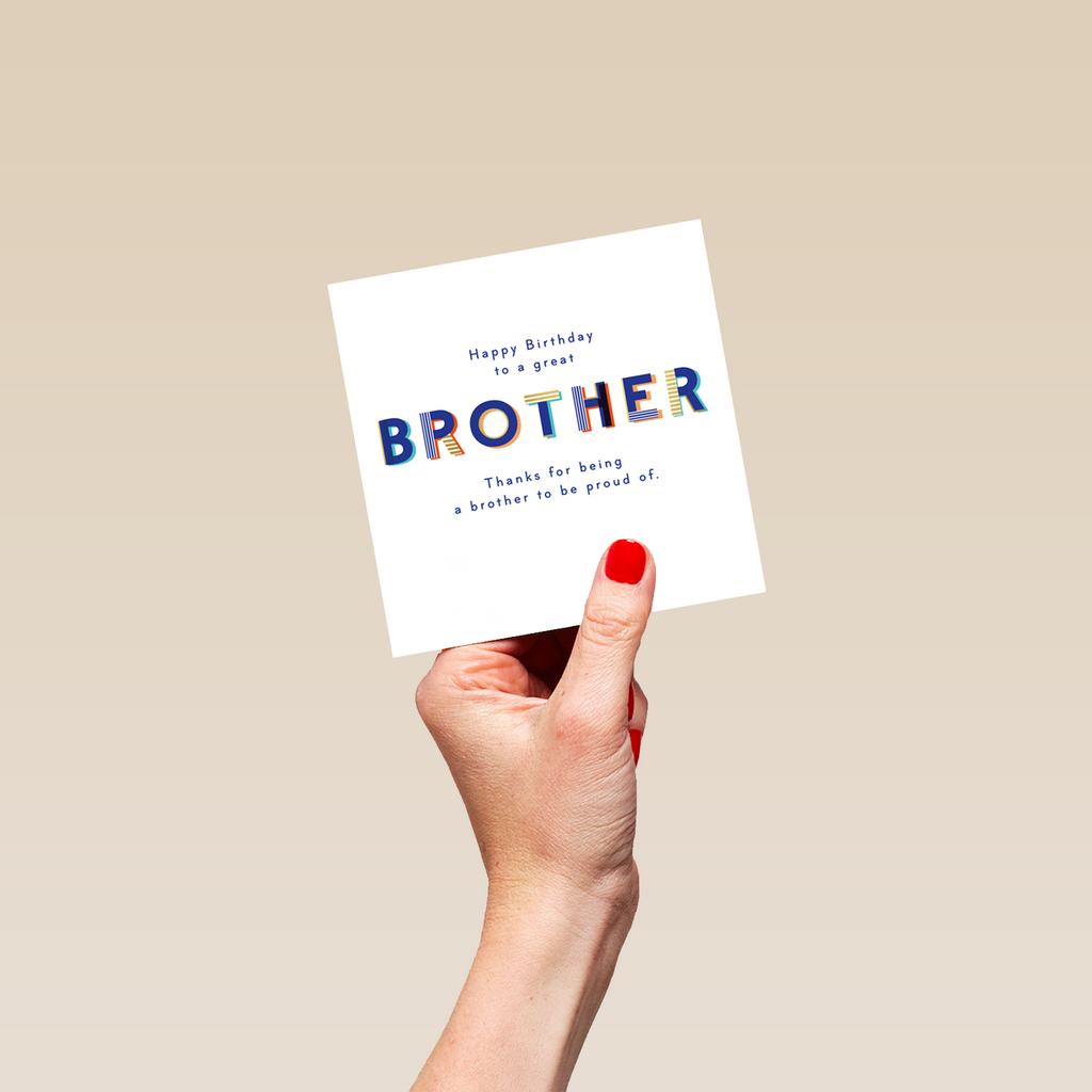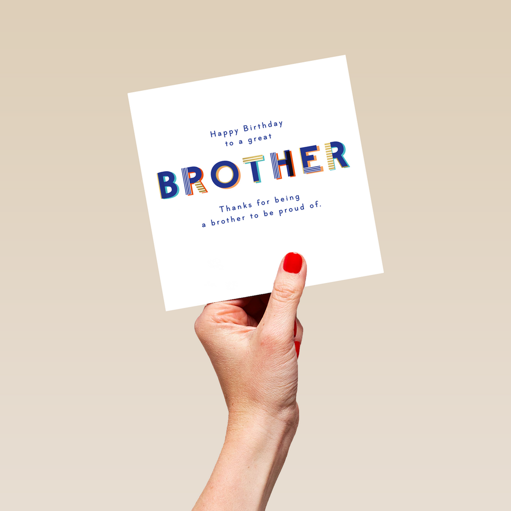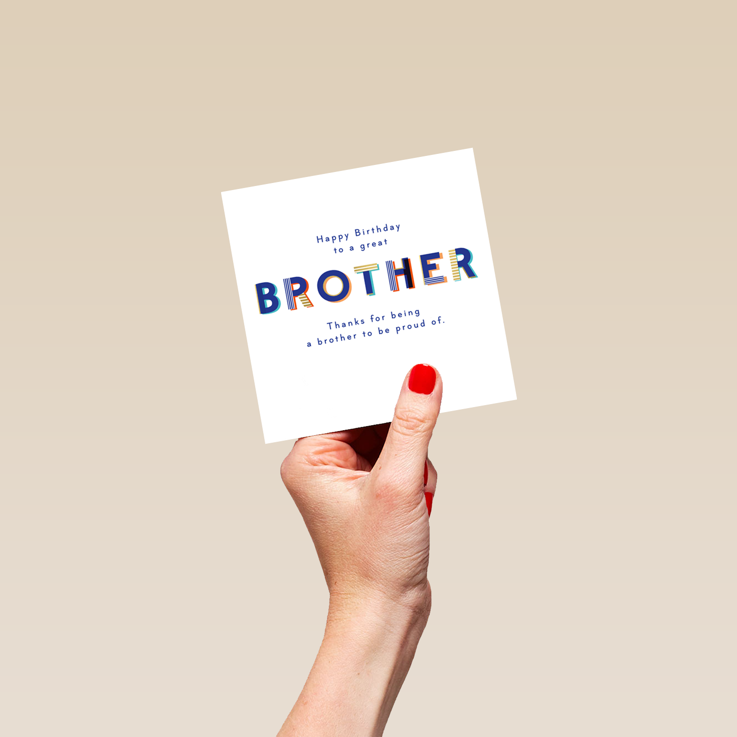 Printed on premium-quality board, this card features fun typography design, with the message 'Happy Birthday To A Great Brother Thanks For Being A Brother To Be Proud Of.', and comes complete with a co-ordinating white envelope.