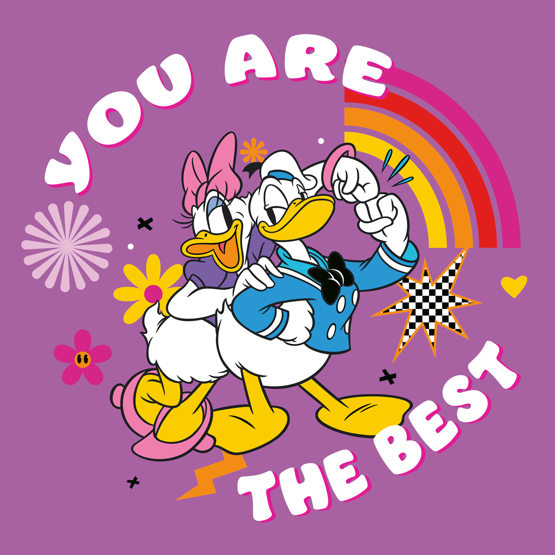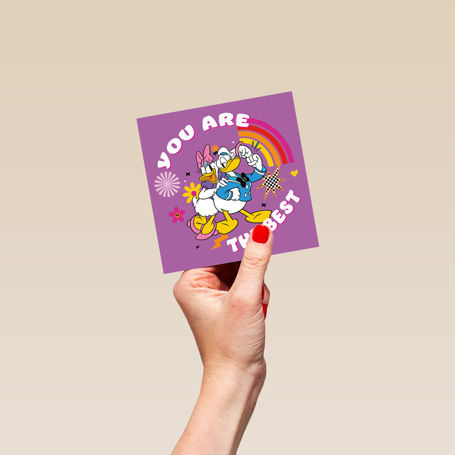 Printed on premium-quality board, this card features Donald Duck and Daisy Duck with flowers and rainbows in the background, with the message 'You are the best', and comes complete with a co-ordinating white envelope.