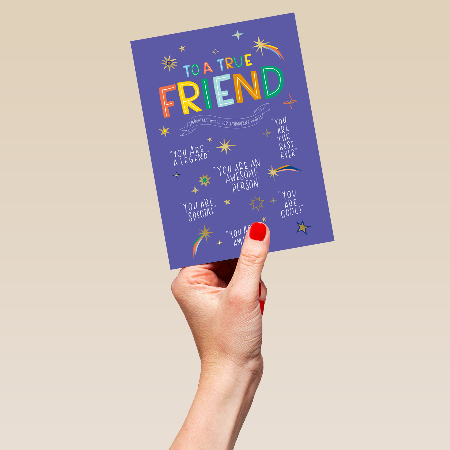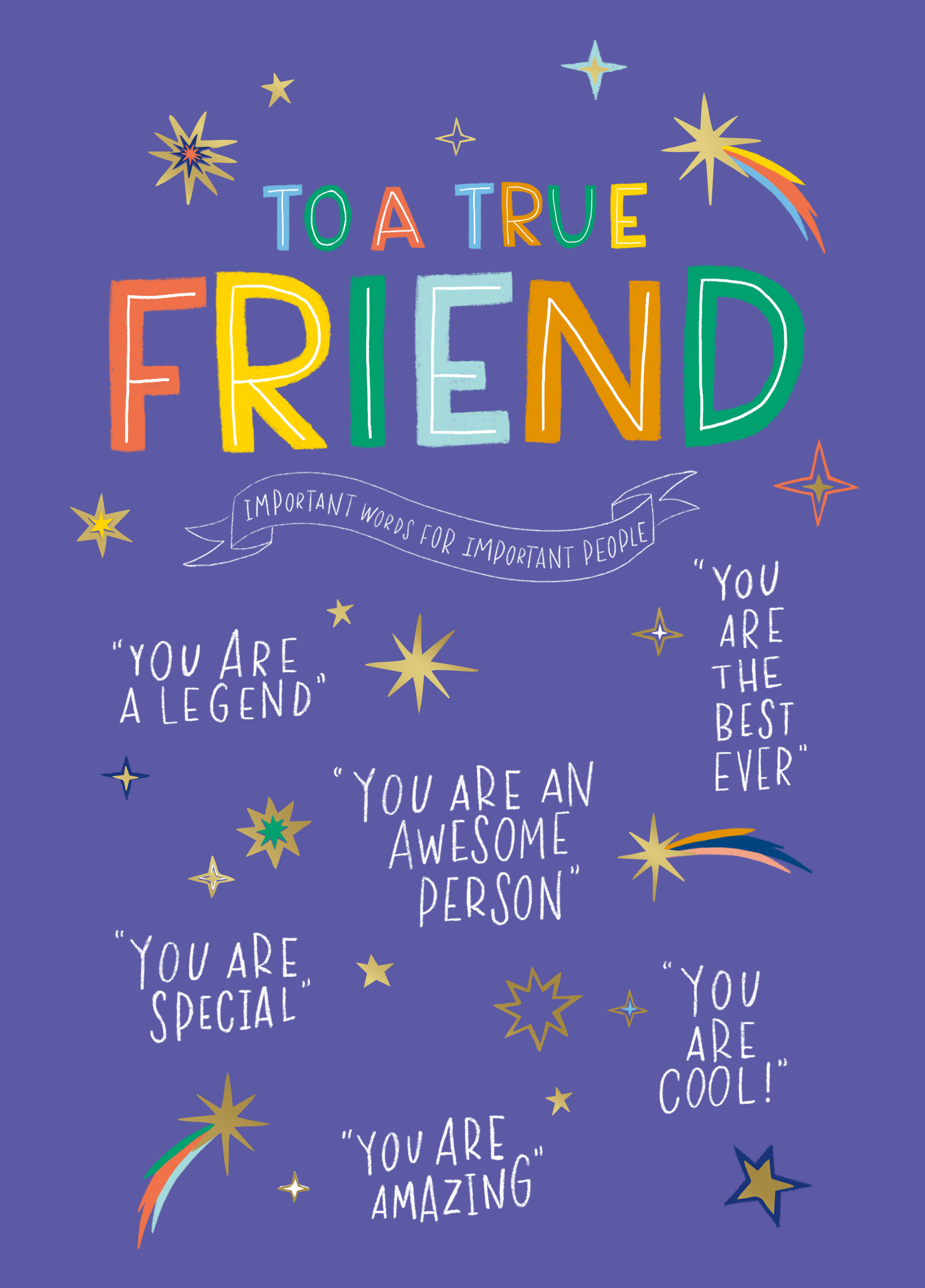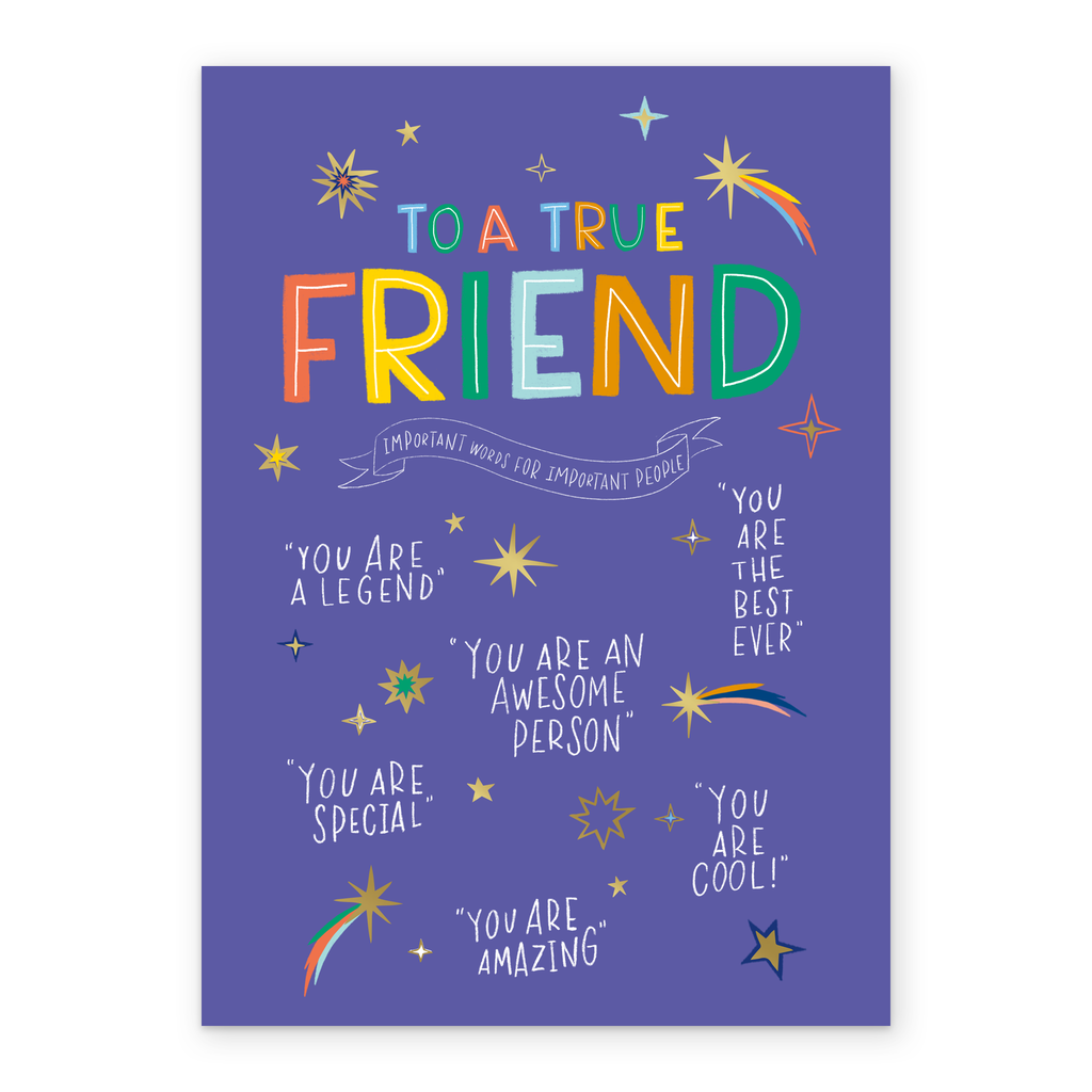 Printed on premium-quality board, this card features a purple background with stars, with the message 'To A True Friend Important words for important people. 'You are a legend' 'You are an awesome person' 'You are special' 'You are amazing' 'You are cool', and comes complete with a co-ordinating white envelope.