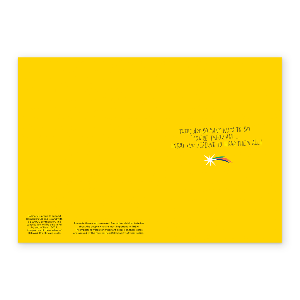 To create these cards we asked Barnardo's children to tell us about the people who are most important to them. The important words for important people on these cards are inspired by the moving, heartfelt honesty of their replies.