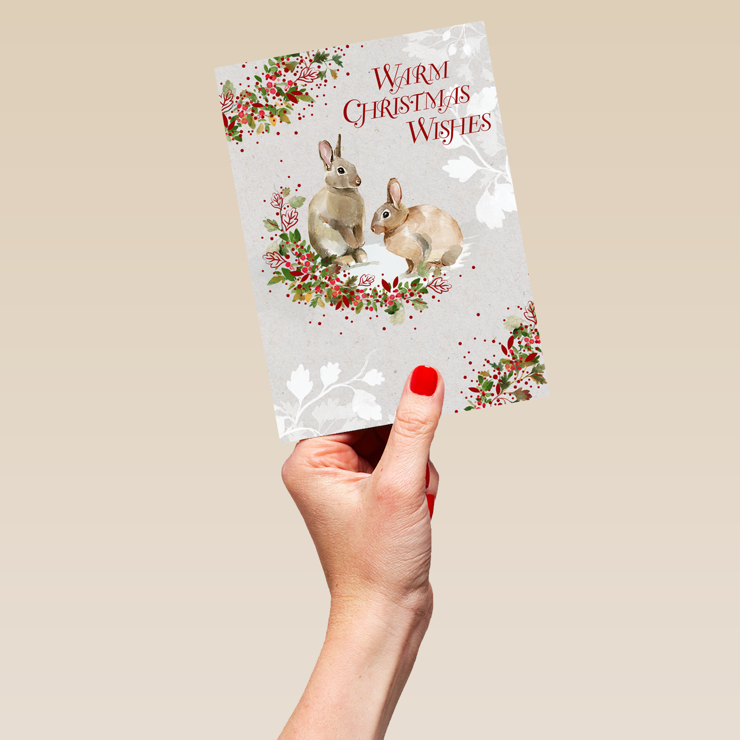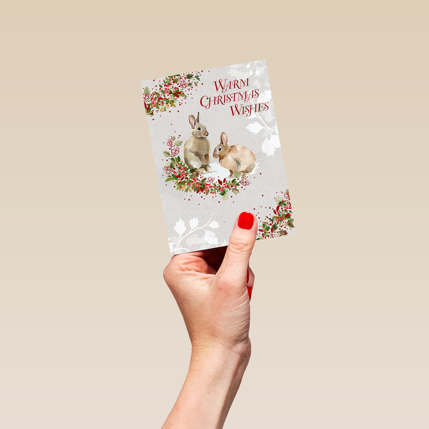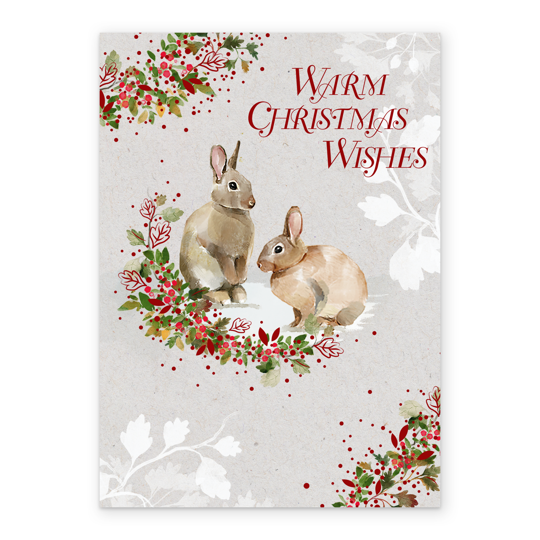Printed on premium-quality board, this card features a seasonal wreath with a couple of rabbits illustration, and the message 'Warm Christmas Wishes'.