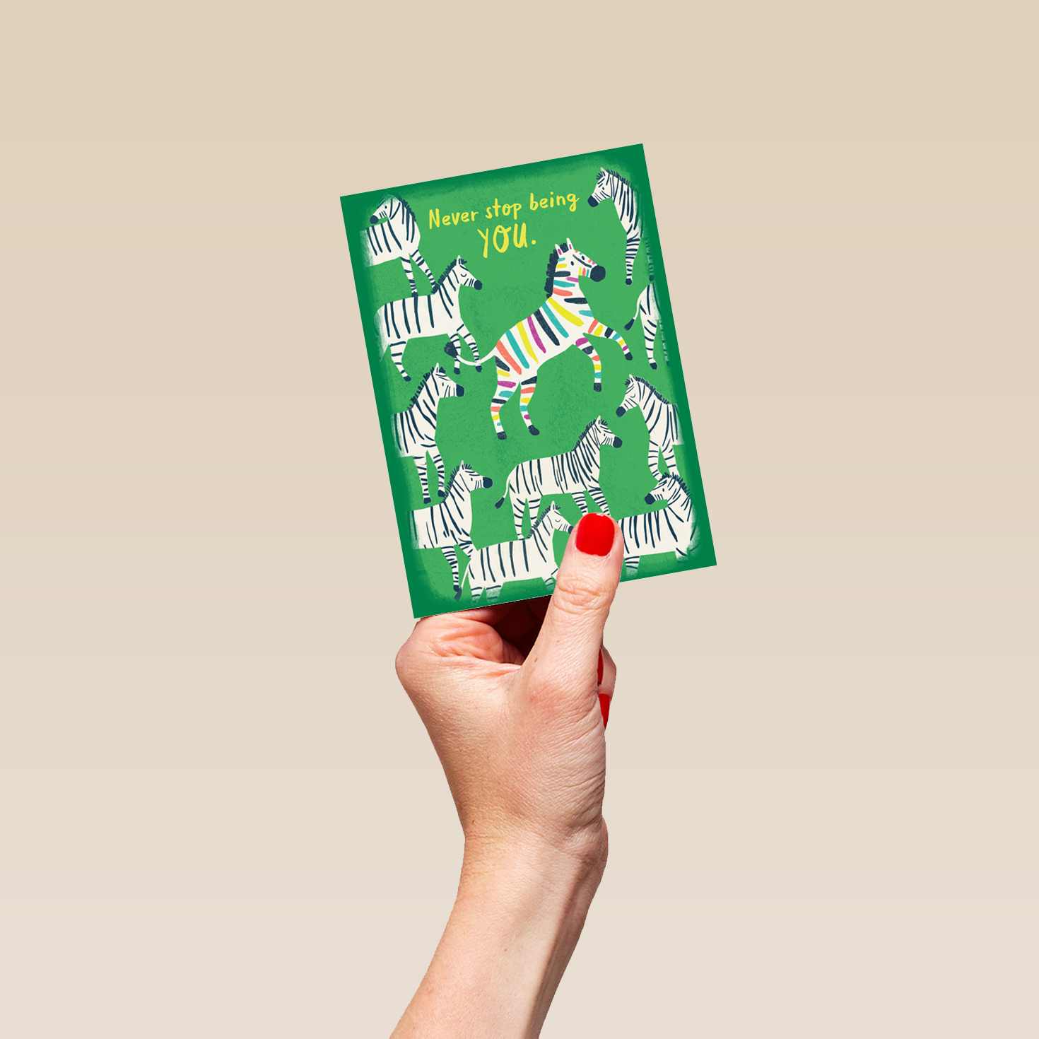 Printed on premium-quality board, this card features a green background with zebras and one colourful zebra in the middle, with the message 'Never stop being you.', and comes complete with a co-ordinating white envelope.