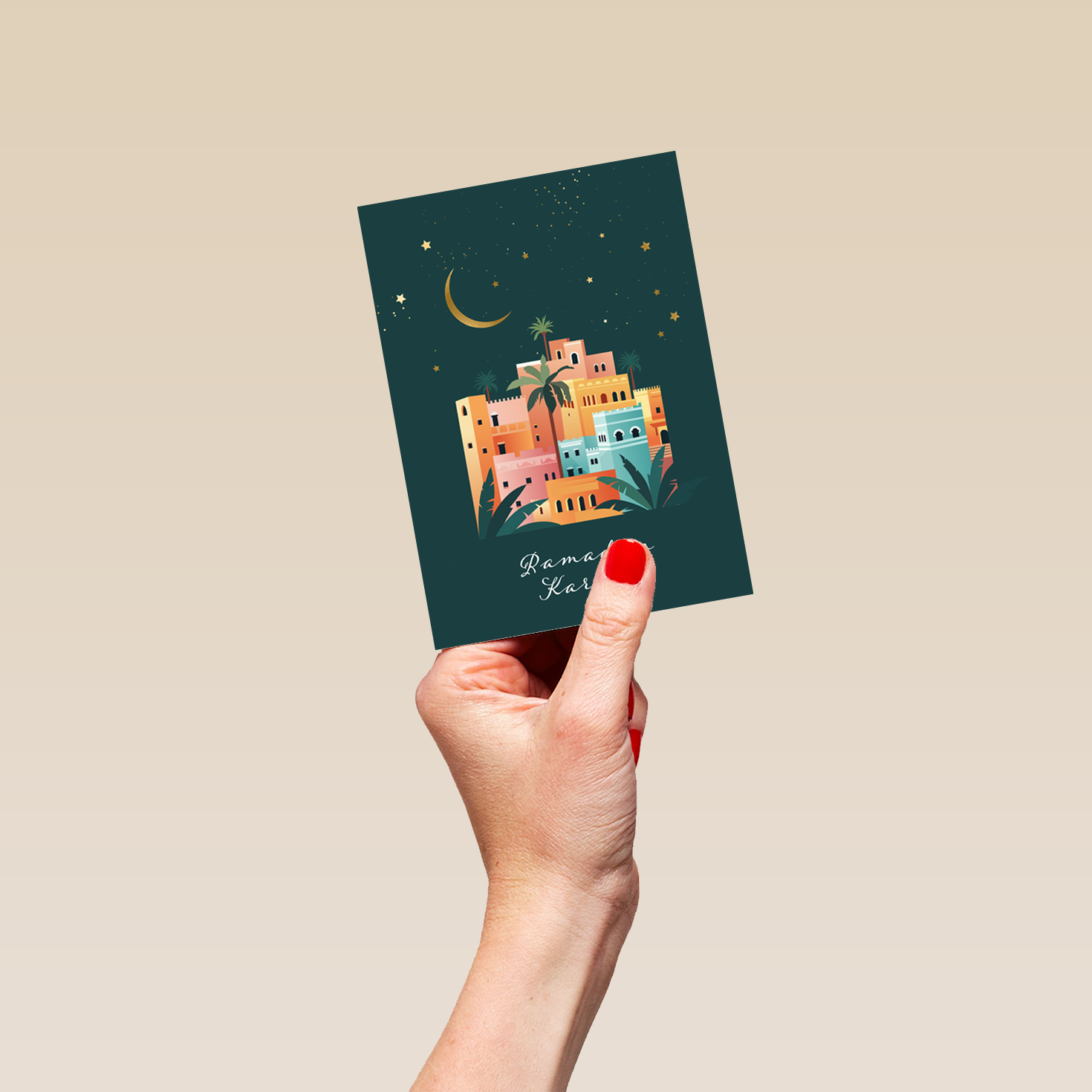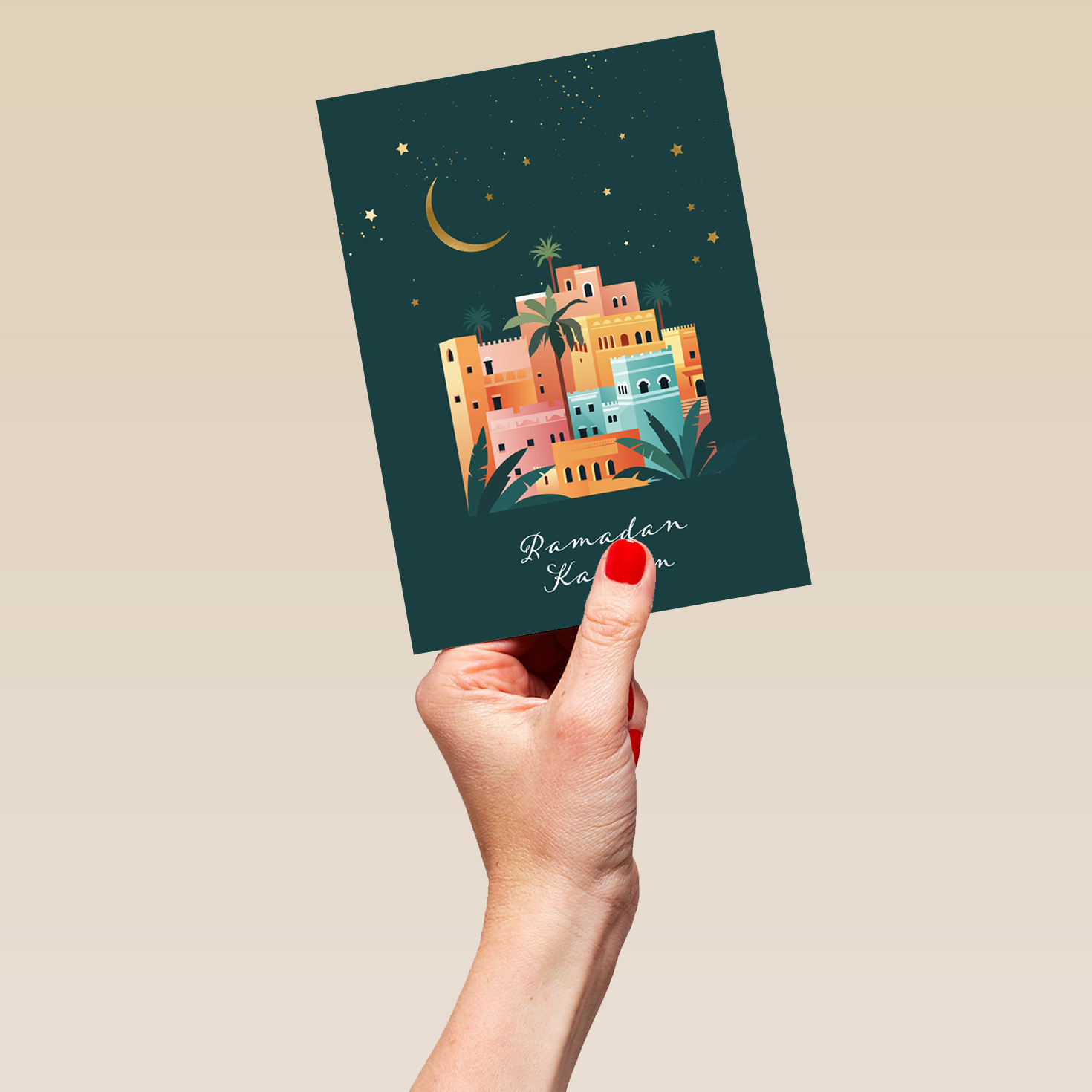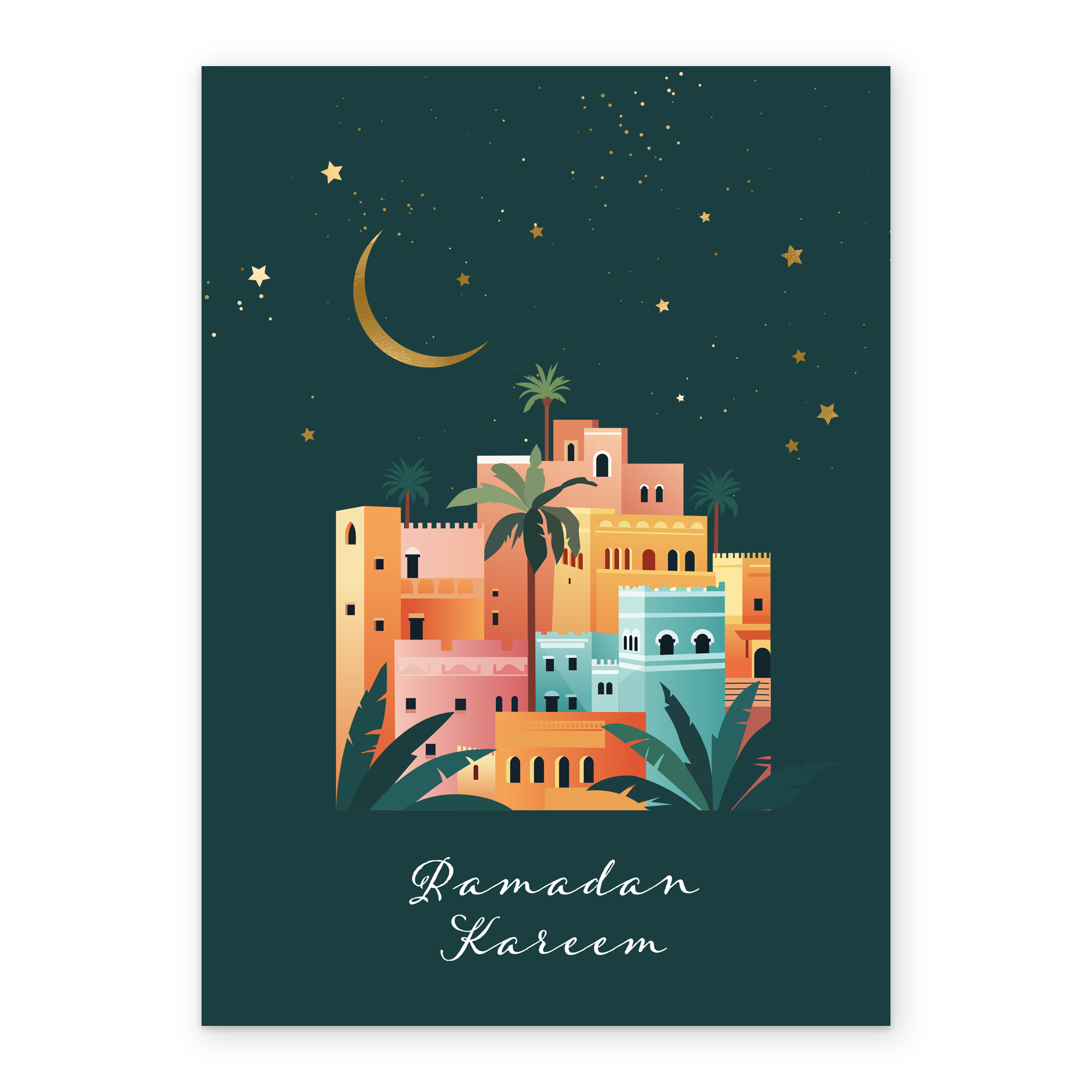 Printed on premium-quality board, this card features an illustration of colourful buildings beneath a rising crescent moon in a starry sky , with the message 'Ramadan Kareem', and comes complete with a co-ordinating white envelope.