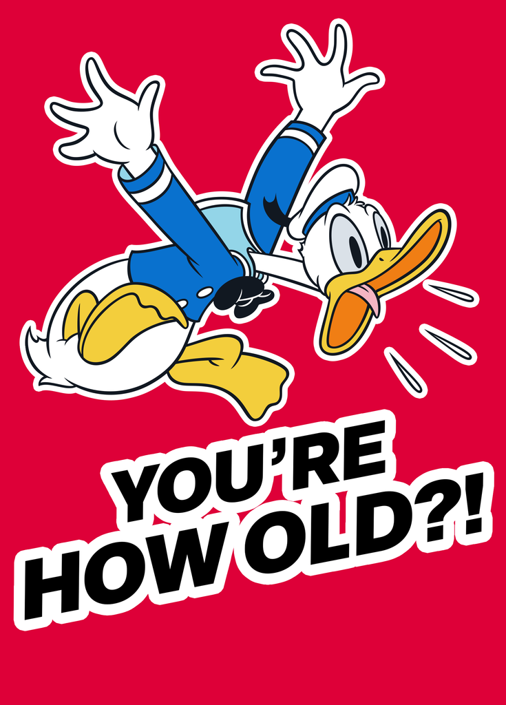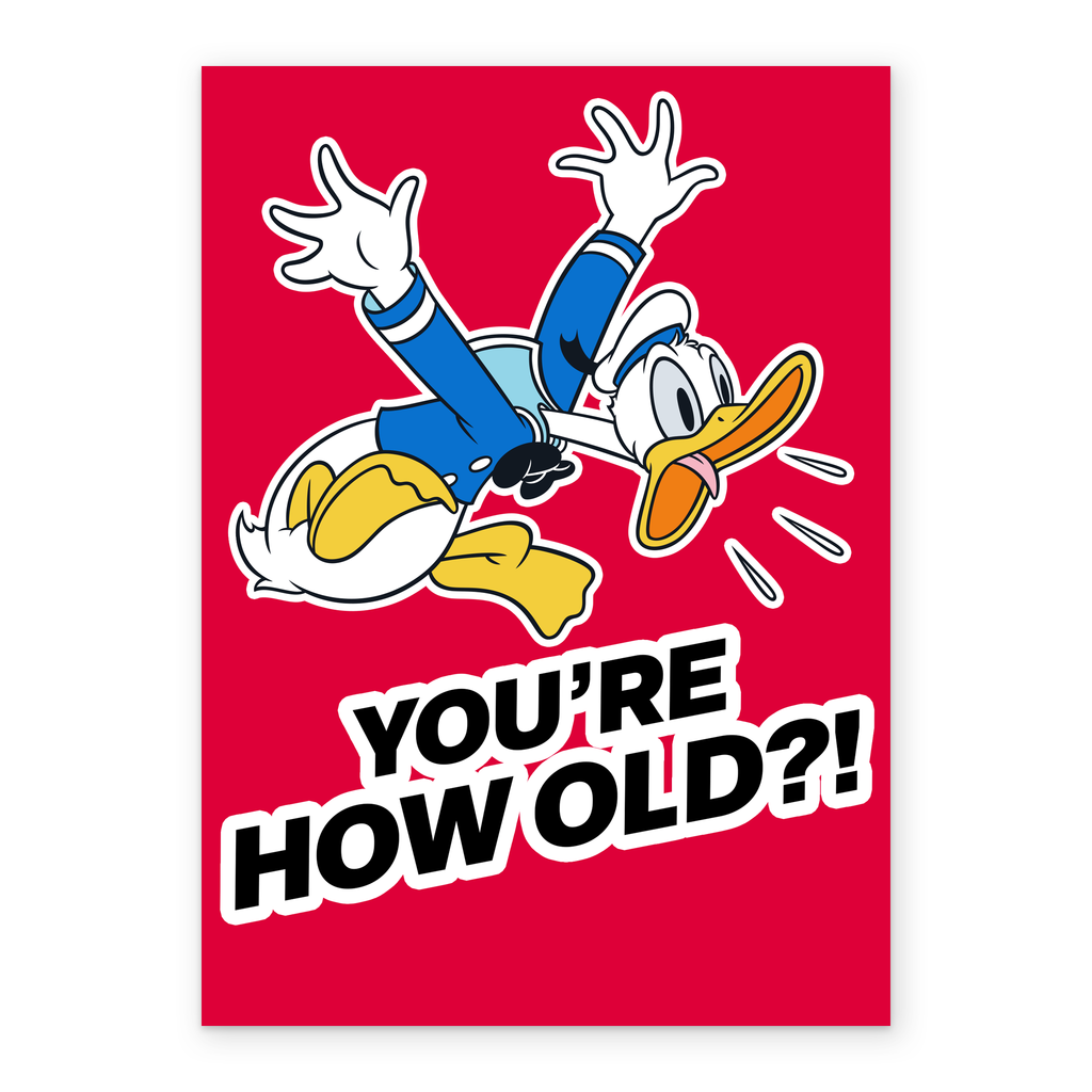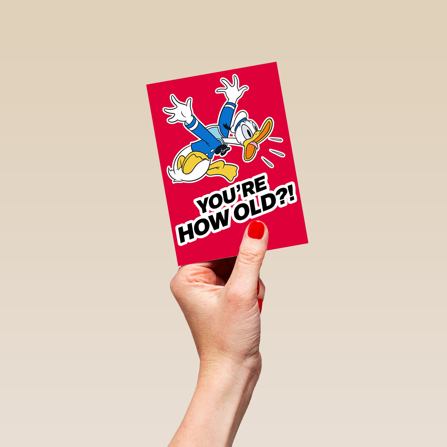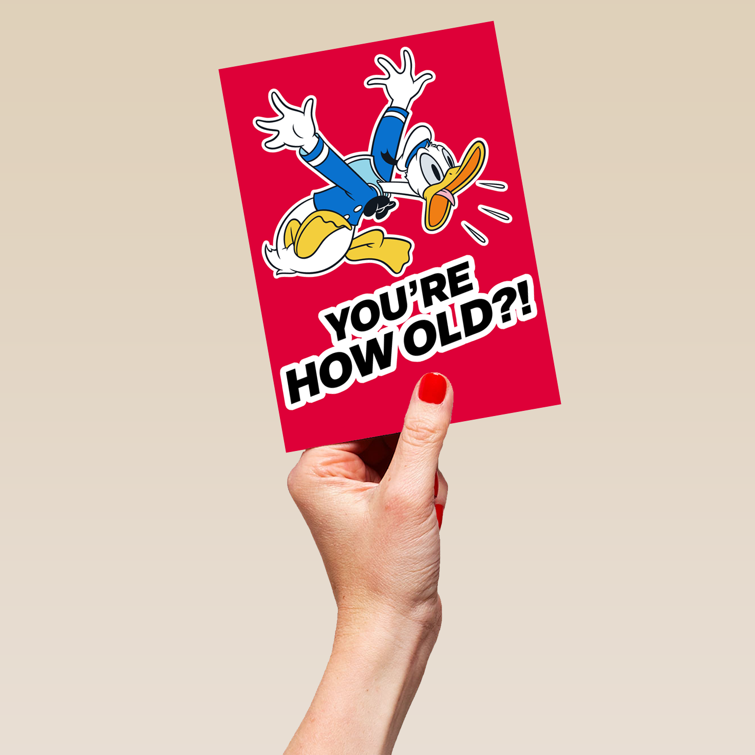 Printed on premium-quality board, this card features Donald Duck looking surprised, with the message 'You're how old?!', and comes complete with a co-ordinating white envelope.