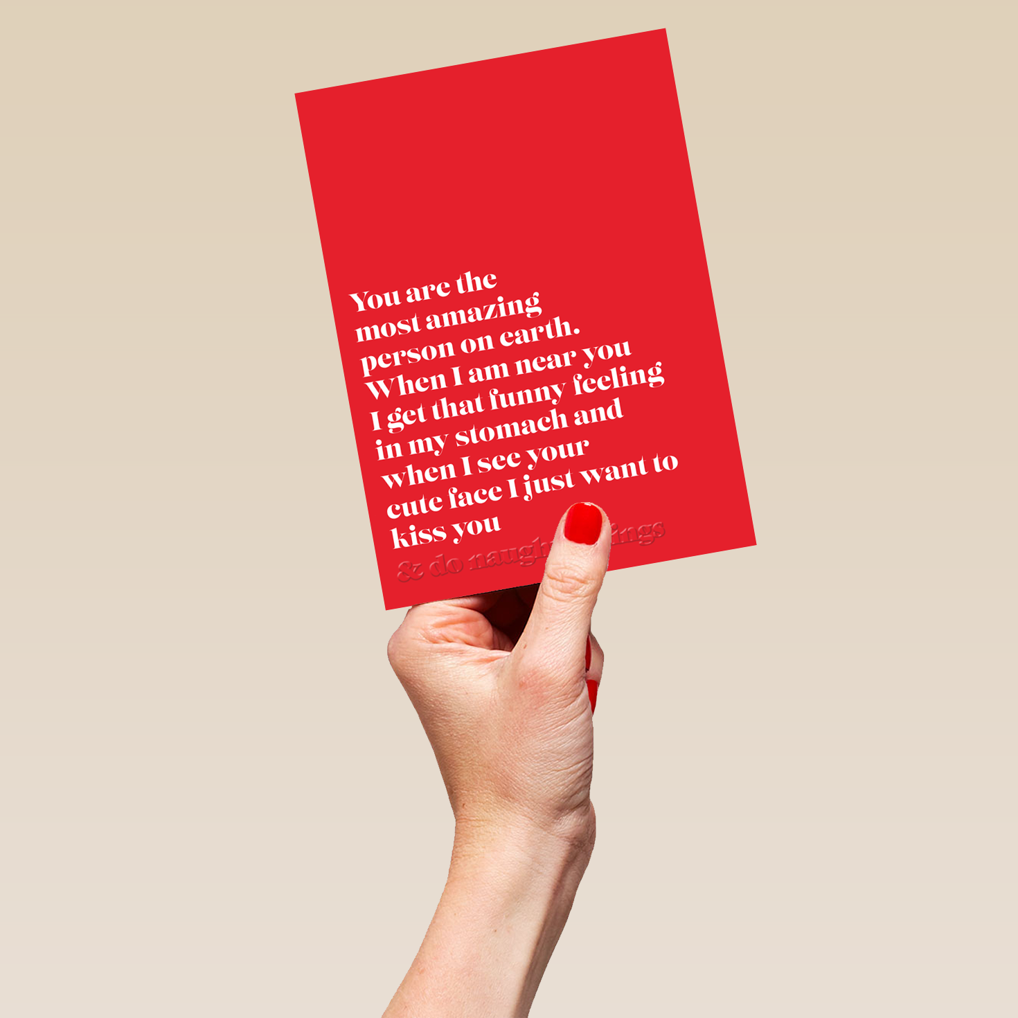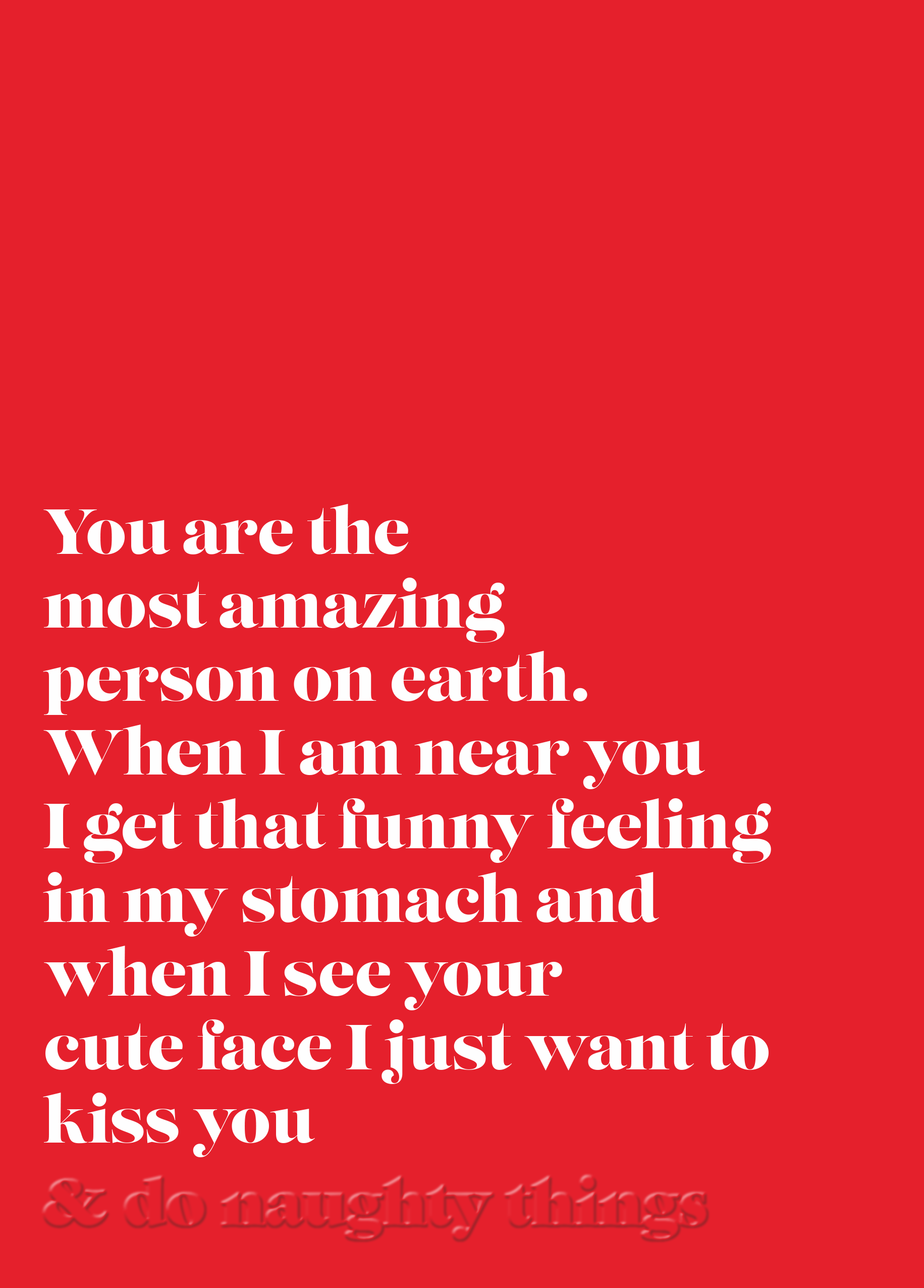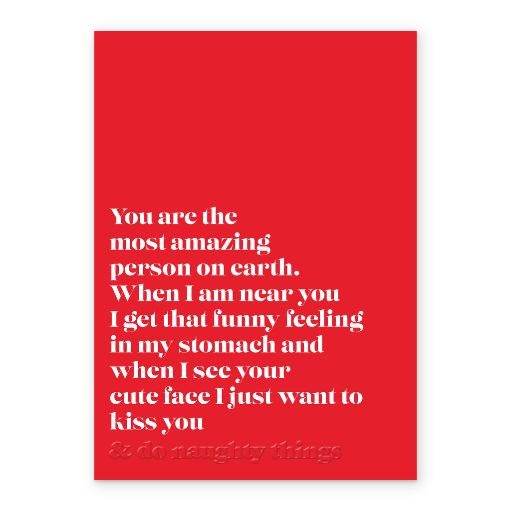 Printed on premium-quality board, this card features a funny and heartfelt verse, with the message 'You are the most amazing person on earth. When I am near you I get that funny feeling in my stomach and when I see your cute face I just want to kiss you & do naughty things', and comes complete with a co-ordinating white envelope.